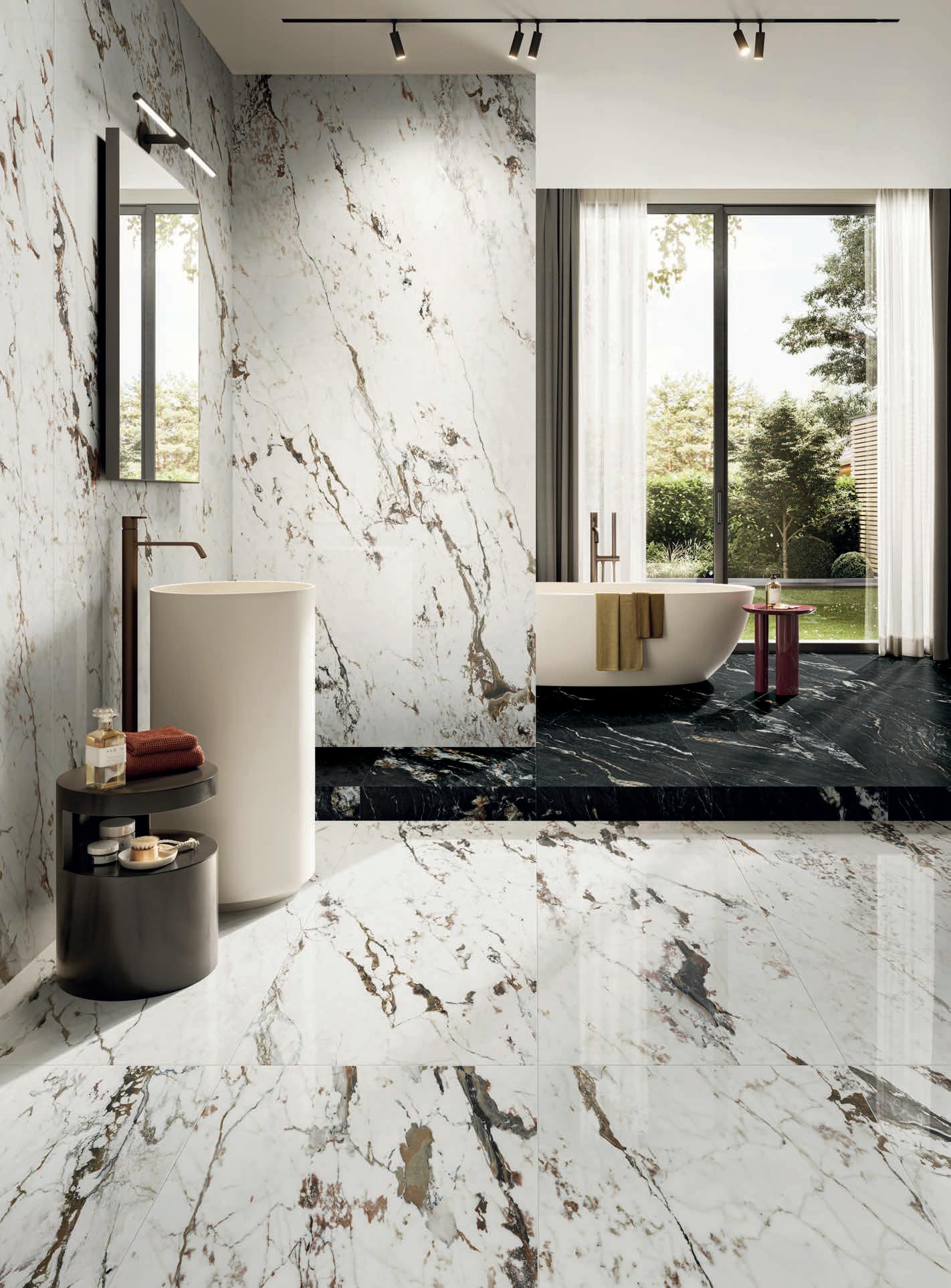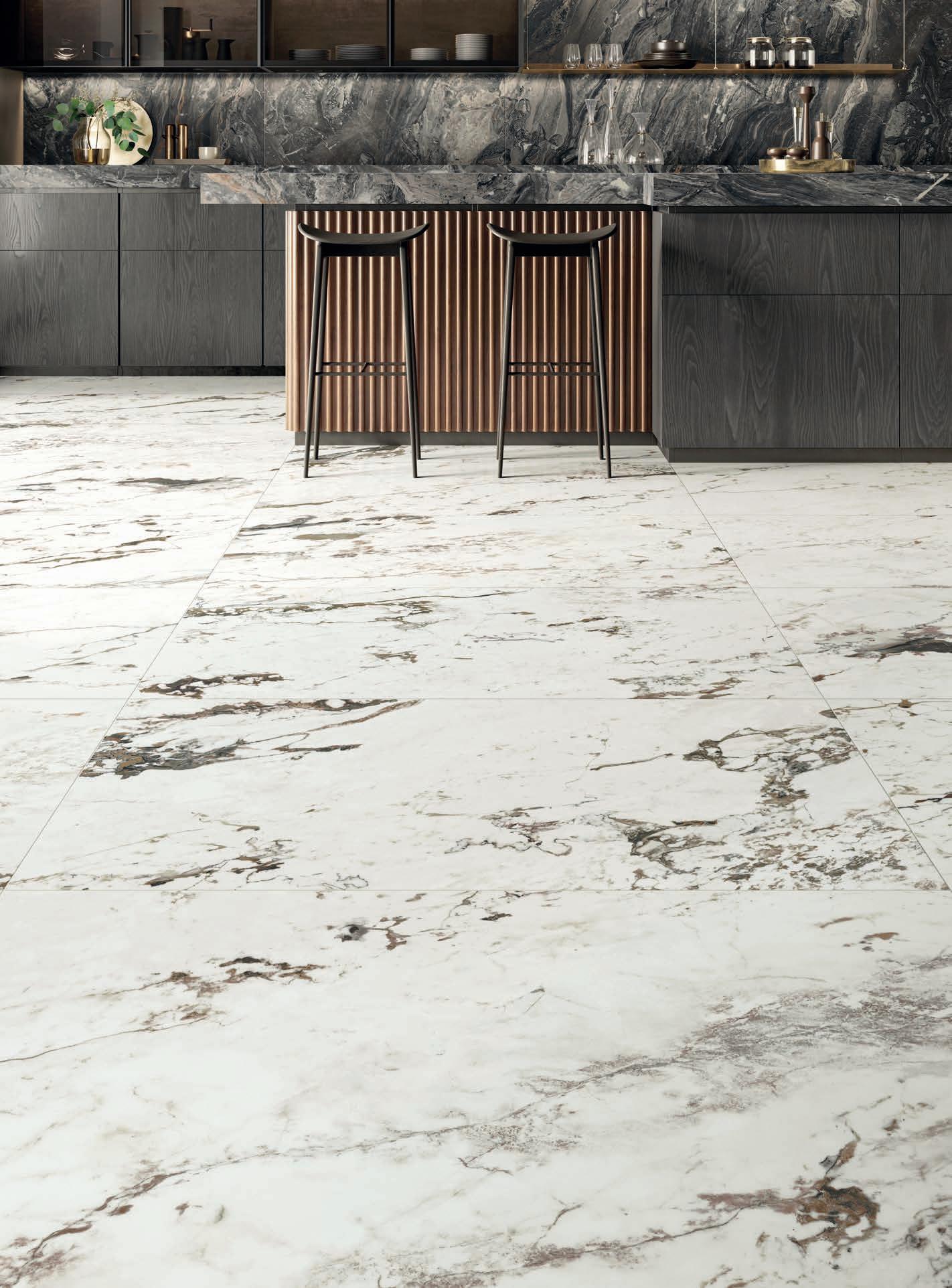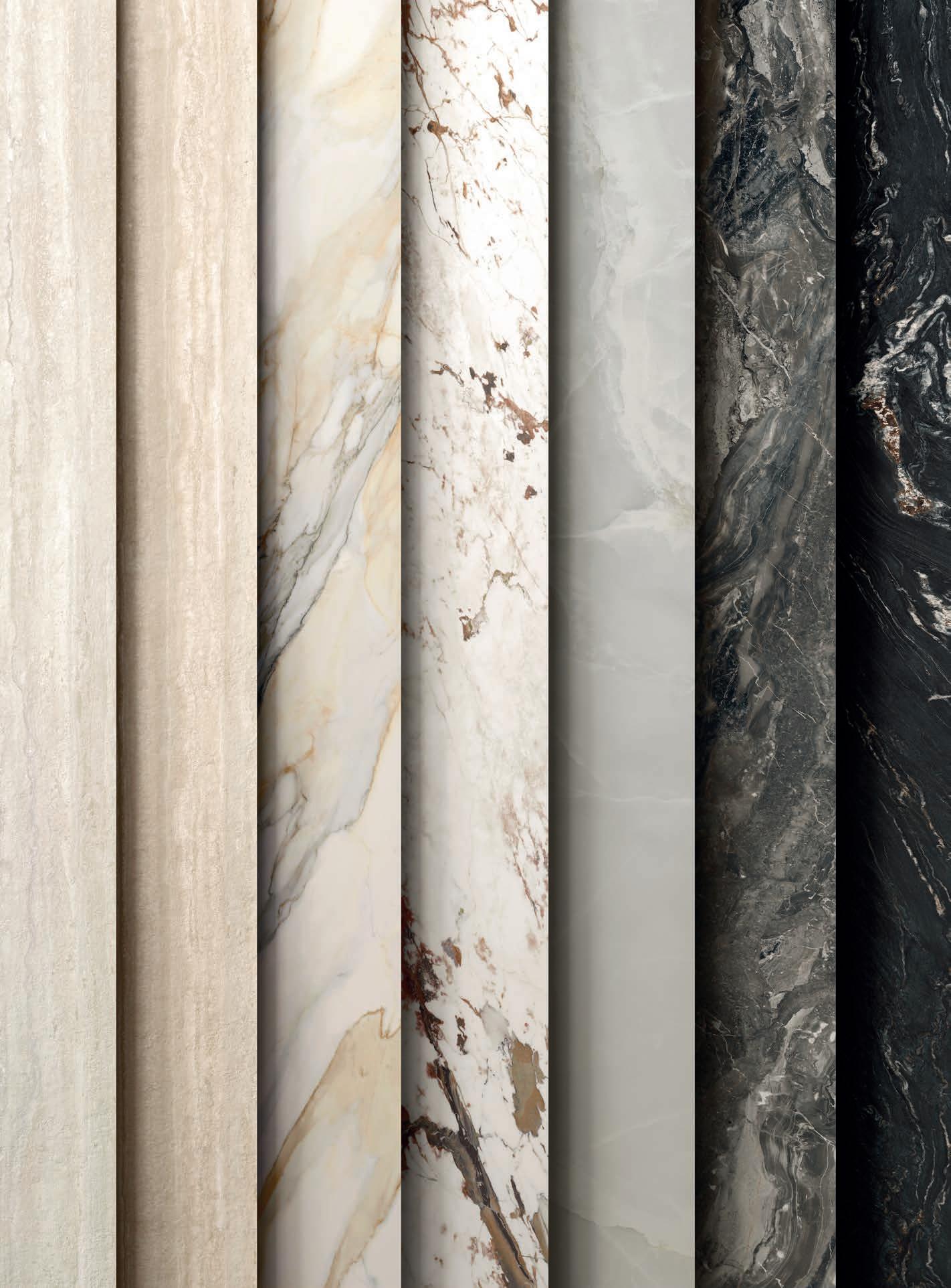 Sette marmi ceramici che, grazie a evolute tecnologie decorative digitali, restituiscono con assoluto realismo il fascino dei pregiati modelli naturali, riconoscibili per i grafismi mossi ma equilibrati.
