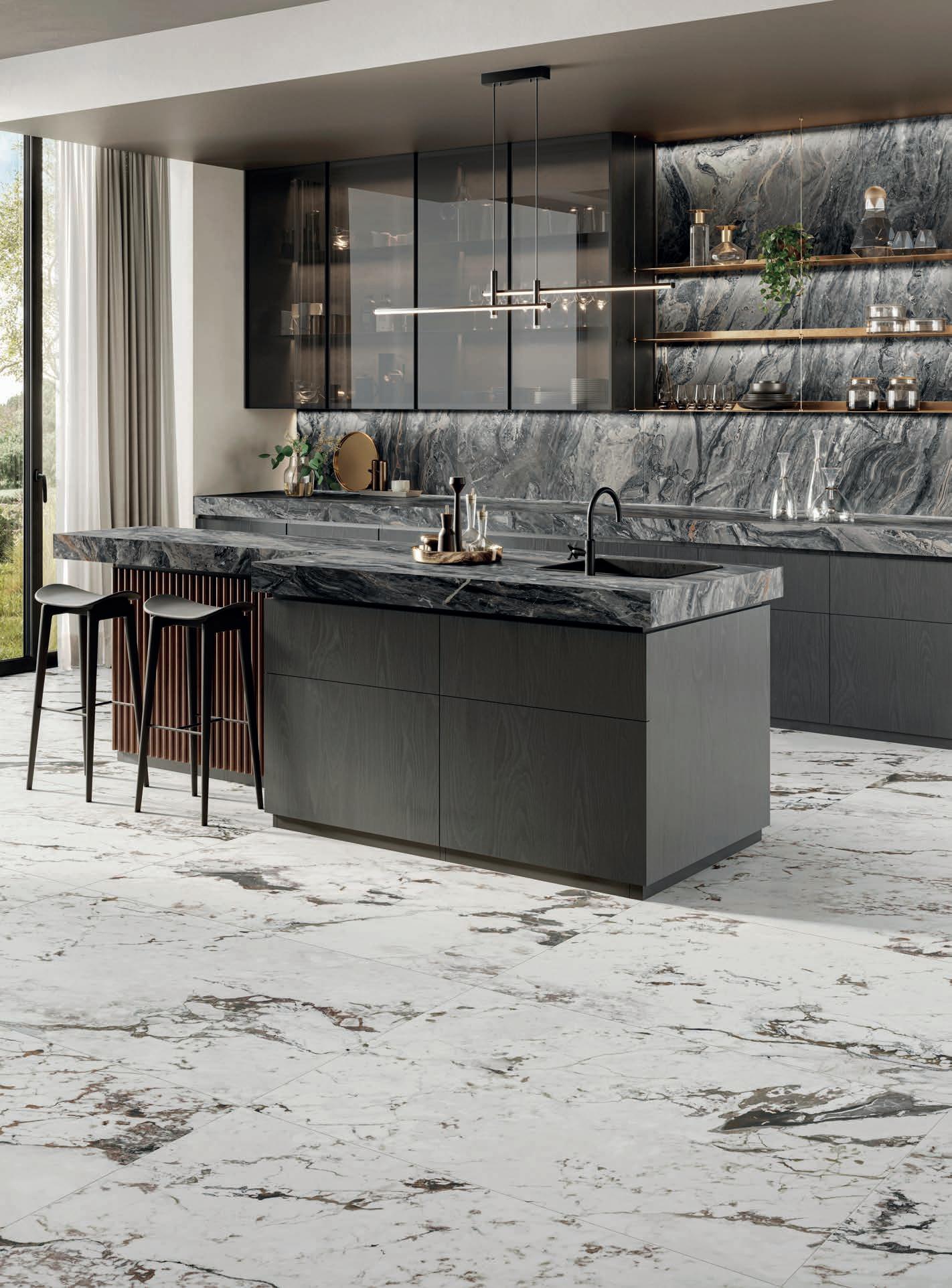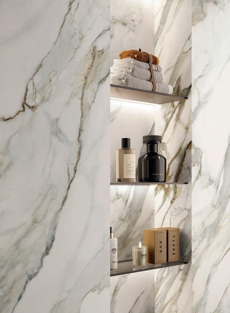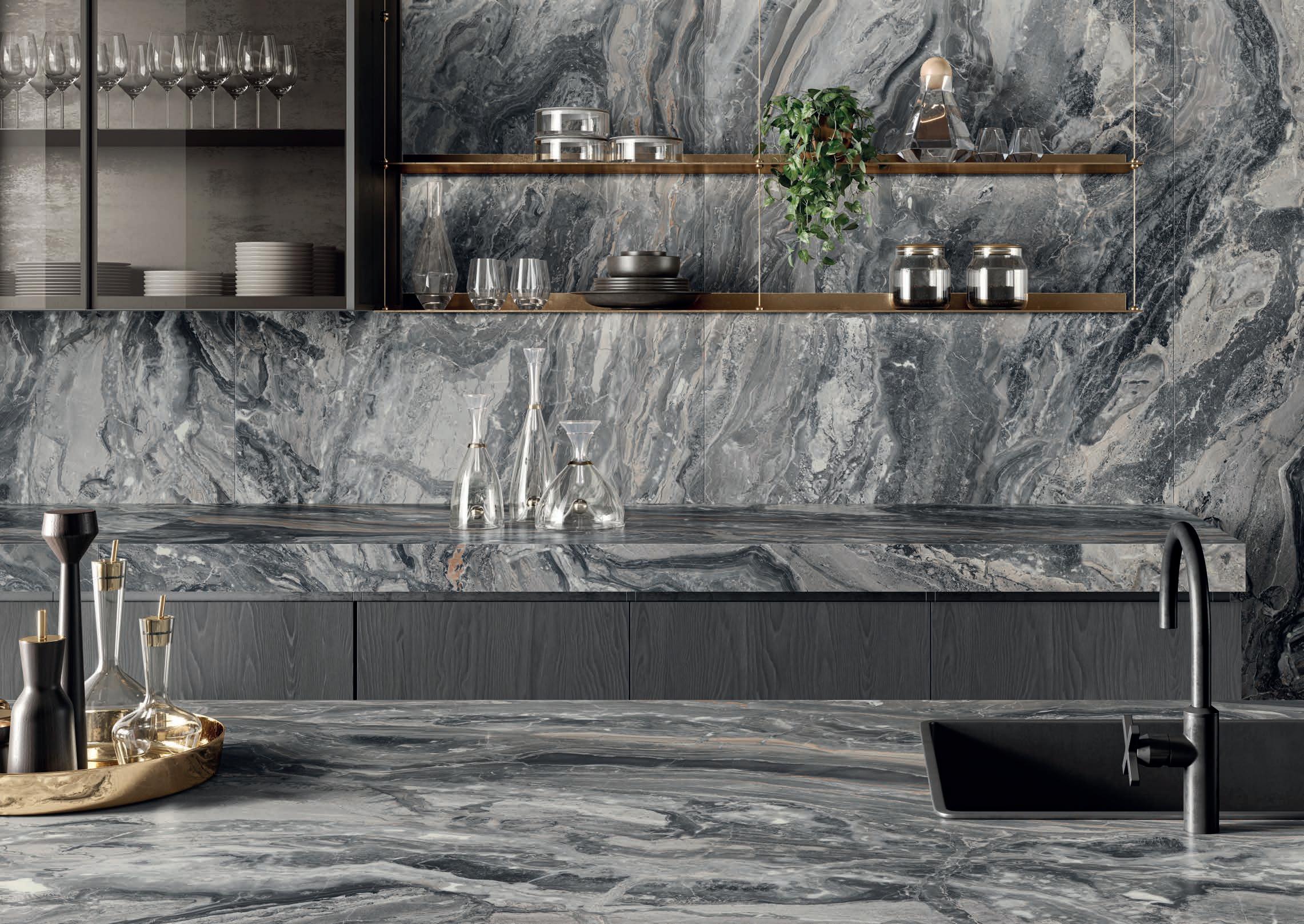 Sette marmi ceramici che, grazie a evolute tecnologie decorative digitali, restituiscono con assoluto realismo il fascino dei pregiati modelli naturali, riconoscibili per i grafismi mossi ma equilibrati.