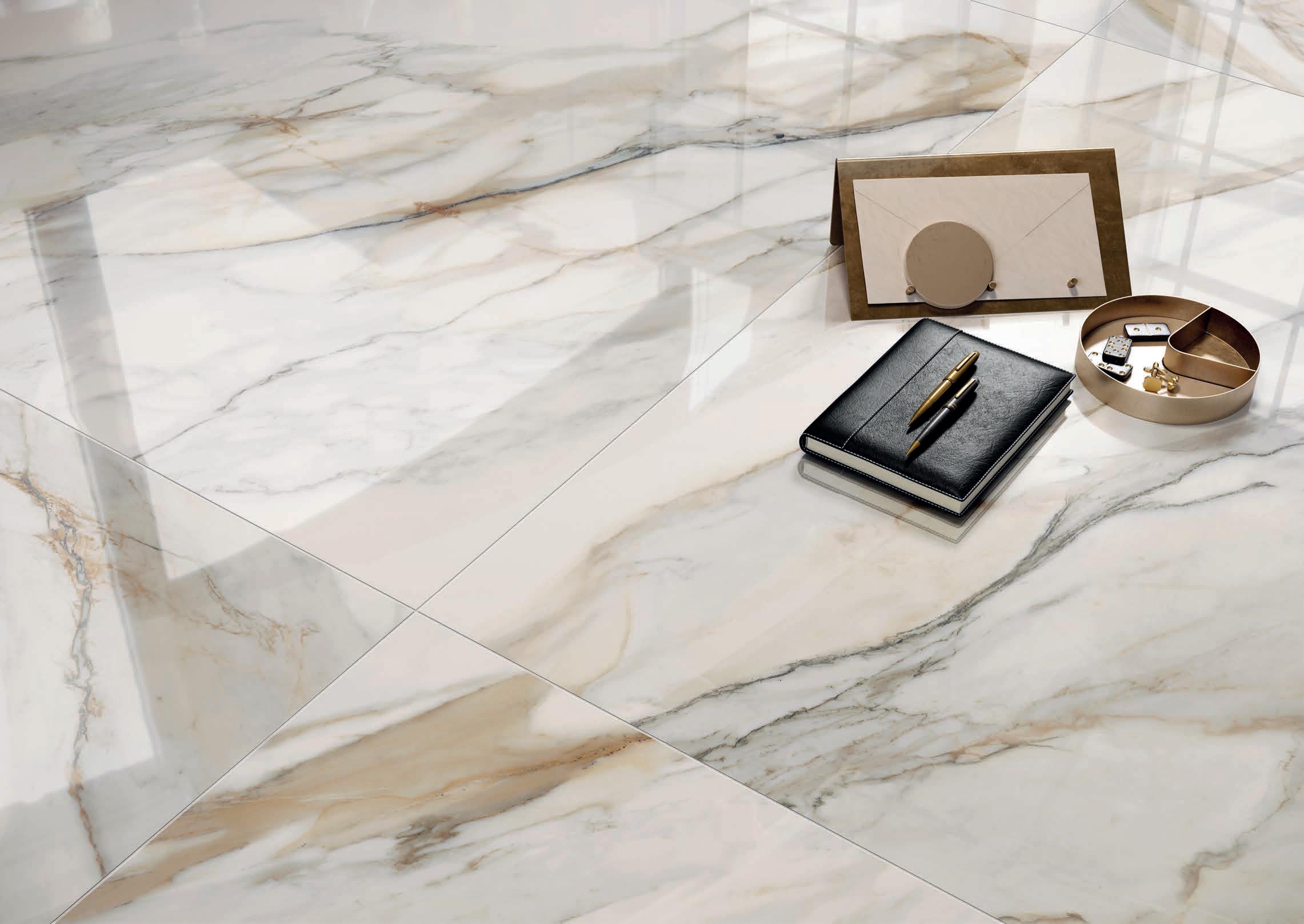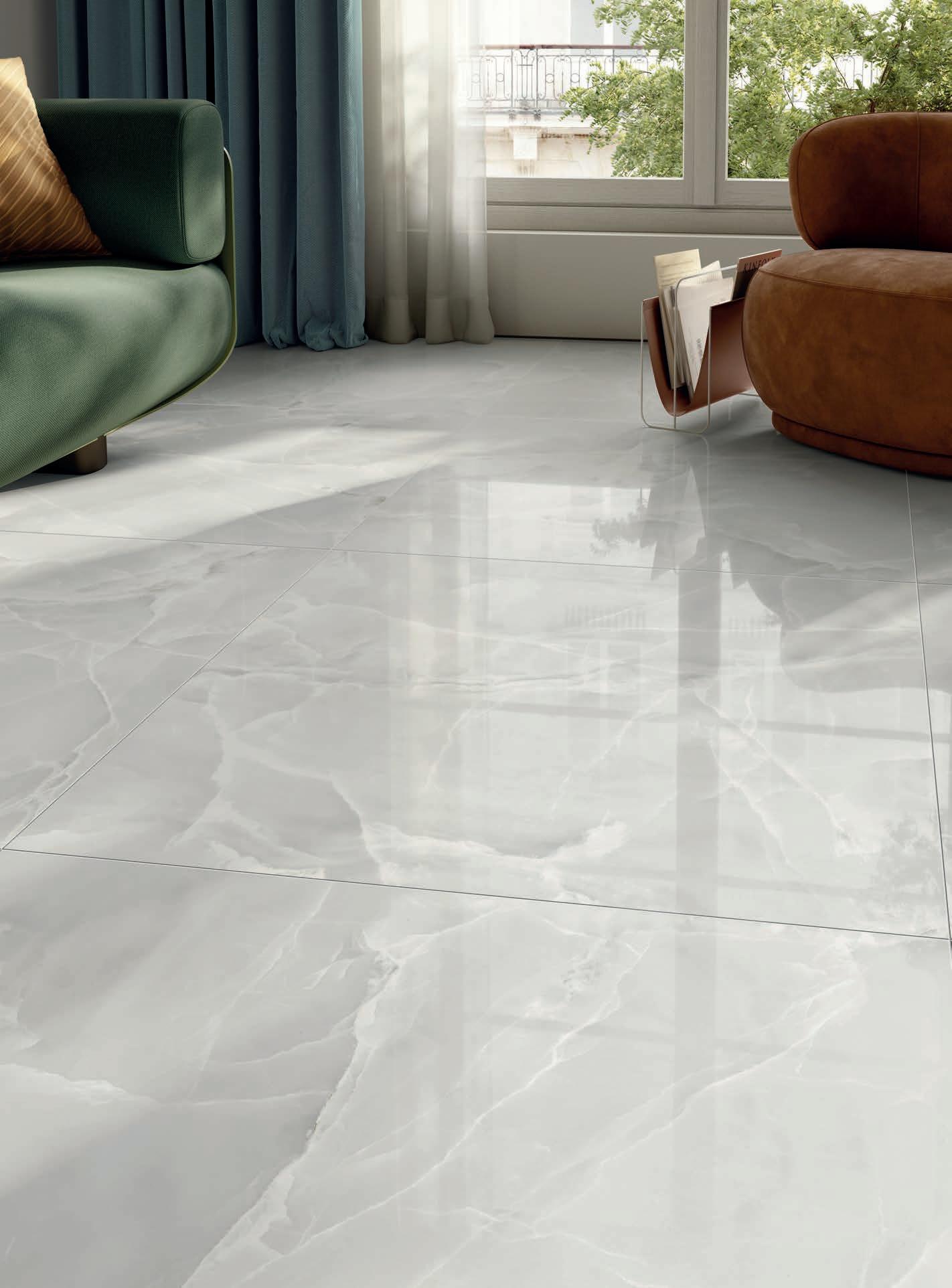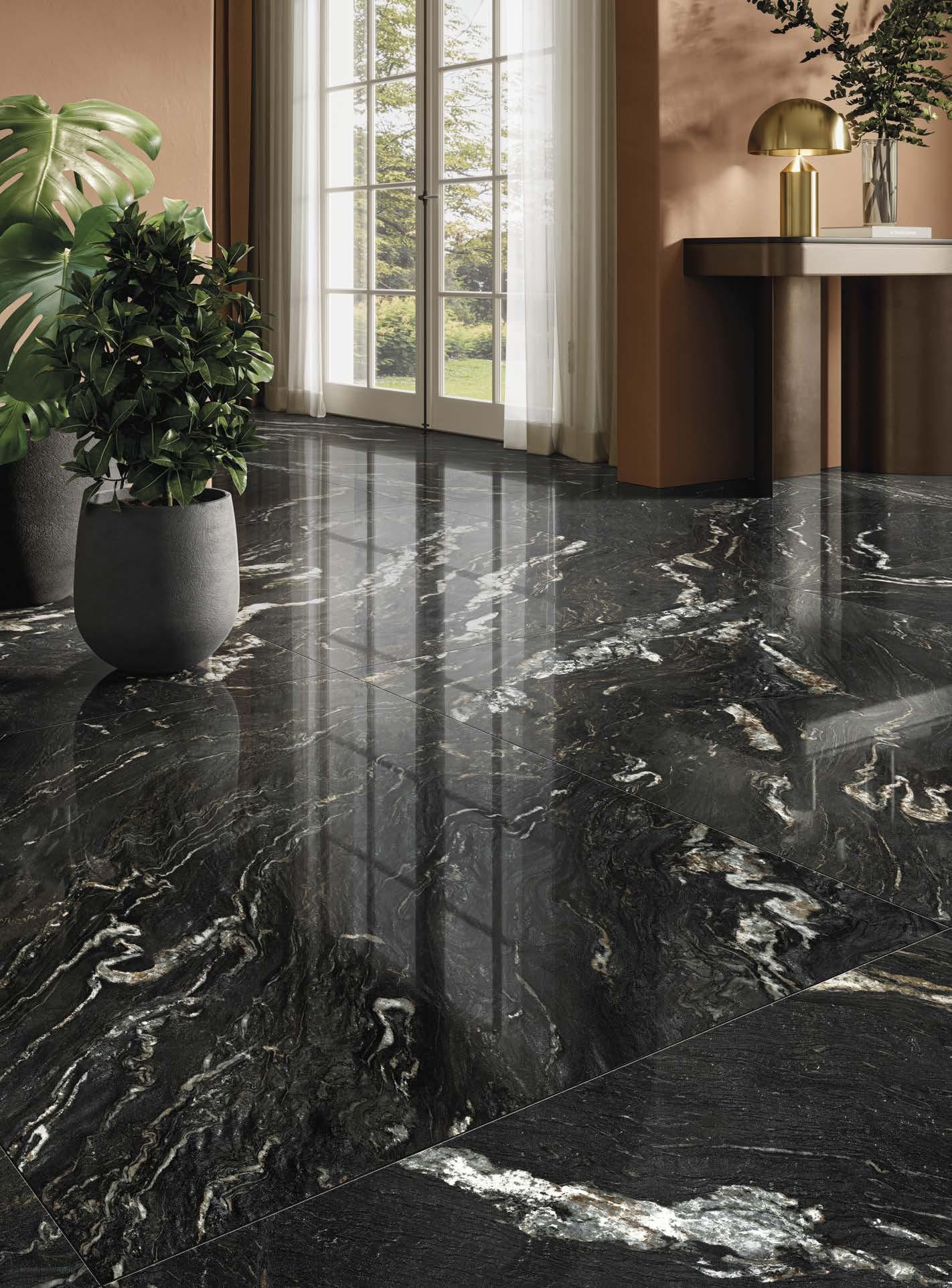 Una superficie lucida e specchiante, che accende la materia ceramica di riflessi limpidi e preziosi. Suggerisce una grande profondità grafica e una straordinaria ricchezza cromatica, valorizzando ogni minimo dettaglio della superficie.