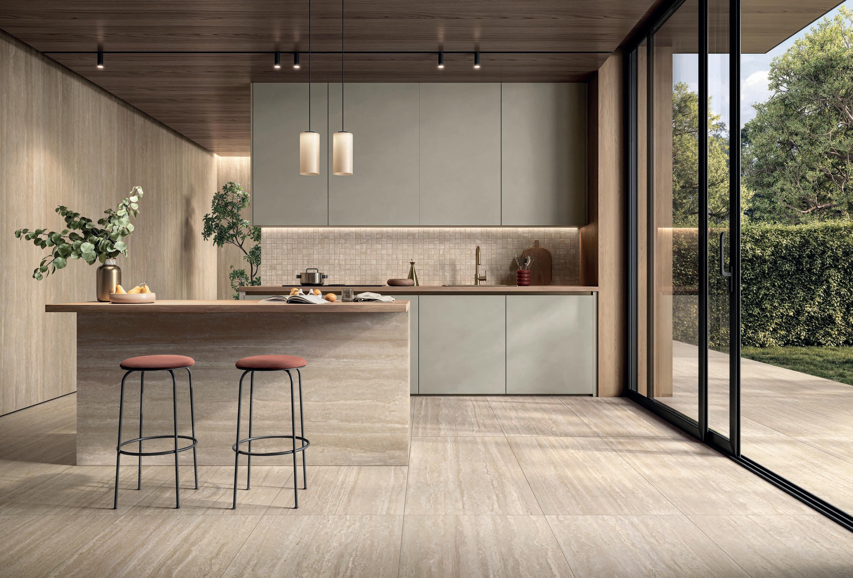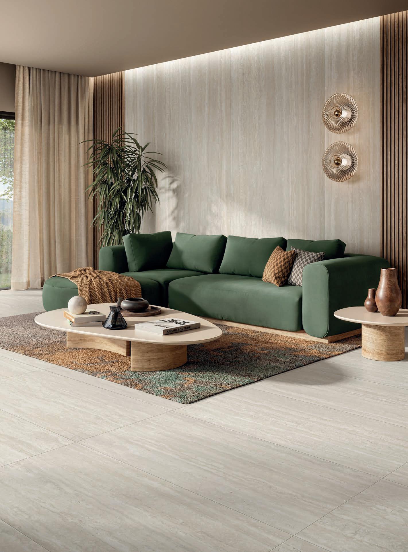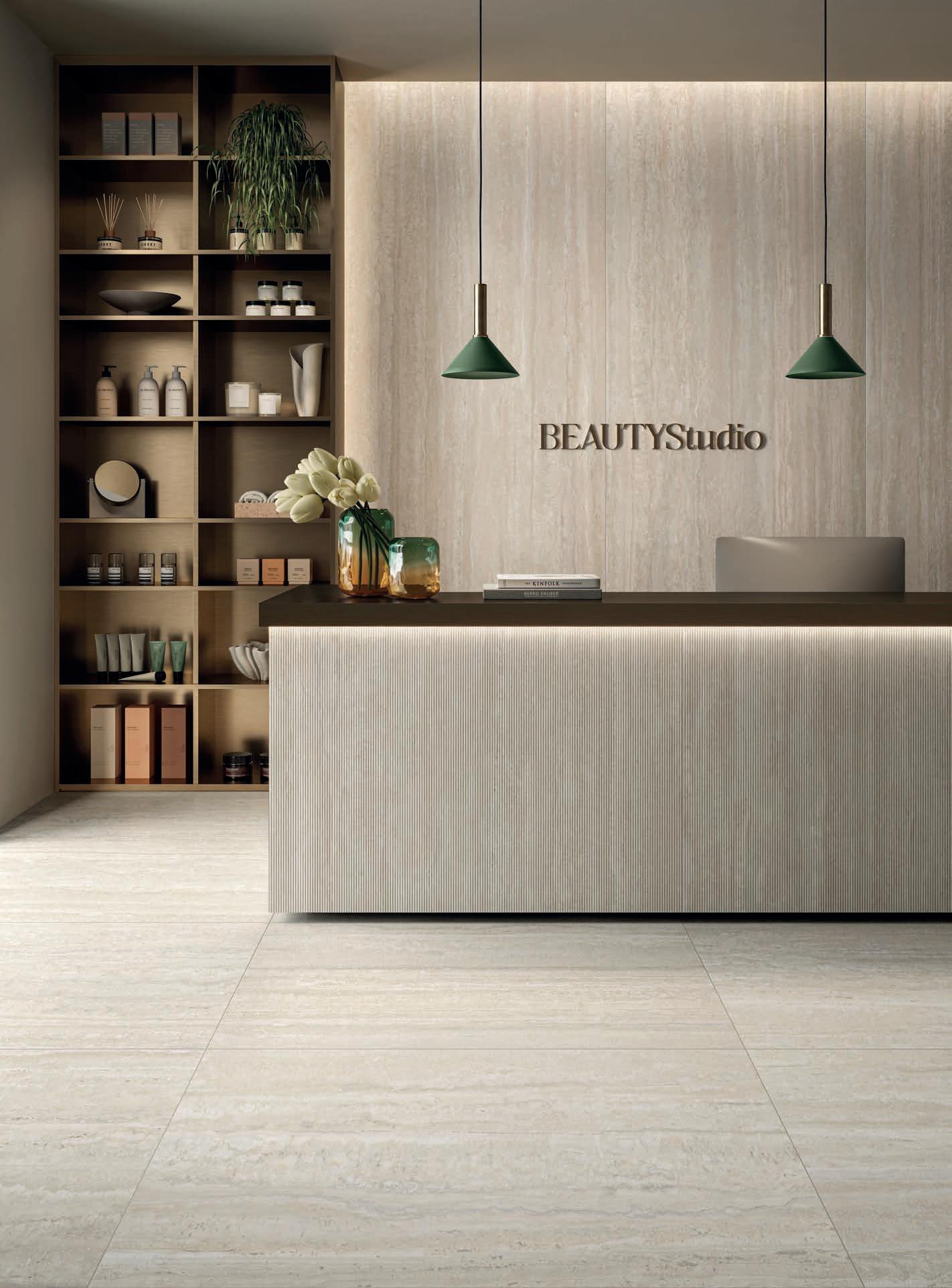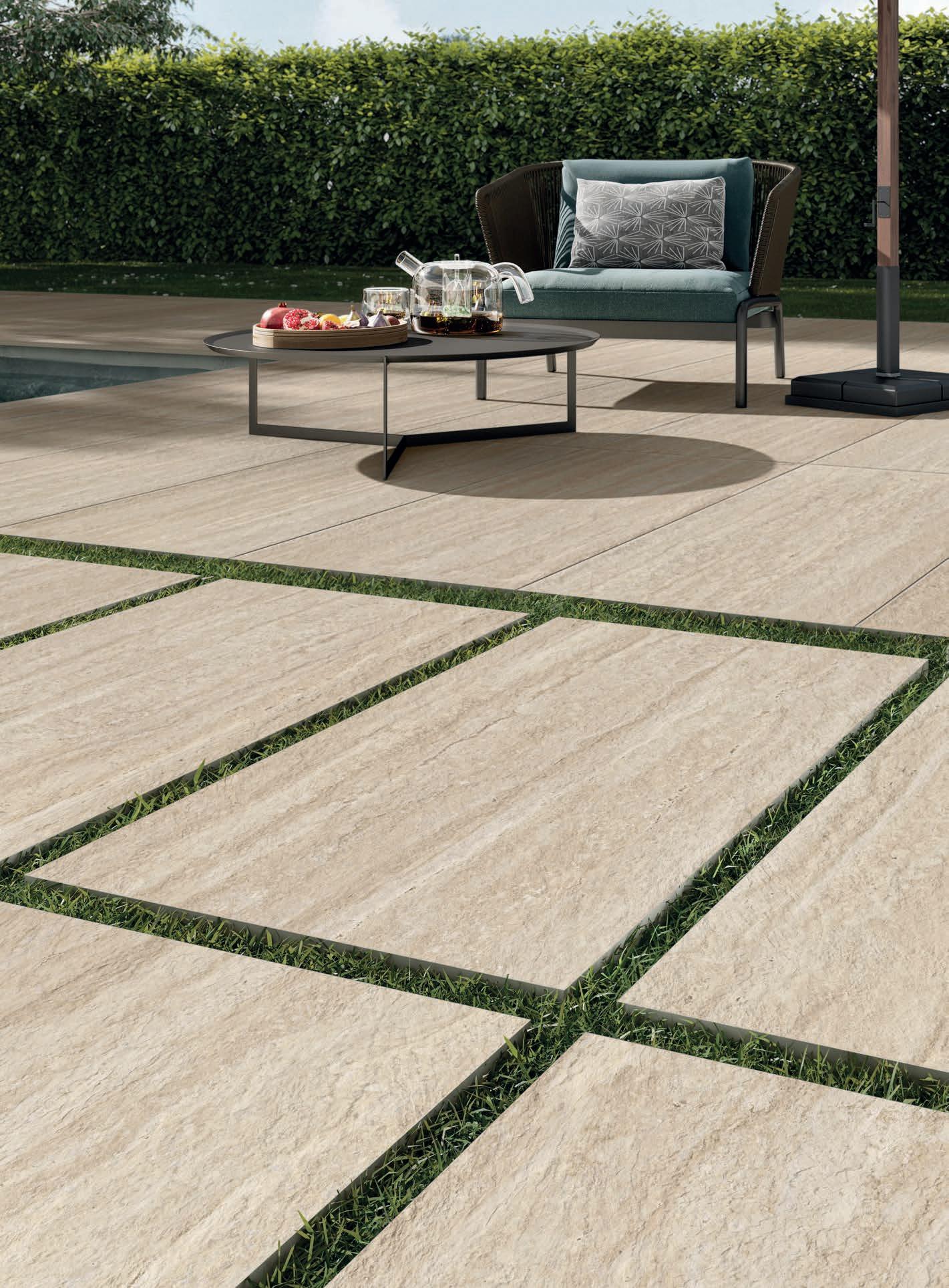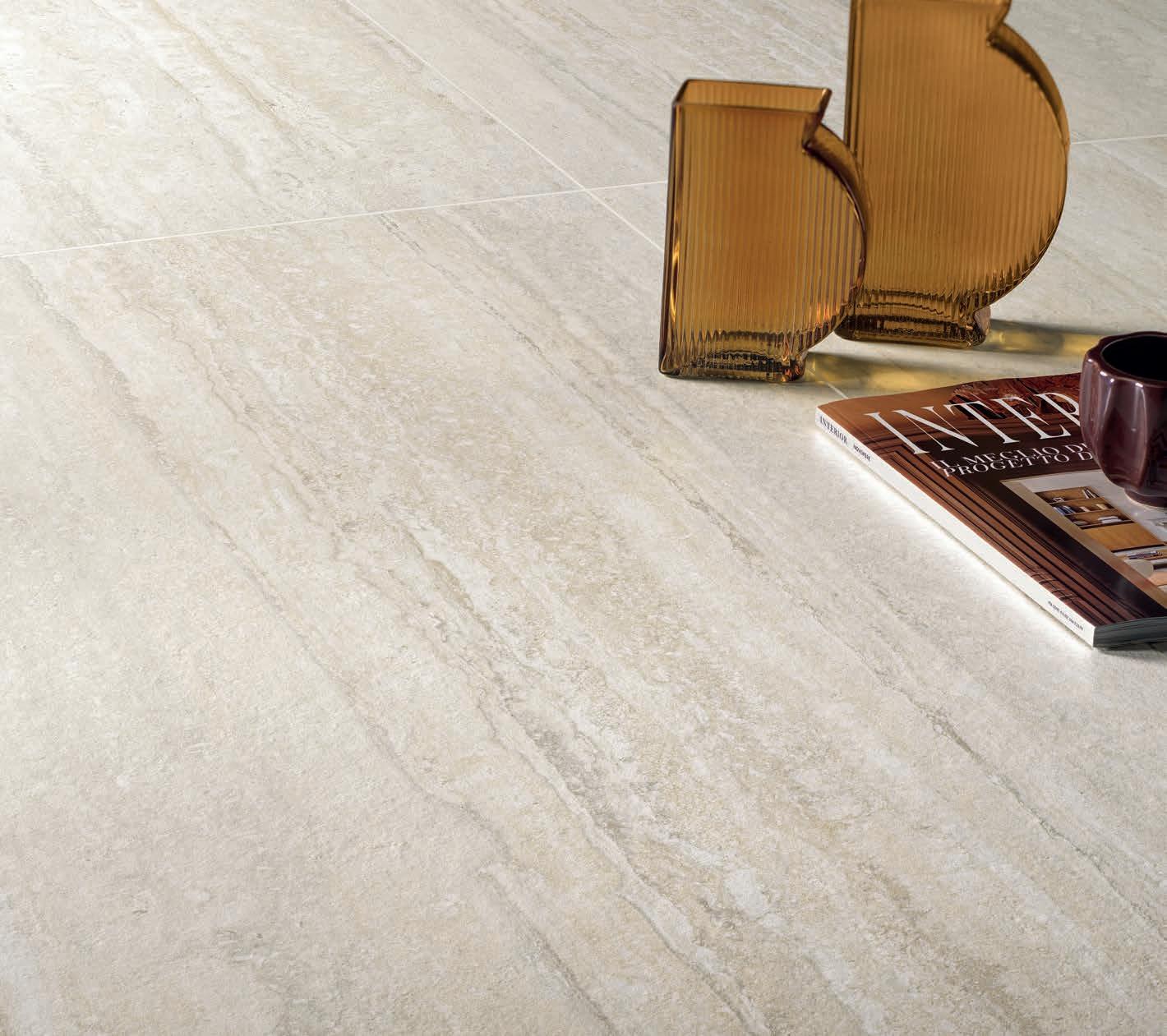 Three complementary and synergistic solutions that ensure extensive application possibilities with the same decorative impact. From the large Zero.3 slabs, to the 9 mm porcelain stoneware for indoor and outdoor use, up to the 20 mm thick Perpetual Travertino porcelain tiles for the highestperformance applications.