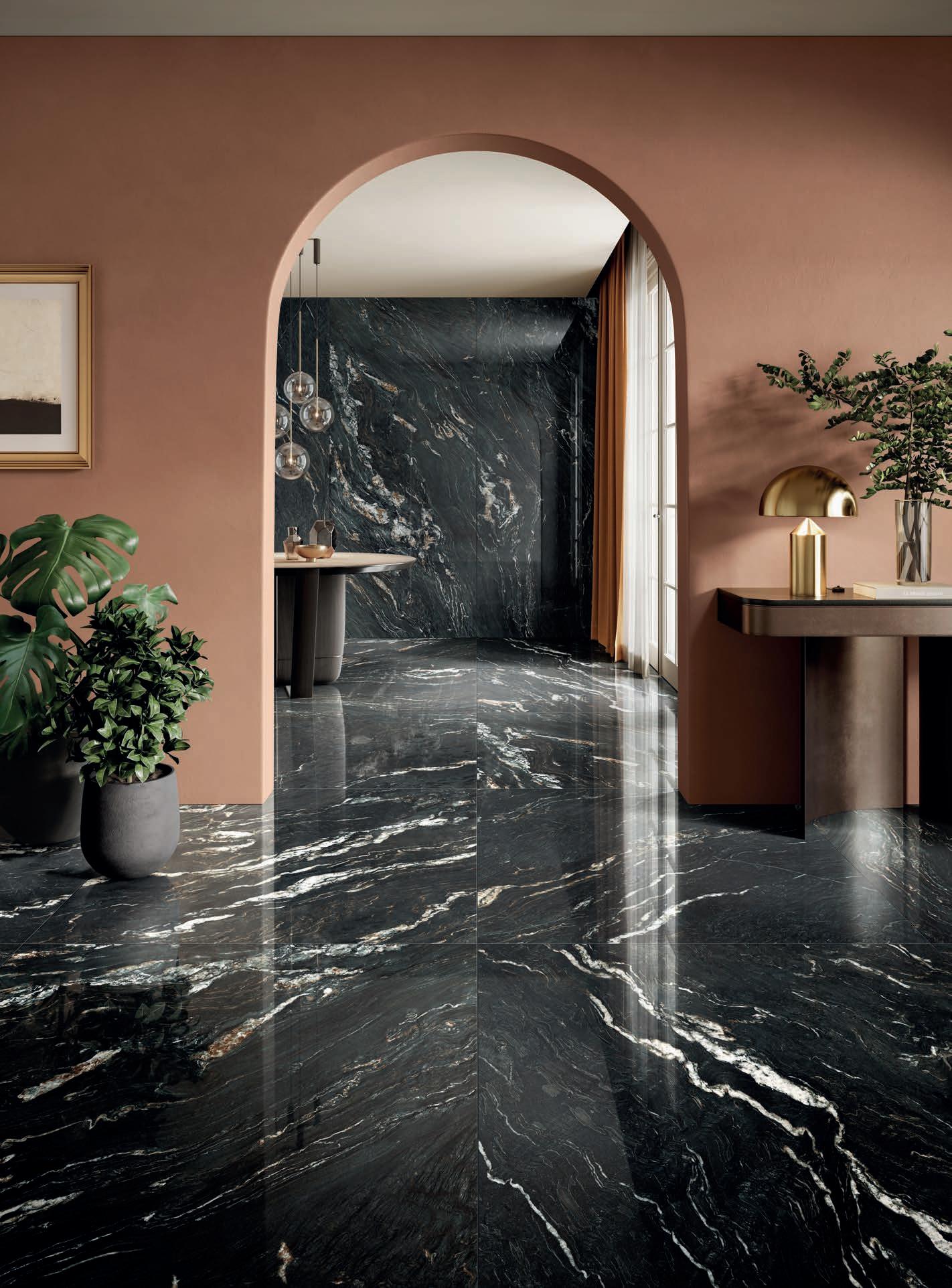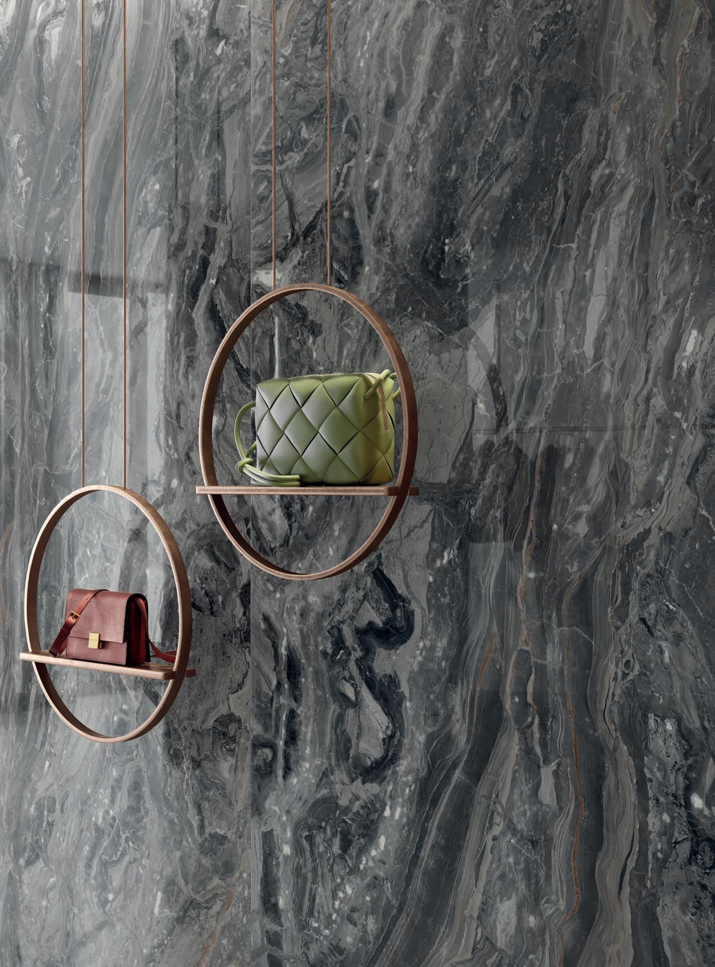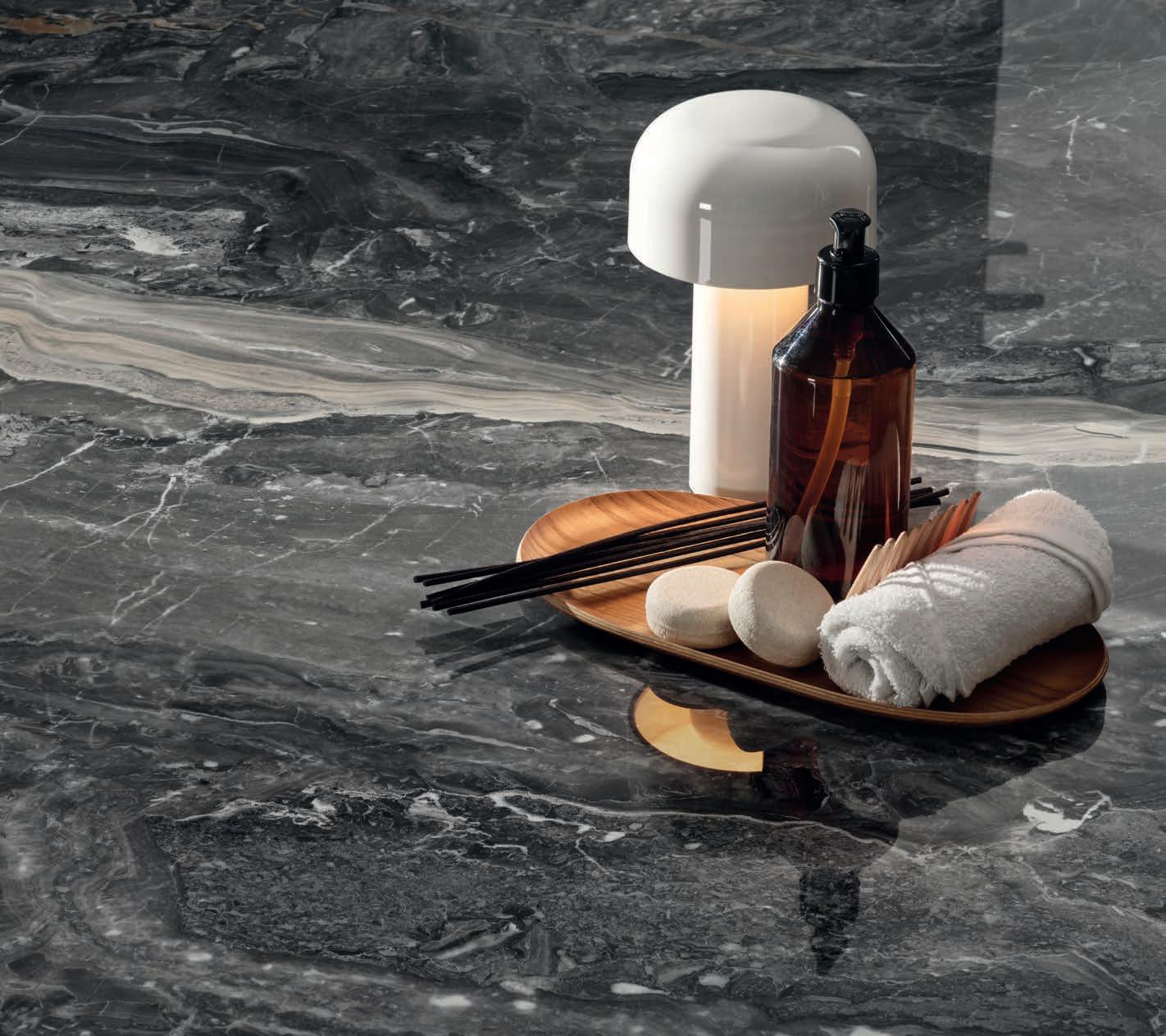 Surprisingly modern, this matt finish is characterized by its pleasantness to the touch and soft pearly reflection. Applied to the marble look, it renews it in an exquisitely contemporary key, which makes the graphic textures and tonal range protagonists.