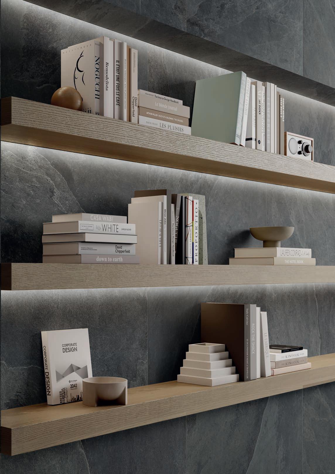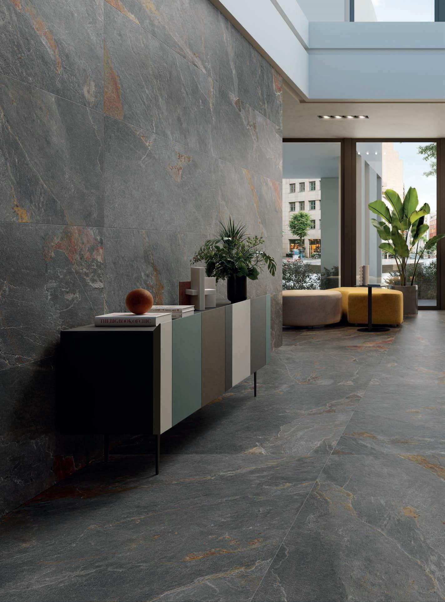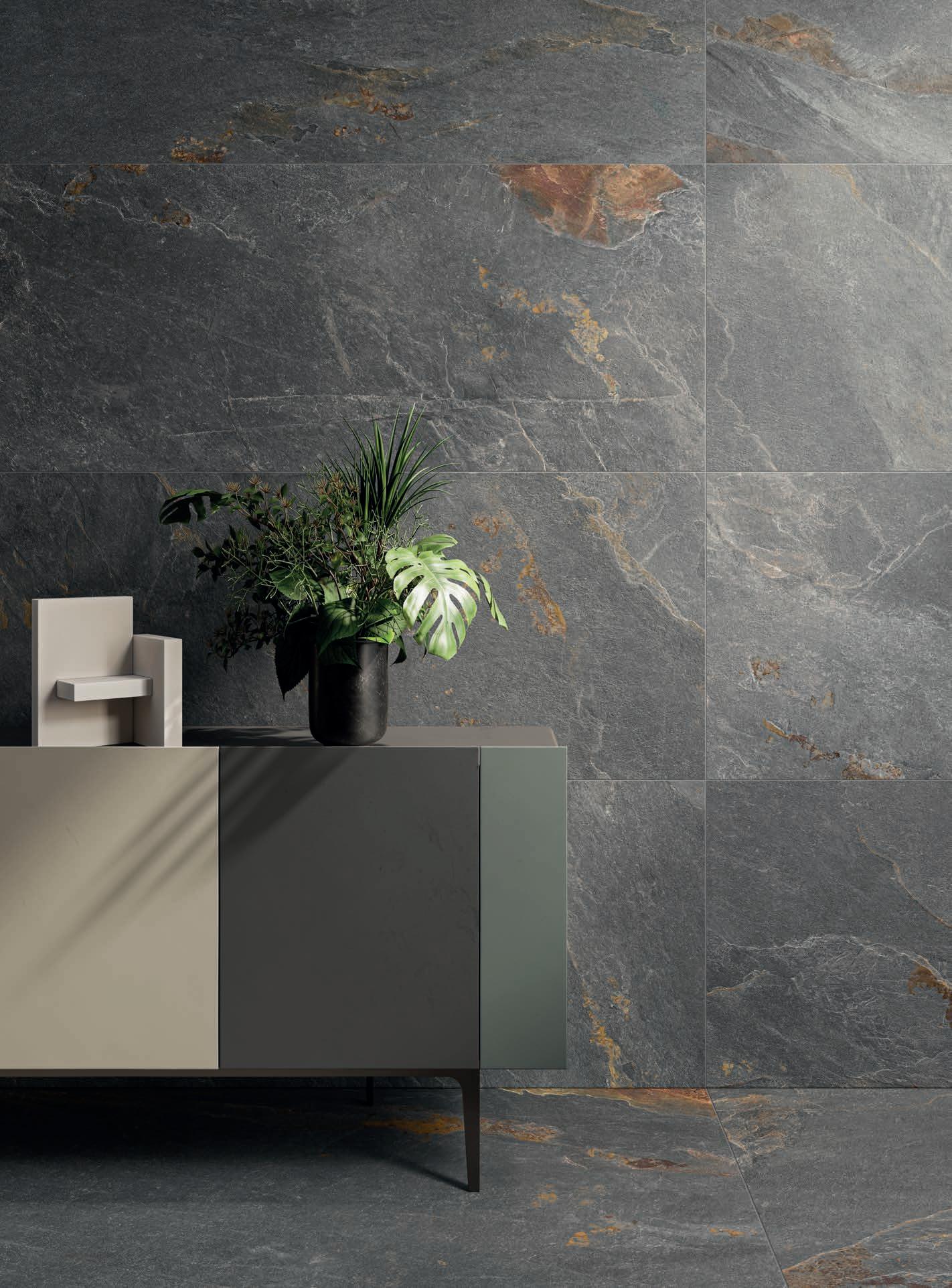 Intense and deep surfaces, reproduced in their characteristic three-dimensionality thanks to a skilful use of digital decoration, dress the spaces of contemporary living with personality.