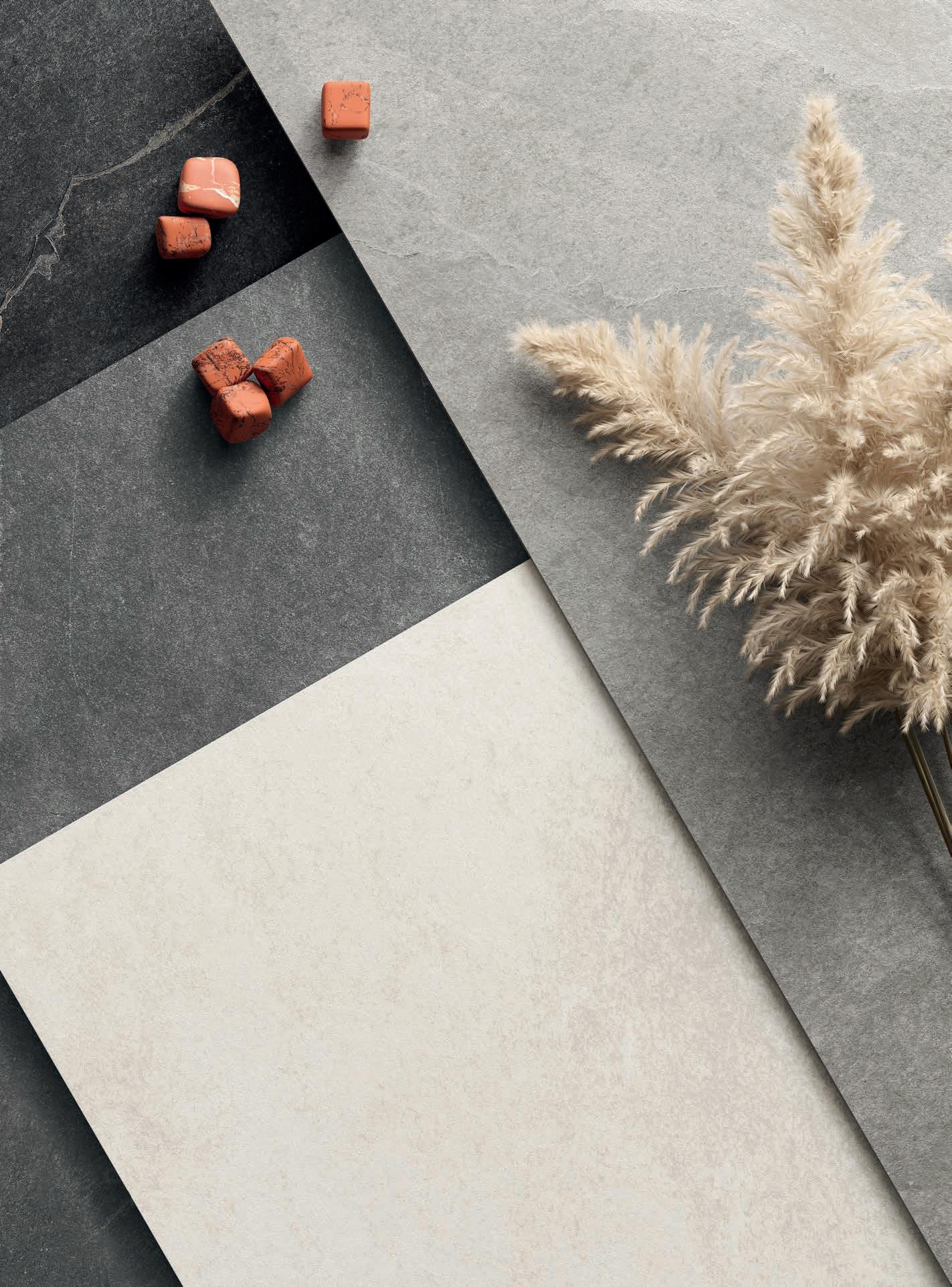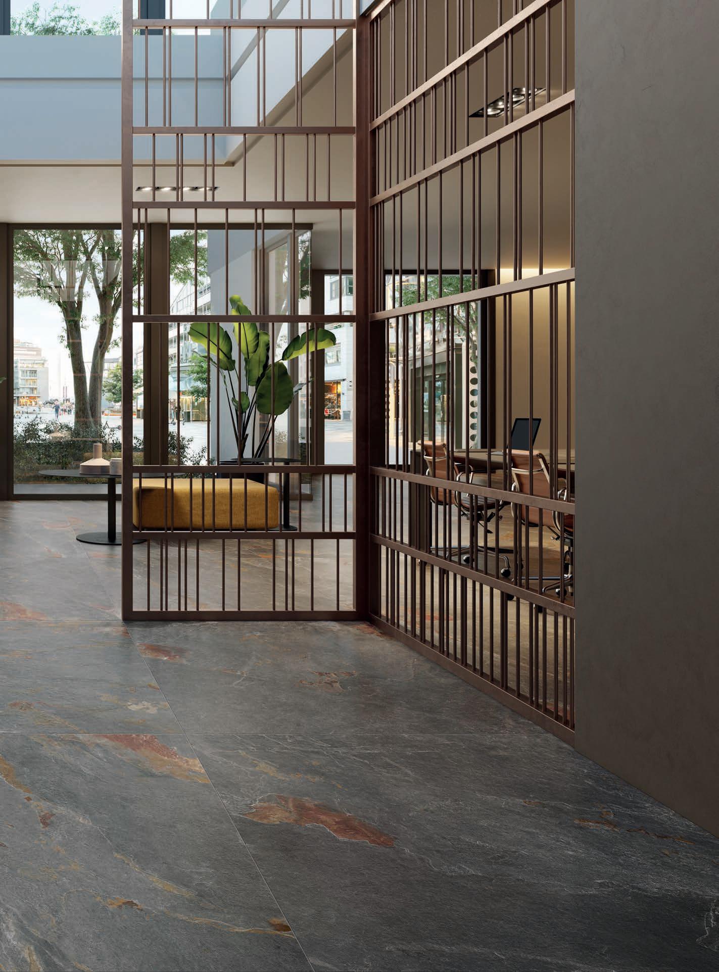 Frame provides a modern interpretation of the elegant character of sedimentary rock. Natural inspiration unites with creative and technological research. Haloing, calibrated streaks, and dynamic shading characterise a material with a profound and varied aesthetic and with great expressive strength. The textured and refined surfaces resonate with natural beauty.