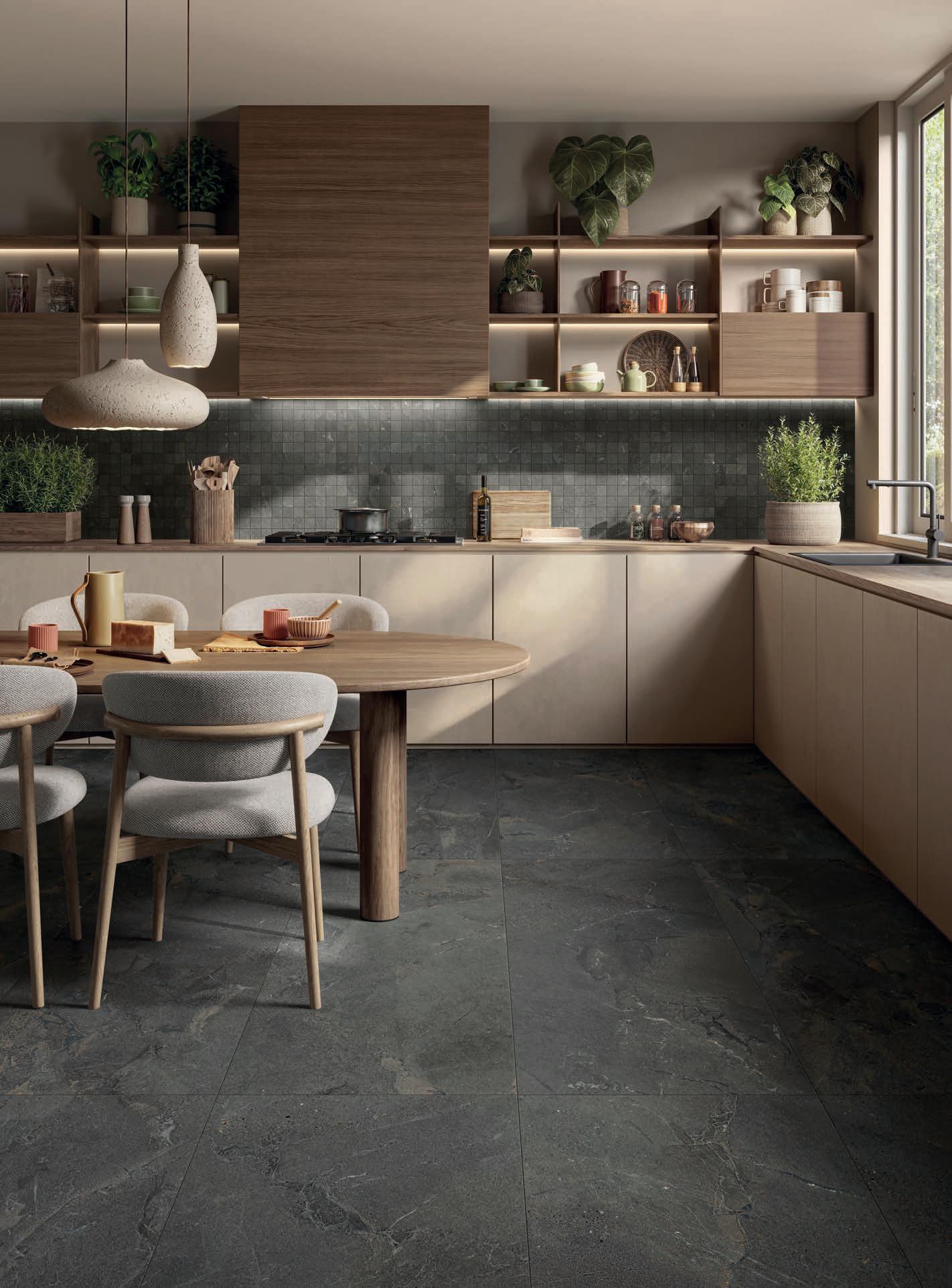 La superficie morbida e autentica delle grandi lastre combina sensazione tattile e valore materico, restituendo spazi dal carattere armonioso e attuale.