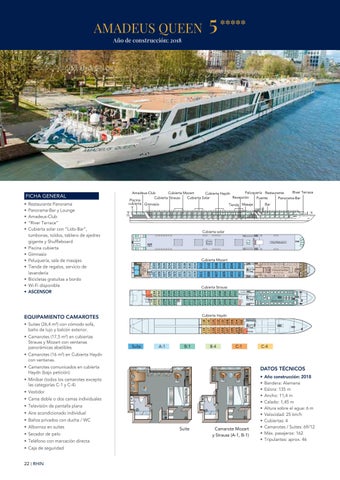 Restaurante Panorama Panorama-Bar y Lounge Amadeus-Club “River Terrace” Cubierta solar con “Lido-Bar”, tumbonas, toldos, tablero de ajedrez gigante y Shuffleboard Piscina cubierta Gimnasio Peluquería, sala de masajes Tienda de regalos, servicio de lavandería Bicicletas gratuitas a bordo Wi-Fi disponible ASCENSOR