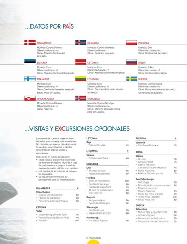 Debe tener en cuenta lo siguiente: • Estas visitas y excuriones opcionales se reservan en destino, durante el viaje. Se podrá realizar el pago a través de tarjetas de crédito, débito o en metálico. • Los precios de las mismas ya incluyen los impuestos. • Se requiere un mínimo de 20 participantes para su materialización. DINAMARCA
