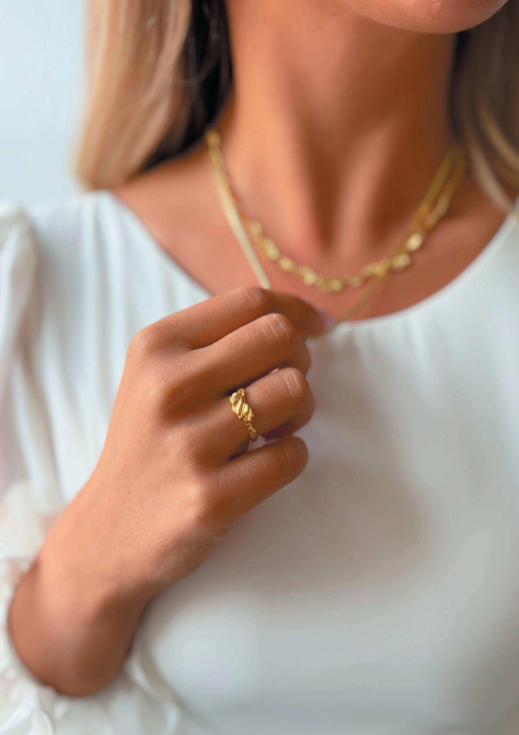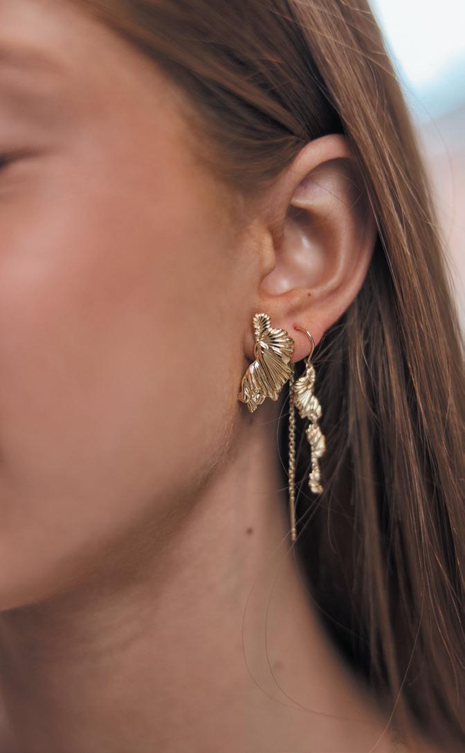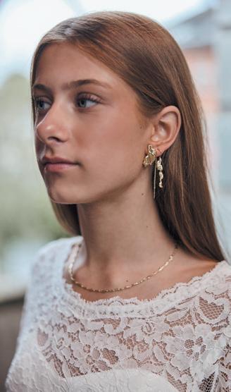 Kollektionen byder på moderne statement-smykker med et feminint twist. De gyldne nuancer og de fine blomsterdetaljer med små perler giver et luksuriøst, men stadig let og ungdommeligt udtryk.