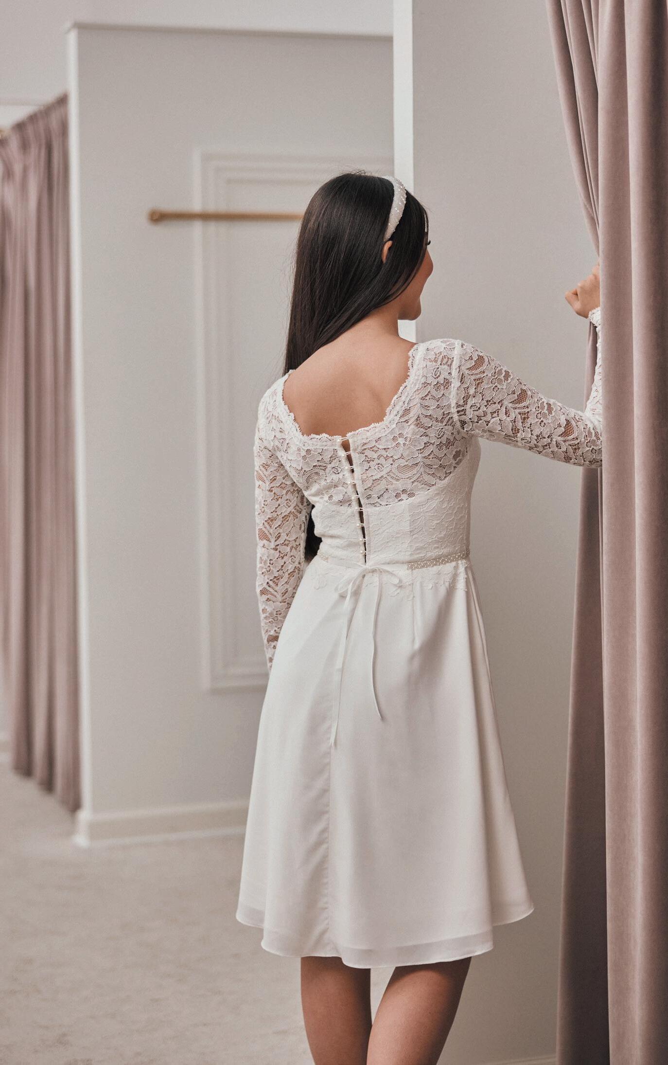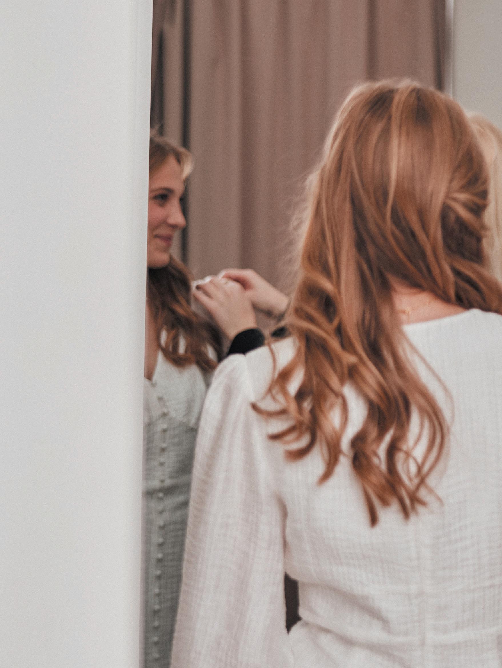 Hos vores skræddere prøver du kjolen og fortæller, hvilke ændringer du ønsker. Vores dygtige skræddere rådgiver dig om, hvad der vil fungere bedst – men i sidste ende er det dig, der bestemmer, hvordan kjolen skal se ud.