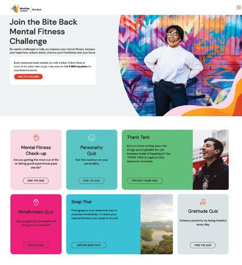 BITEBACKmakesbuilding skillsforbettermentalhealth andwell-beingfunforyoung people.ItfeaturesaMental FitnessChallenge,which guidestheuserthroughthe criticalareasoversixweeks.Theyareinvited tolearnandcompletetheweeklychallenges andarerewardedwithtokensthatplace theminadrawtowina$50voucherattheir favouritestore.