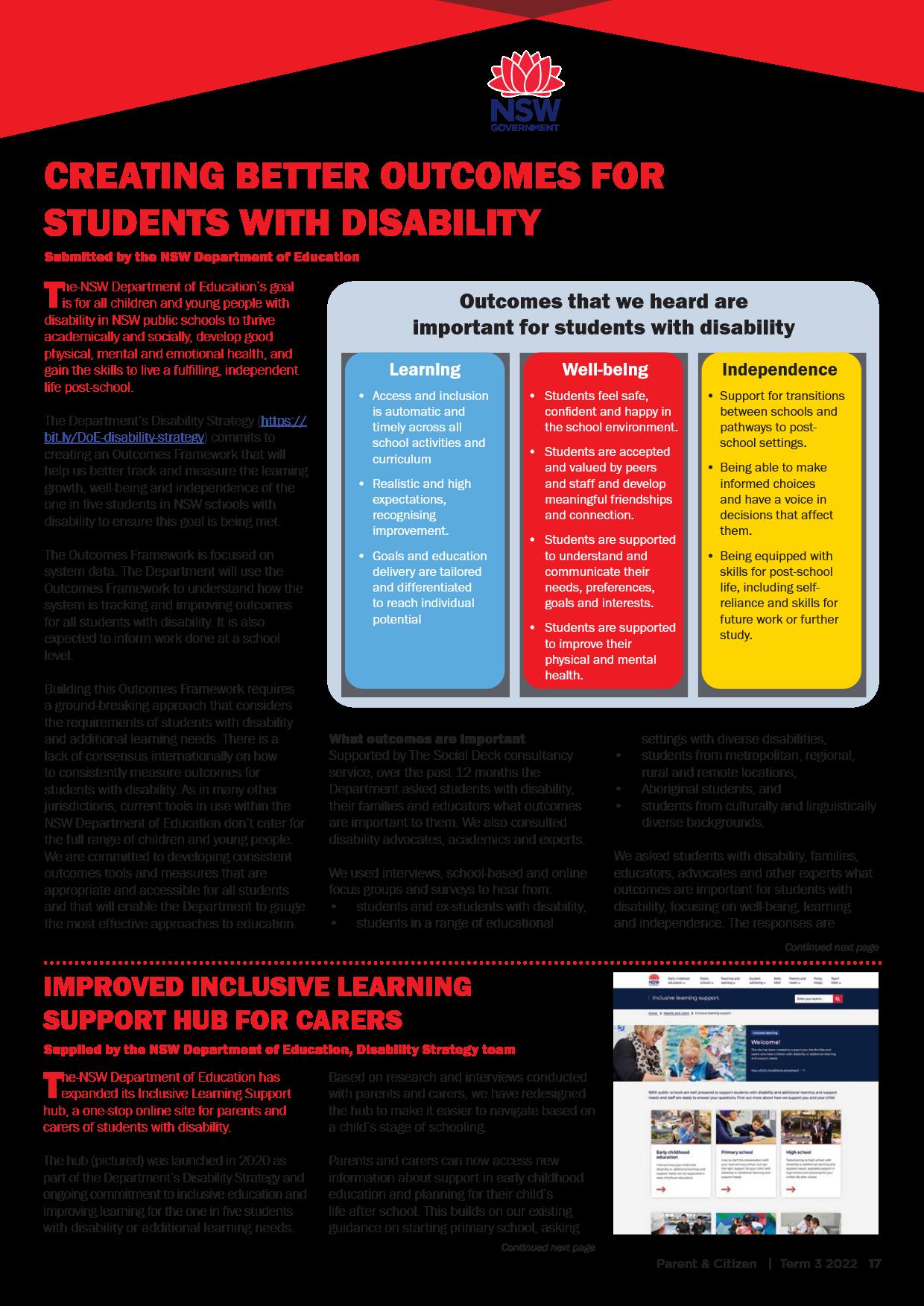 Inanotherarea,weworkedwiththe Departmentearlierthisyeartoprovidethe opportunityforthevoiceofparentsand carerstobeheardinthedevelopmentof anOutcomesFrameworkforstudentswith disabilityinNSWschools.Youcanreadmore aboutthisconsultationinthearticleonp17.