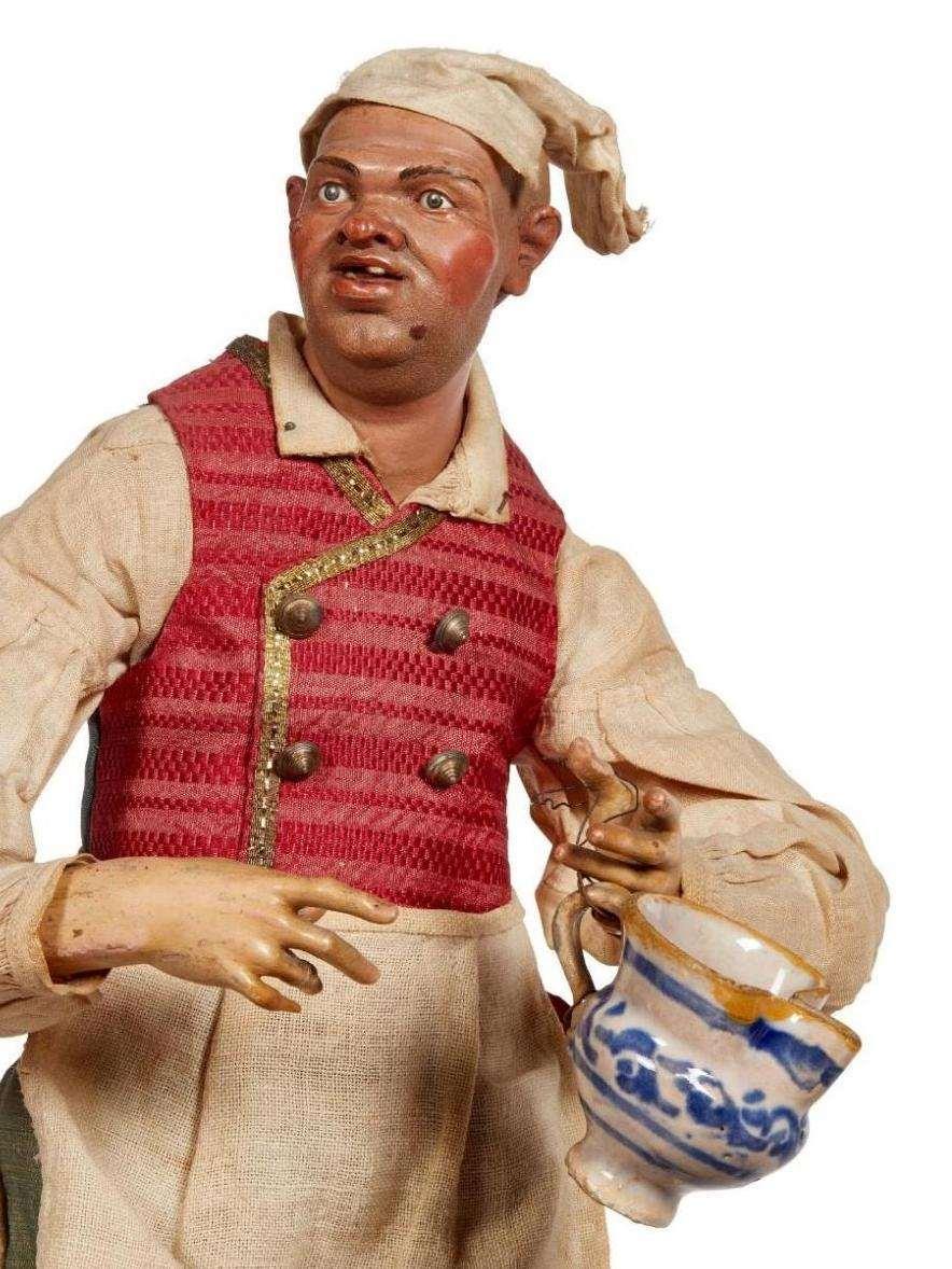 Testa in terracotta policroma, mani e piedi in legno dipinto, occhi in vetro, manichino in fil di ferro ricoperto di stoppa, abbigliato con camicia in tela, gilet rosso con passamaneria dorata e bottoni, brache verdi con orlo dorato, cappello in testa e grembiule bianco in vita, alt. cm 38 (composizione cm 43x38x21); accessori: due brocche di cui una in maiolica, due vasi biansati in terracotta, grande botte in legno e sette botti più piccole, fiasco di vino in vimini
