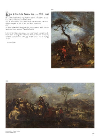 553 Cerchia di Pandolfo Reschi, fine sec. XVII - inizi XVIII LE SALMERIE DI UNO SQUADRONE DI CAVALLERIA ESCONO DA UN VILLAGGIO IN FIAMME SQUADRONE DI CAVALLERIA IN ATTESA DELL’ATTACCO coppia di dipinti ad olio su tela, cm 24x47,5 ciascuno (2) sul retro: nella tela di rintelo vecchia iscrizione e sul telaio etichetta con iscrizione a bistro: “Pandolfo Reschi” I dipinti riprendono con alcune lievi varianti dagli esemplari pubblicati nella monografia dell’artista: N. Barbolani Di Montauto, Pandolfo Reschi, Firenze 1996, pp. 88-89, schede nn. 36-37, figg. 28-29 ˆ 3.500 /5.000