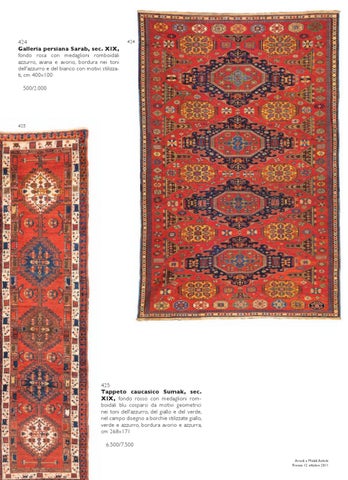 425 Tappeto caucasico Sumak, sec. XIX, fondo rosso con medaglioni romboidali blu cosparsi da motivi geometrici nei toni dell’azzurro, del giallo e del verde, nel campo disegno a borchie stilizzate giallo, verde e azzurro, bordura avorio e azzurra, cm 268x171 ˆ 6.500/7.500 224