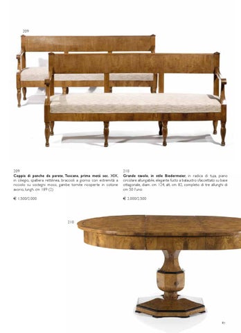 209 Coppia di panche da parete, Toscana, prima metĂ sec. XIX, in ciliegio, spalliera rettilinea, braccioli a giorno con estremitĂ a ricciolo su sostegni mossi, gambe tornite ricoperte in cotone avorio, lungh. cm 189 (2)