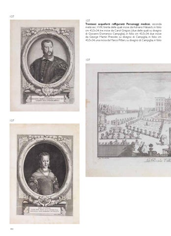 137 137 Trentasei acqueforti raffiguranti Personaggi medicei, seconda metĂ sec. XVIII, trenta delle quali incise da Adriano Haluech, in folio cm 43,5x34; tre incise da Carol Gregorj (due delle quali su disegno di Giovanni Domenico Campiglia), in folio cm 43,5x34; due incise da George Martin Preissler, su disegno di Campiglia, in folio cm 43,5x34; una incisa da Marco Pitteri, su disegno di Campiglia, in folio