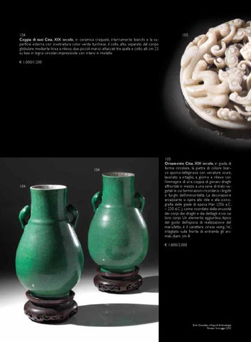 105 Ornamento Cina, XIX secolo, in giada, di forma circolare, la pietra di colore bianco sporco-lattiginoso con venature scure, lavorato a intaglio, a giorno e rilievo con l’immagine di una coppia di giovani draghi affrontati in mezzo a una serie di tralci vegetali le cui terminazioni ricordano i lingzhi o funghi dell’immortalità. La decorazione arcaizzante si ispira allo stile e alla iconografia delle giade di epoca Han (206 a.C. – 220 d.C.), come ricordato dalla sinuosità dei corpi dei draghi e dai dettagli incisi sui loro corpi. Un elemento aggiuntivo, tipico del gusto dell’epoca di realizzazione del manufatto, è il carattere cinese wang, ‘re’, intagliato sulla fronte di entrambi gli animali, diam. cm 8 € 1.800/2.000