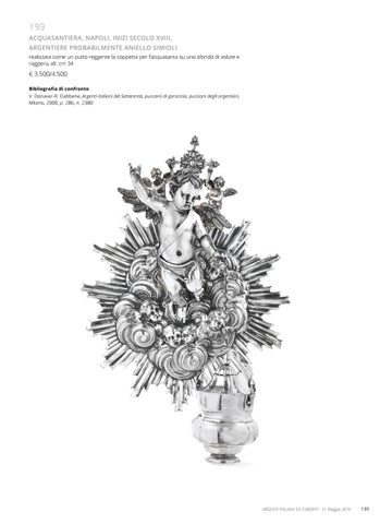 199 ACQUASANTIERA, NAPOLI, INIZI SECOLO XVIII, ARGENTIERE PROBABILMENTE ANIELLO SIMIOLI realizzata come un putto reggente la coppetta per l’acquasanta su uno sfondo di volute e raggiera, alt. cm 34