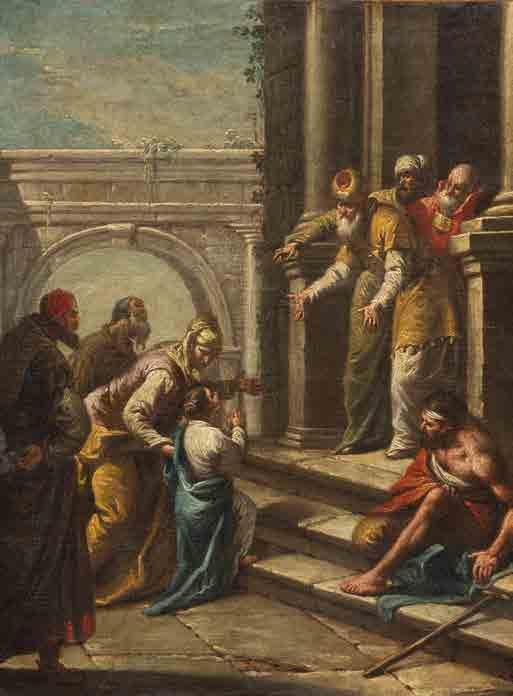 La piccola tela qui discussa è prossima per impaginazione iconografica alle tele di grande formato di Tiziano conservate a Monaco e Parigi. Differisce da quei due più alti modelli per la composizione orizzontale e l’aggiunta del Proconsole a sinistra, si tratta quindi di una tela che dilata lo spazio tizianesco per inserire nuove figure: è possibile vada ricondotta ad un pittore veneto di primo Seicento che avendo ben presente i modelli tizianeschi riformula l’impaginazione della scena.