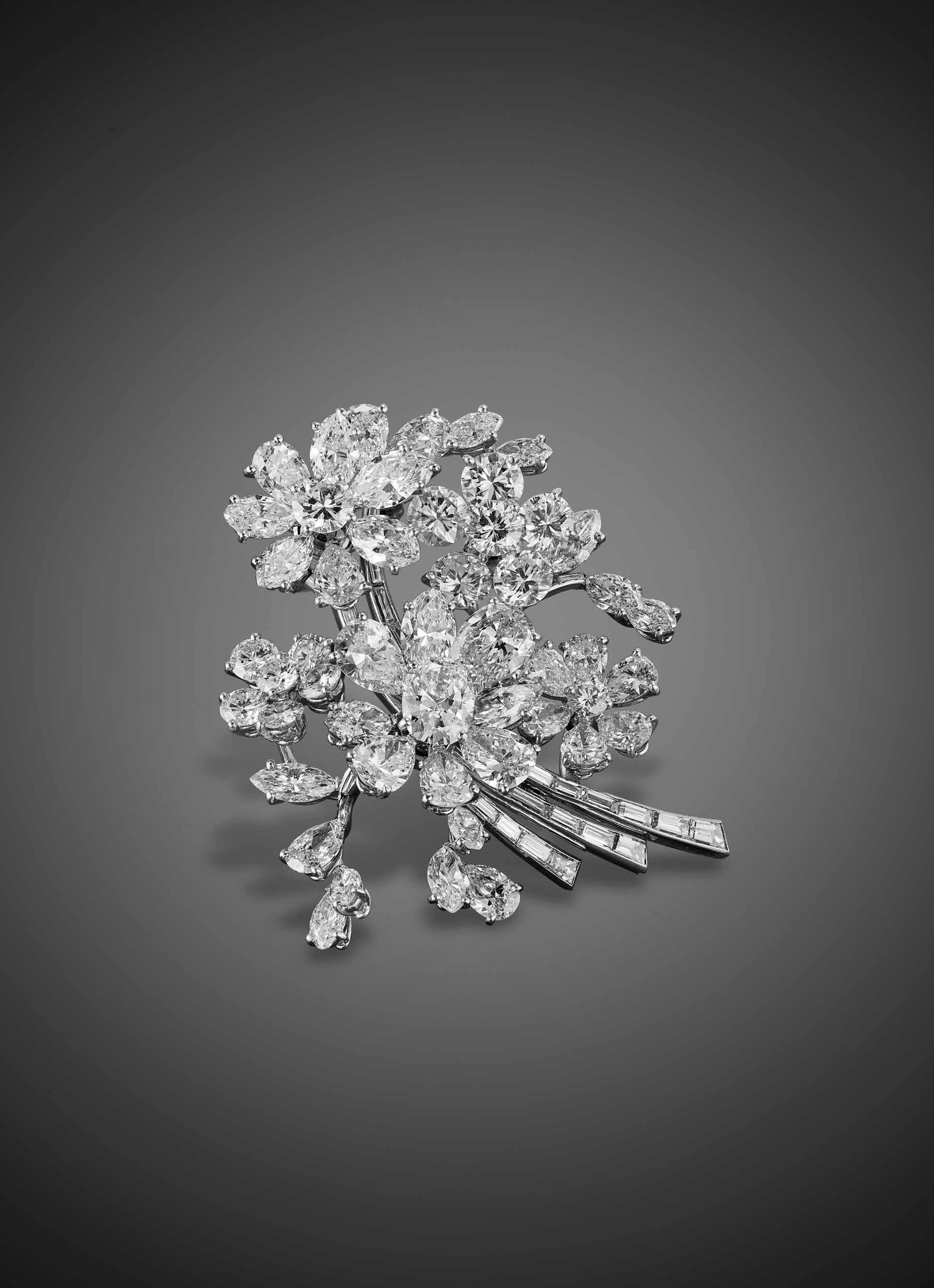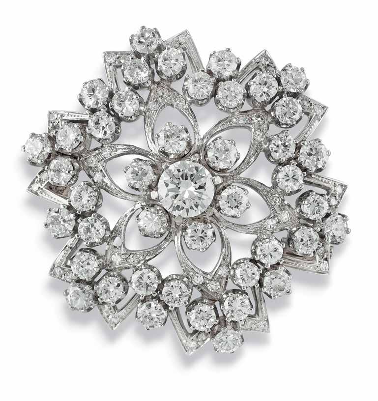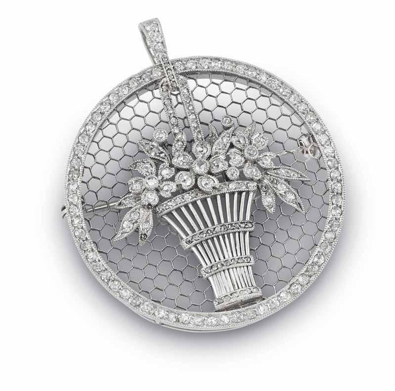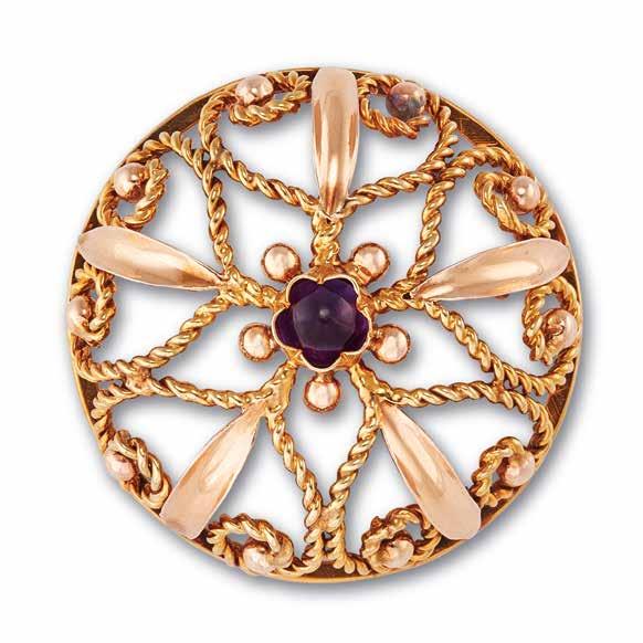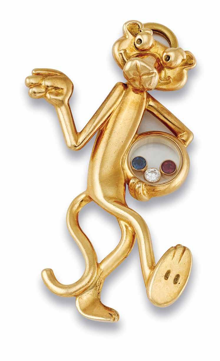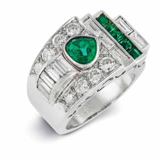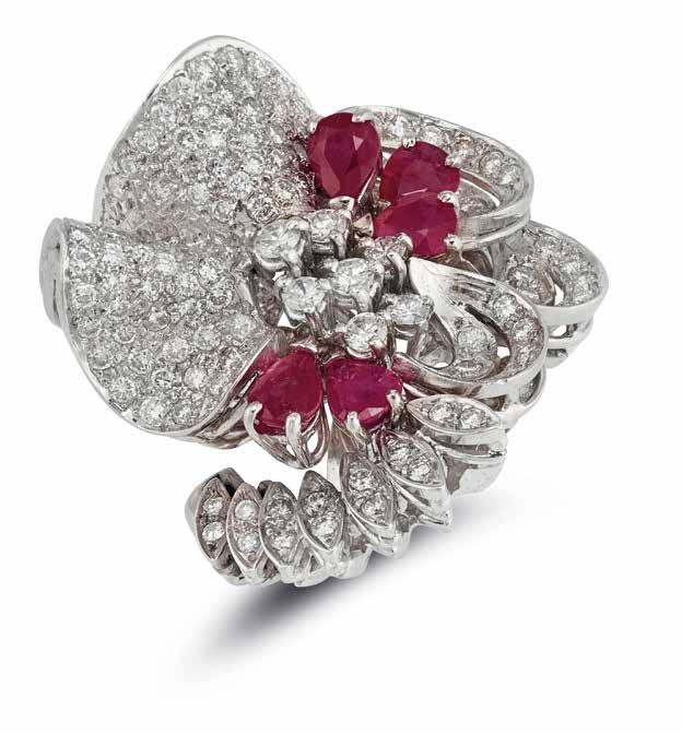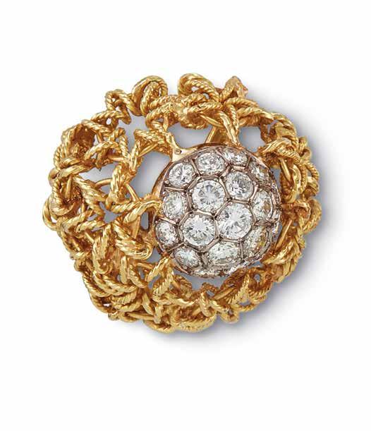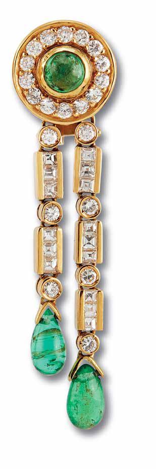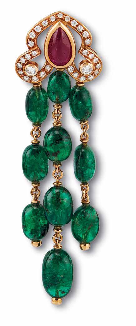 in oro giallo 18kt, impreziosita da smeraldi taglio rotondo per ct 1 circa, coralli e diamanti taglio brillante per ct 1.90 circa, dim. cm 4x4, gr. 21. Corredata di memorandum del 4/10/1973. Non riporta firma.