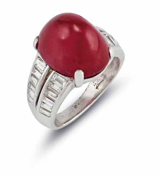 BULGARI ANELLO CON RUBINO E DIAMANTI in oro giallo e bianco 18kt, impreziosito da un rubino taglio cabochon di ct 1.60 circa e due diamanti taglio brillante per ct 0.20 circa, firmato Bulgari, punzoni 750 e del fabbricante, mis. 14/54, gr. 14. Corredato di memoradum di acquisto del 10/07/1981