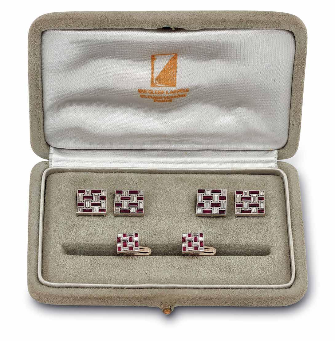 in oro giallo 18kt, impreziositi da rubini taglio cabochon per ct 4.40 circa e diamanti taglio brillante per ct 3.50 circa, chiusura a clip, punzone 750, lungh. cm 1x3, gr. 14