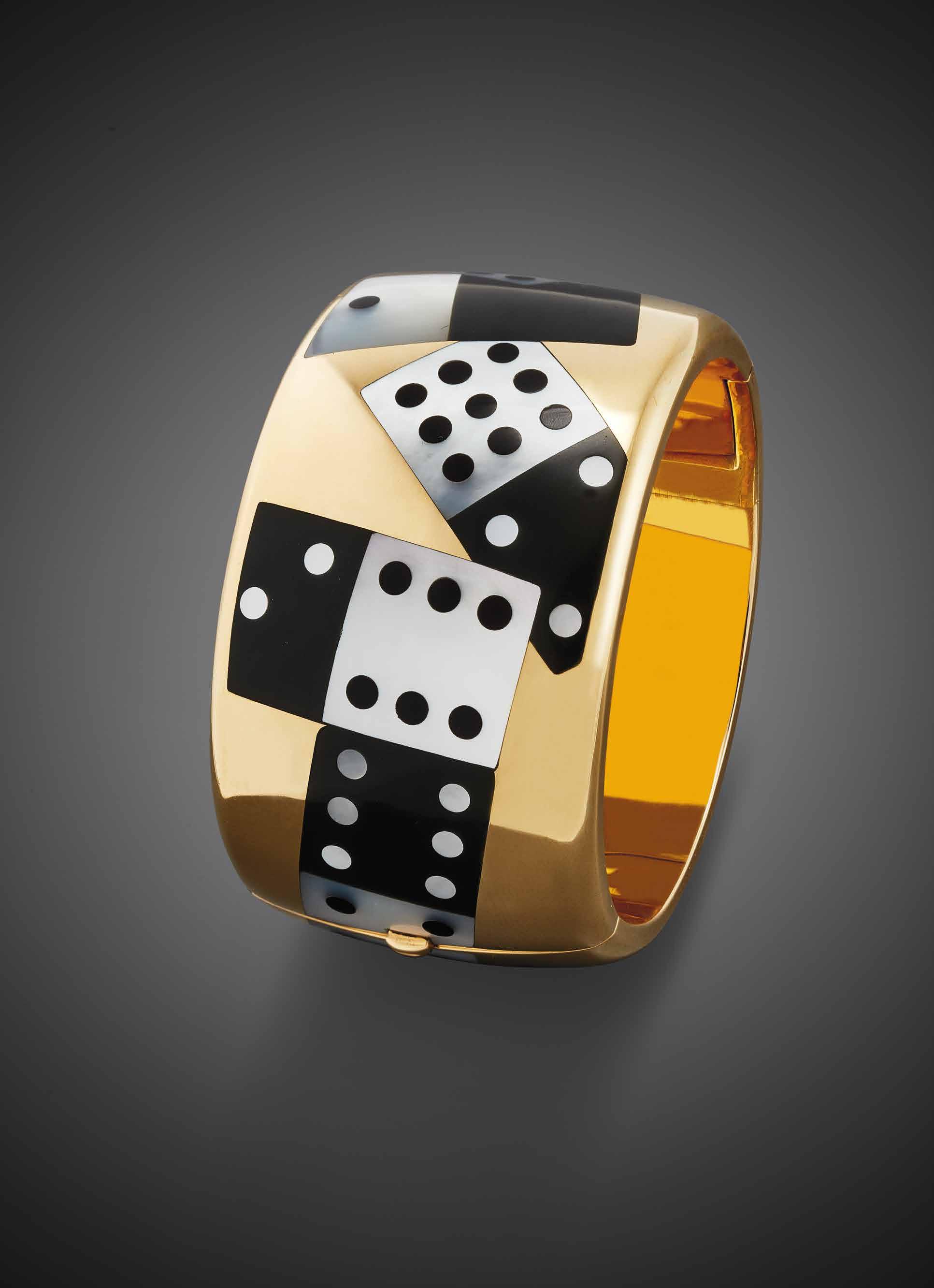 in oro giallo 18kt, impreziosito al centro da dischi in pietra dura circondati da diamanti taglio brillante per ct 0.60 circa, firmato Bulgari, mis. 10/50, gr. 16