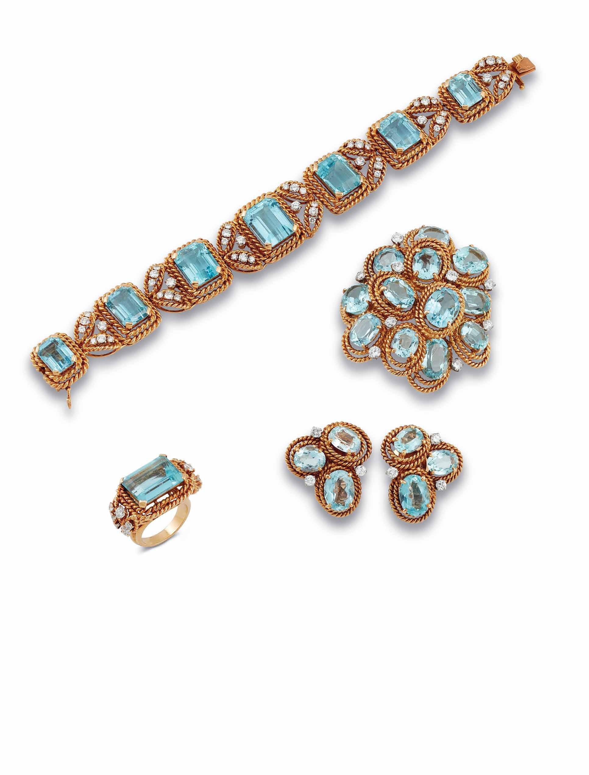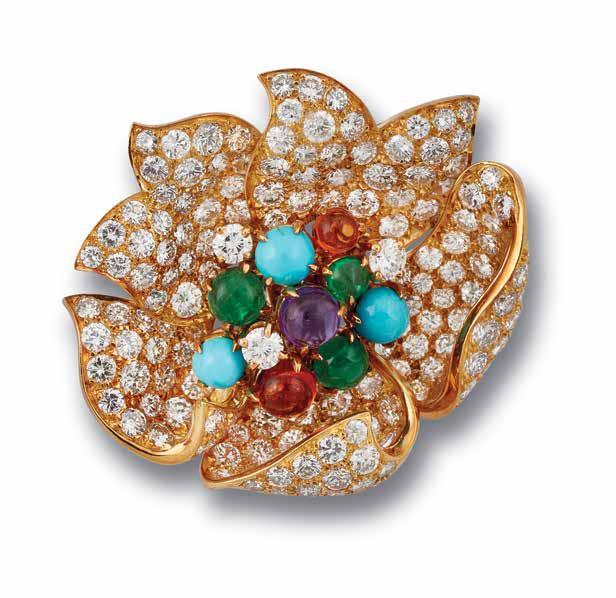in oro giallo 18kt, impreziositi da pavé di diamanti taglio brillante per ct 8.50 circa, e da smeraldi, topazi, ametiste e turchesi taglio cabochon, firmati Bulgari, chiusura a clip, dim. cm 3,5x3, gr. 34. Corredati di memorandum di acquisto del 03/03/1976.