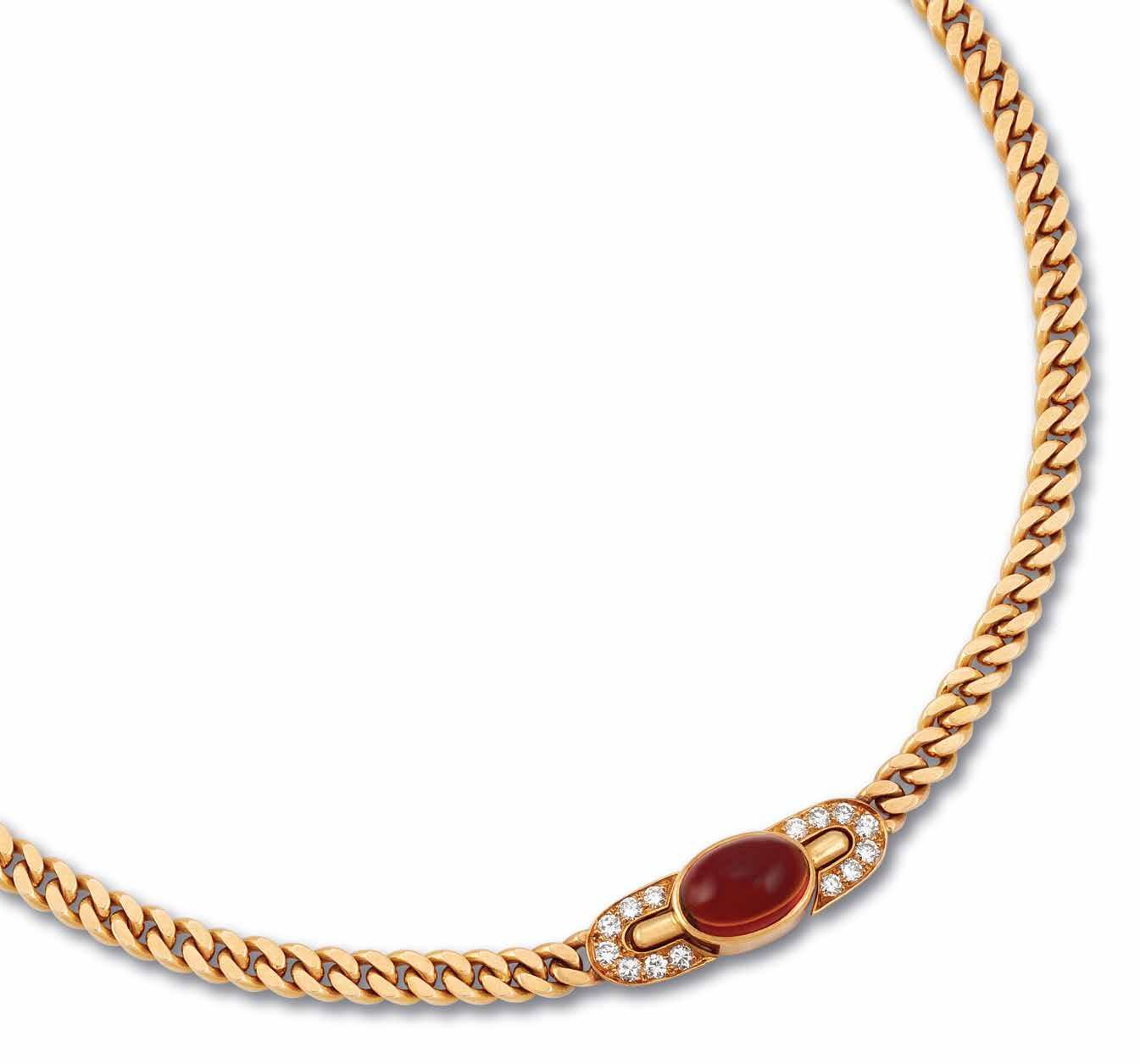 BULGARI COLLANA MAGLIA GROUMETTE CON PIETRA SEMIPREZIOSA E DIAMANTI in oro giallo 18kt, impreziosita da un taglio cabochon e diamanti taglio brillante per ct 0.50 circa, firmata Bulgari, lungh. cm 38, gr. 37. Corredata di memorandum di acquisto del 29/12/1978