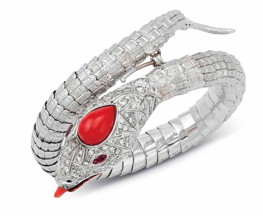 in oro giallo 18kt e platino, impreziosito da coralli taglio cabochon e diamanti taglio brillante per ct 1.40 circa, firmato Bulgari, punzoni francesi, mis. 13/53, gr. 18.
