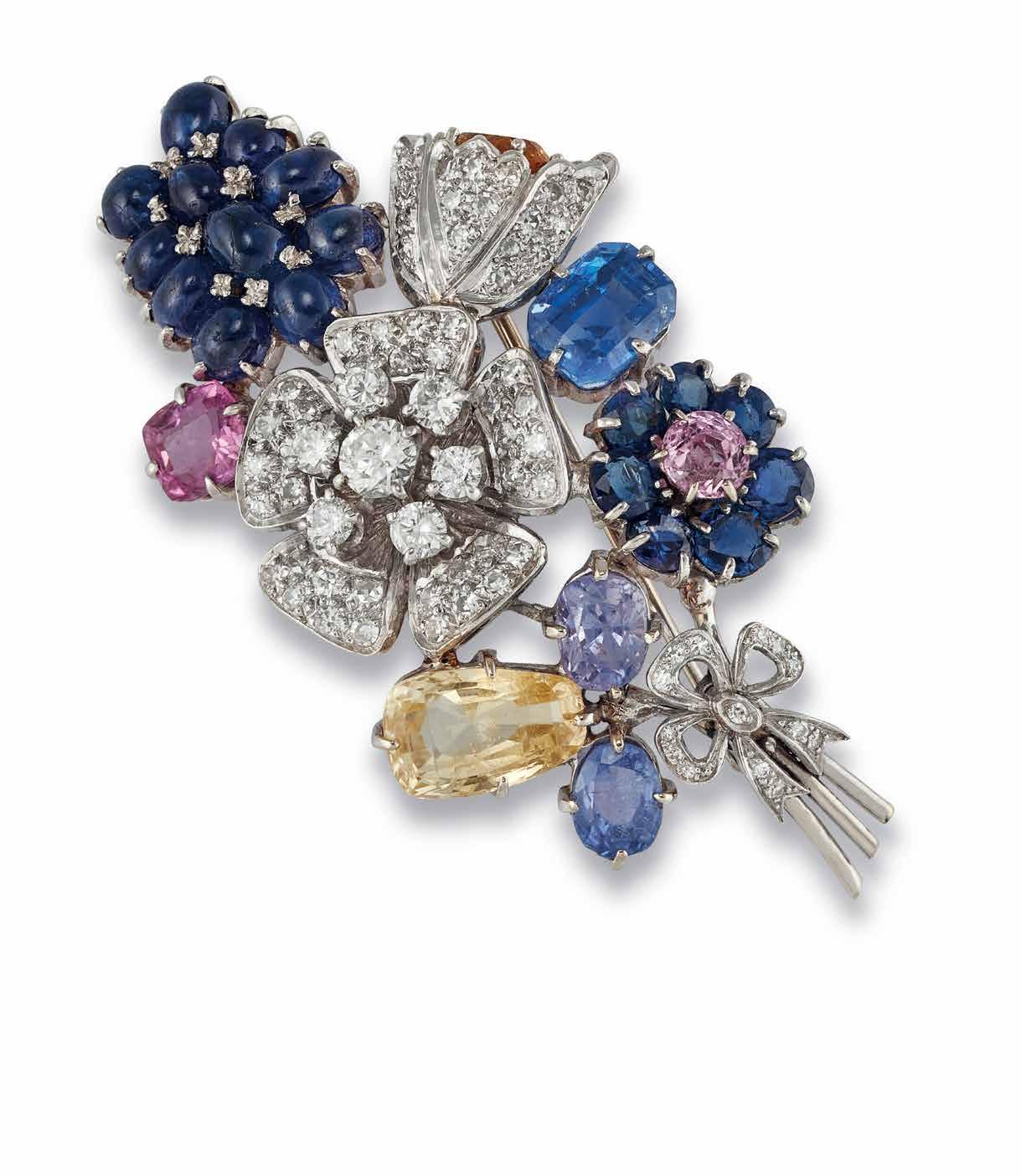 in oro giallo 18kt, impreziosito da turchesi taglio cabochon per ct 60 circa, con fiori realizzati tramite zaffiri taglio rotondo per ct 5.50 circa, rubini taglio rotondo per ct 6 circa e diamanti taglio brillante per ct 1 circa, firmato Bulgari, punzoni 750 e del fabbricante, lungh. cm 20. gr. 116. Corredato di memorandum di acquisto del 17/09/1970