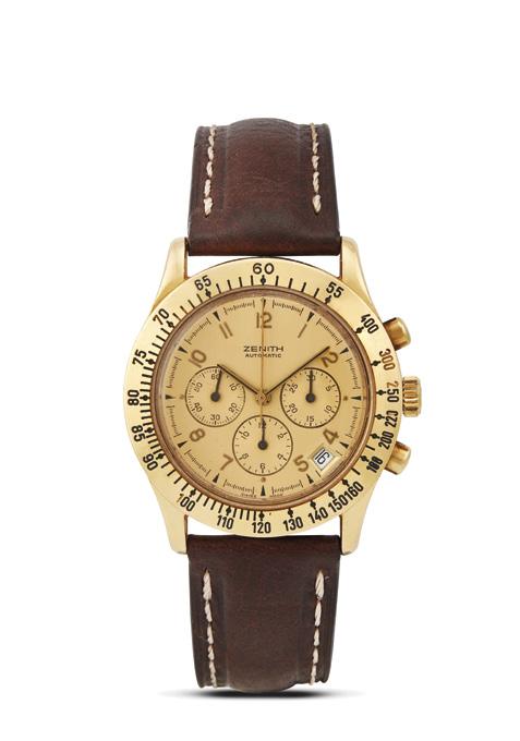 cassa italiana in oro giallo 18kt, fondello a vite marcato internamente CTRD by Zenith, lunetta in oro giallo con scala tachimetrica incisa, tasti a pompa, corona marcata, quadrante champagne, grafica nera, datario tra le ore quattro e le ore cinque, tre contatori, secondi a ore nove, movimento a carica automatica cal 400, cinturino in pelle marrone con fibbia in metallo non originali, vetro plastica, gr. 85. Diam. 40
