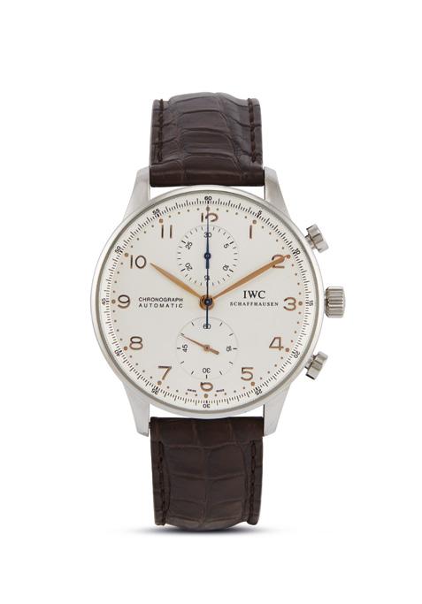cassa in acciaio, fondello serrato a vite, corona marcata, lunetta a scalino con fori, quadrante nero guillochè, grafica bianca, indici e numeri arabi applicati, datario a ore tre, movimento a carica automatica cal C 80110 n. 2625638, bracciale a maglie in acciaio, lungh. interna cm 20 circa, chiusura deployant in acciaio marcata IWC, vetro minerale. Diam. mm 42. Corredato di scatola, garanzia, libretti e secondo cinturino in pelle plastificata di colore nero con fibbia deployant in acciaio originale.