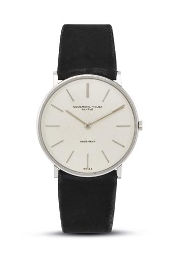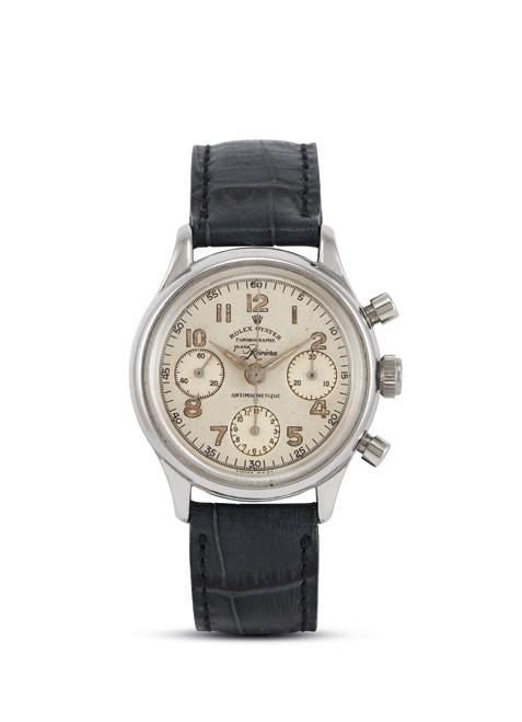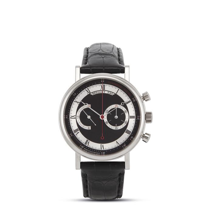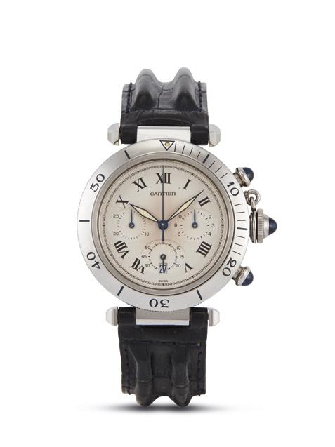 cassa a cerniera in acciaio, ghiera con numeri arabi incisi, quadrante bitonale bianco/argentè, grafica nera blu e rossa, numeri romani a smalto, lancette breguet, movimento a carica automatica cal ETA 2892-2, cinturino in pelle marrone con fibbia in metallo non originali, vetro minerale. Diam. mm 37
