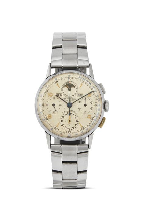 cassa in oro giallo 18kt, fondello a pressione, tasti del crono a pompa, corona marcata, lunetta in oro giallo con scala tachimetrica, quadrante bianco, grafica nera, numeri romani applicati, tre contatori, secondi a ore nove, datario a doppia finestra a ore dodici, calendario completo e fasi lunari, movimento a carica automatica cal Valjoux 7751, bracciale semirigido non originale in oro giallo 18kt a maglie forate, lungh. interna cm 18 circa, chiusura a scomparsa in oro giallo, vetro plastica, gr. 100. Diam. mm 38. Corredato di scatola, controscatola e libretto.