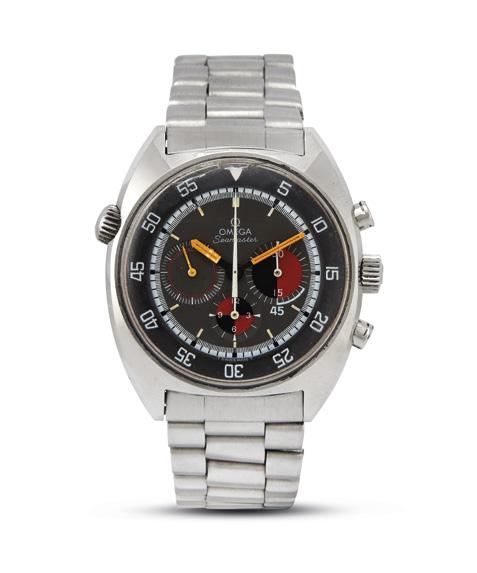 cassa in acciaio, fondello serrato a vite, corona marcata, tasti del crono a pompa, quadrante grigio, lunetta interna girevole con corona a ore dieci, grafica bianca, indici al trizio, tre contatori, due in rosso e nero, secondi a ore nove, movimento a carica manuale cal 861 n. 28088555, bracciale a maglie in acciaio, lungh. interna cm 18 circa, chiusura a scomparsa marcata Omega, vetro plastica (difetti). Diam. mm 40