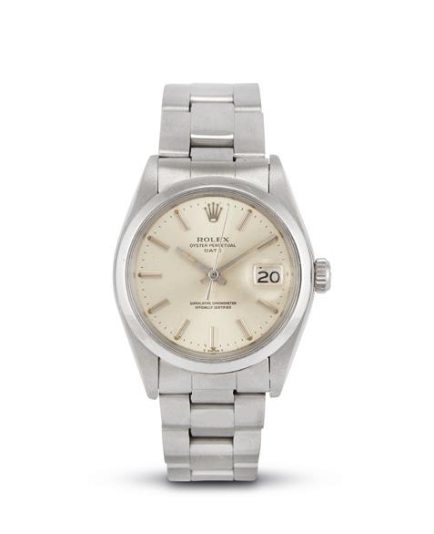 cassa in oro giallo 18kt, fondello serrato a vite, corona marcata, ghiera zigrinata in oro giallo 18kt, quadrante argenté a scalino, grafica nera, indici applicati con trizio, datario a ore tre con lente cyclope, finestra del giorno della settimana a ore dodici in italiano, movimento a carica automatica cal 1556 n. DD975562, cinturino in pelle marrone non originale, fibbia in oro giallo 18kt marcata Rolex, vetro plastica, gr. 62. Diam. mm 35. Corredato di scatola.