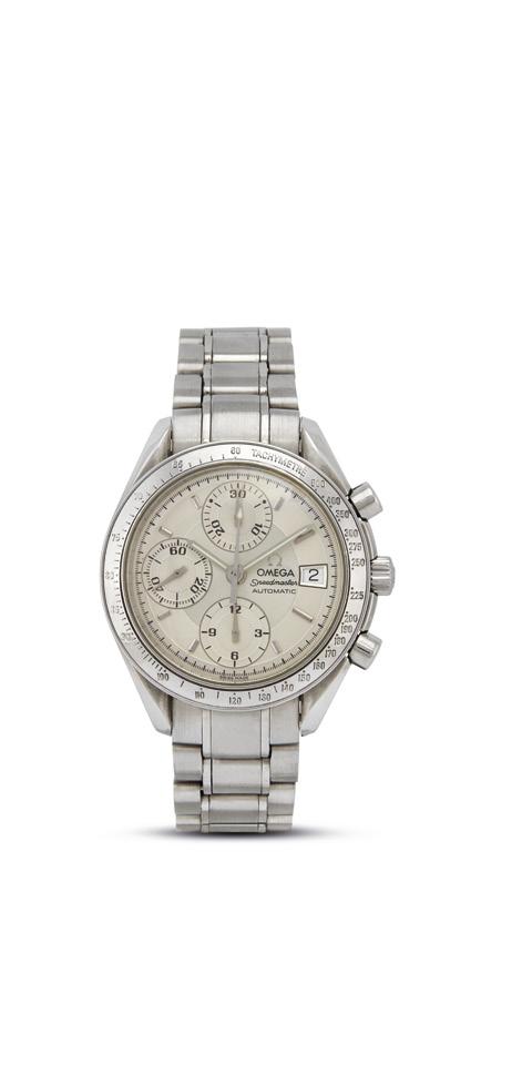 cassa in acciaio, fondello a pressione con logo Speedmaster, tasti del crono a pompa, corona marcata, ghiera con scala tachimetrica, quadrante argentè, grafica nera, tre contatori, secondi a ore nove, datario a ore tre, movimento a carica automatica cal 1152, bracciale a maglie in acciaio, lungh. interna cm 19, chiusura deployant a scomparsa marcata Omega, vetro minerale. Diam. mm 38. Corredato di scatola e libretto.