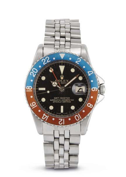 cassa in acciaio, fondello serrato a vite, corona marcata, ghiera in acciaio con inserto “Pepsi”, quadrante nero, grafica bianca, indici bicchierini al trizio, datario a ore tre con lente cyclope, movimento a carica automatica cal 3075 n. 0742315, bracciale oyster a maglie piene in acciaio ref. 78360 finali 580, lungh. interna cm 19 circa, chiusura a scatoletta marcata Rolex, vetro plastica. Diam. mm 40.