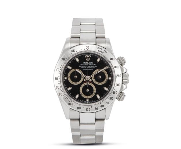 cassa in acciaio, fondello serrato a vite, corona marcata e pulsanti a vite, ghiera in ceramica con scala tachimetrica a 400, quadrante nero, grafica bianca, indici applicati al superluminova, tre contatori, secondi a ore sei, movimento a carica automatica, bracciale oyster a maglie piene satinate e lucide in acciaio, cod. produzione H4Y, lungh. interna cm 18, chiusura a scomparsa in acciaio marcata Rolex, vetro minerale. Diam. mm 40. Corredato di scatola, garanzia, libretto e due maglie aggiuntive.