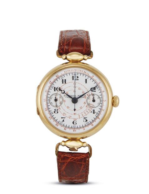 cassa tonneau monoblocco in oro giallo 18kt, fondello serrato con viti, corona marcata, tasti del crono a pompa, quadrante panna, scala tachimetrica sul disco rehaut, grafica nera, numeri romani applicati, tre contatori, datario tra le ore quattro e le ore cinque, calendario completo, fasi lunari, movimento a carica automatica, cinturino in pelle nera lucida con fibbia in metallo non originali, vetro minerale, gr. 90. Diam. mm 40. Corredato di scatola.