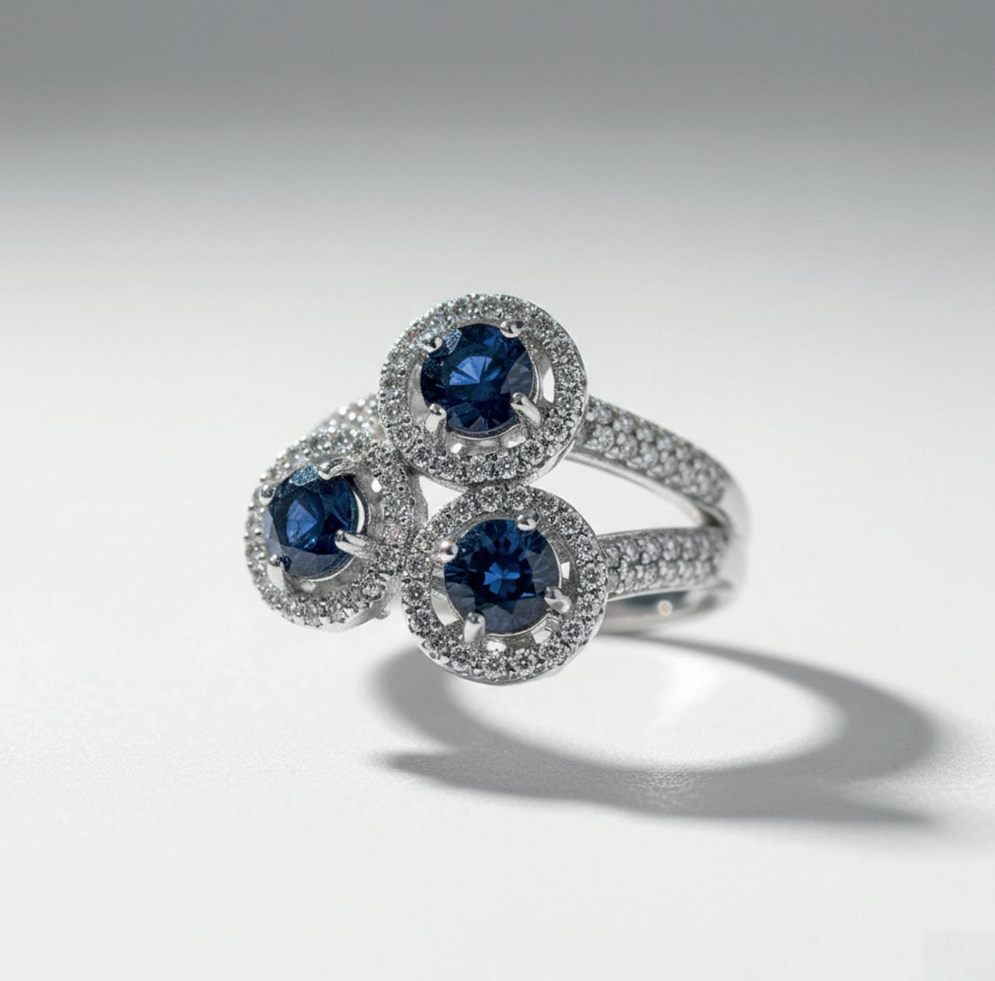ANILLO TRES ZAFIROS NATURALES CON HALO $289.000