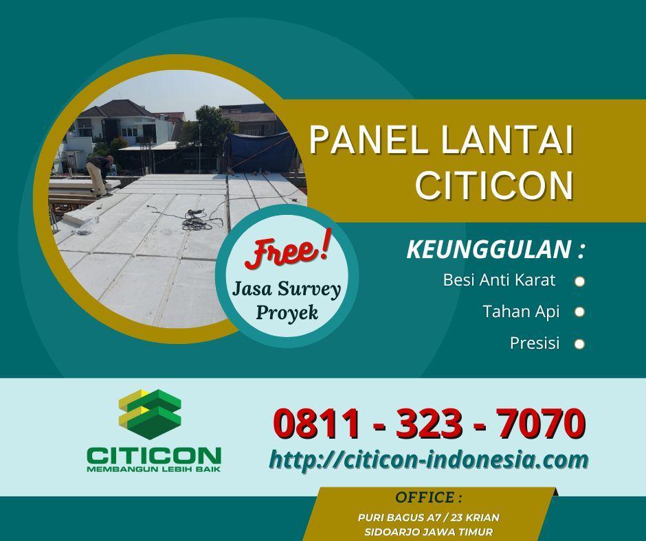 Panel Lantai CITICON adalah sebuah inovasi terbaik dan terbaru di bidang infrastruktur di Indonesia. Di produksi oleh Panel Lantai Citicon di Mojosari Mojokerto Jawa Timur Indonesia. Satu Pabrik dengan Bata Ringan Citicon. Dicetak dalam bentuk lembaran sehingga tidak memerlukan proses pengecoran pada konstruksi lantai rumah dan gedung bertingkat serta memiliki berat yang tiga kali lebih ringan dari cor konvensional sehingga mempercepat aplikasi pembangunan serta presisi pada pemasangannya, menjadikan CITICON Panel Lantai sebagai pilihan cerdas untuk membangun, rumah atau gedung bertingkat. Tersedia berbagai macam ukuran panjang. Mulai panjang 1,5m s/d panjang 3,25m. Sangat fleksible dan bisa disesuaikan dengan bangunan Anda.
