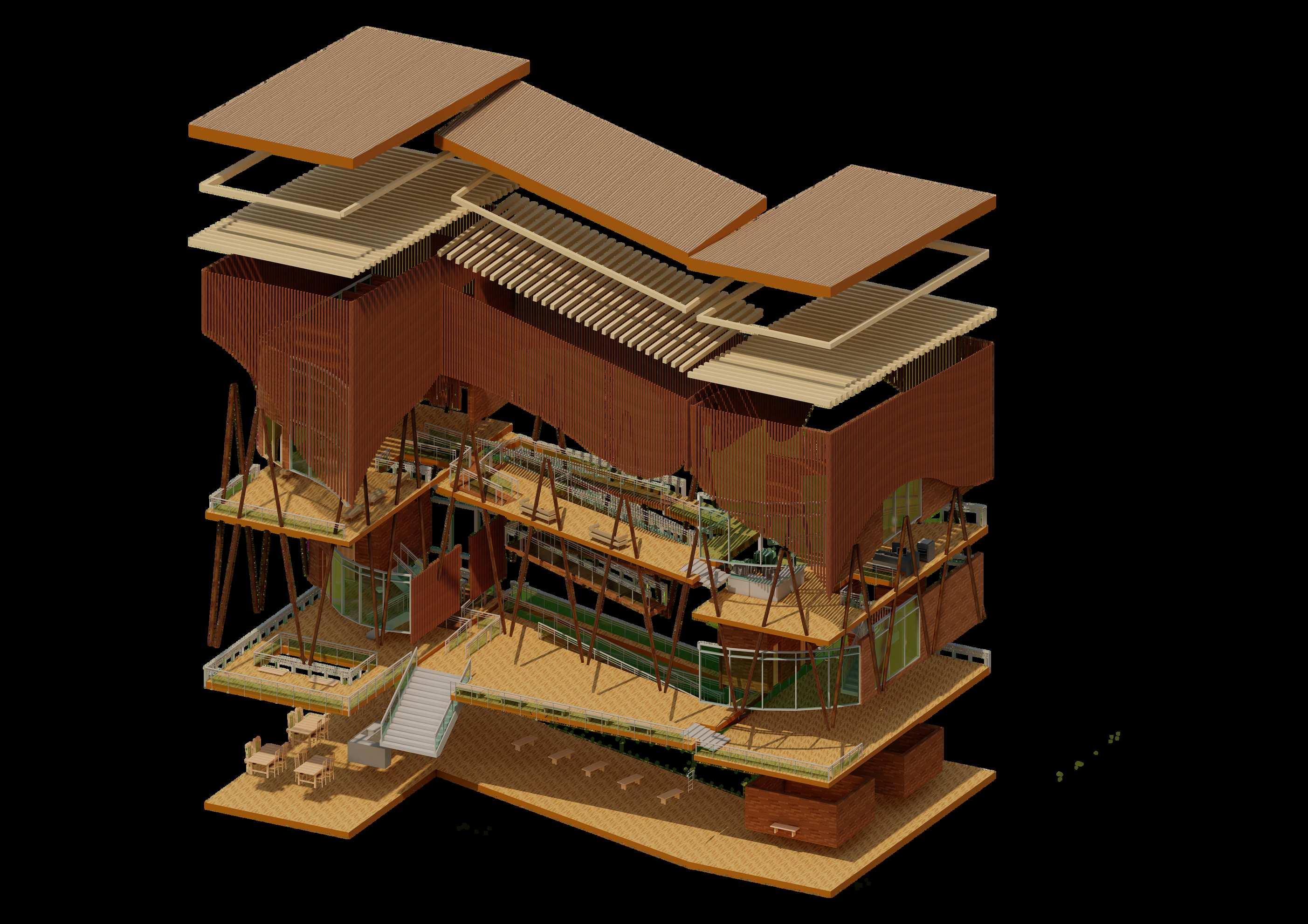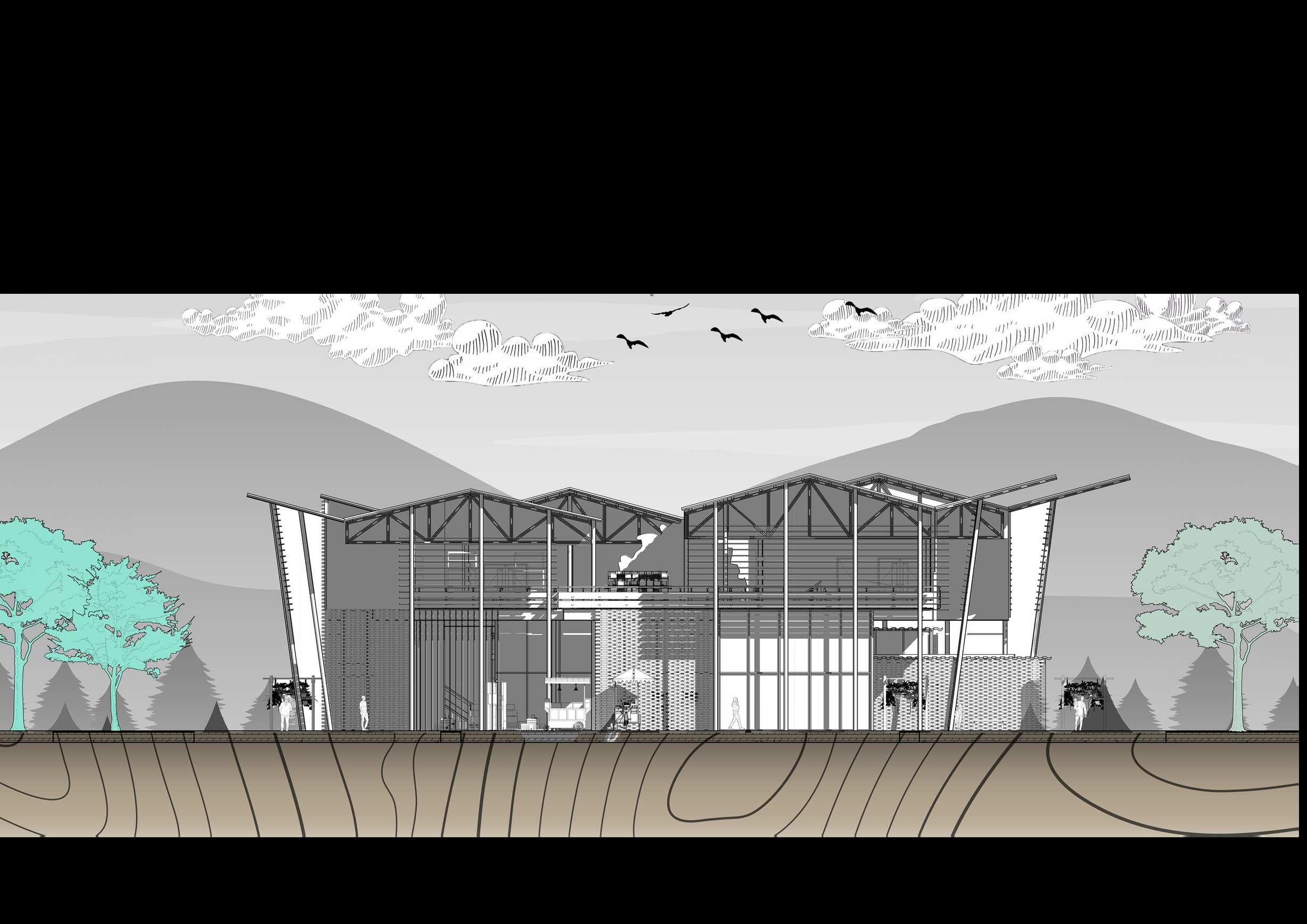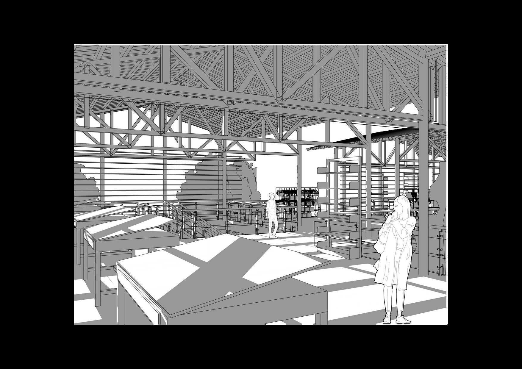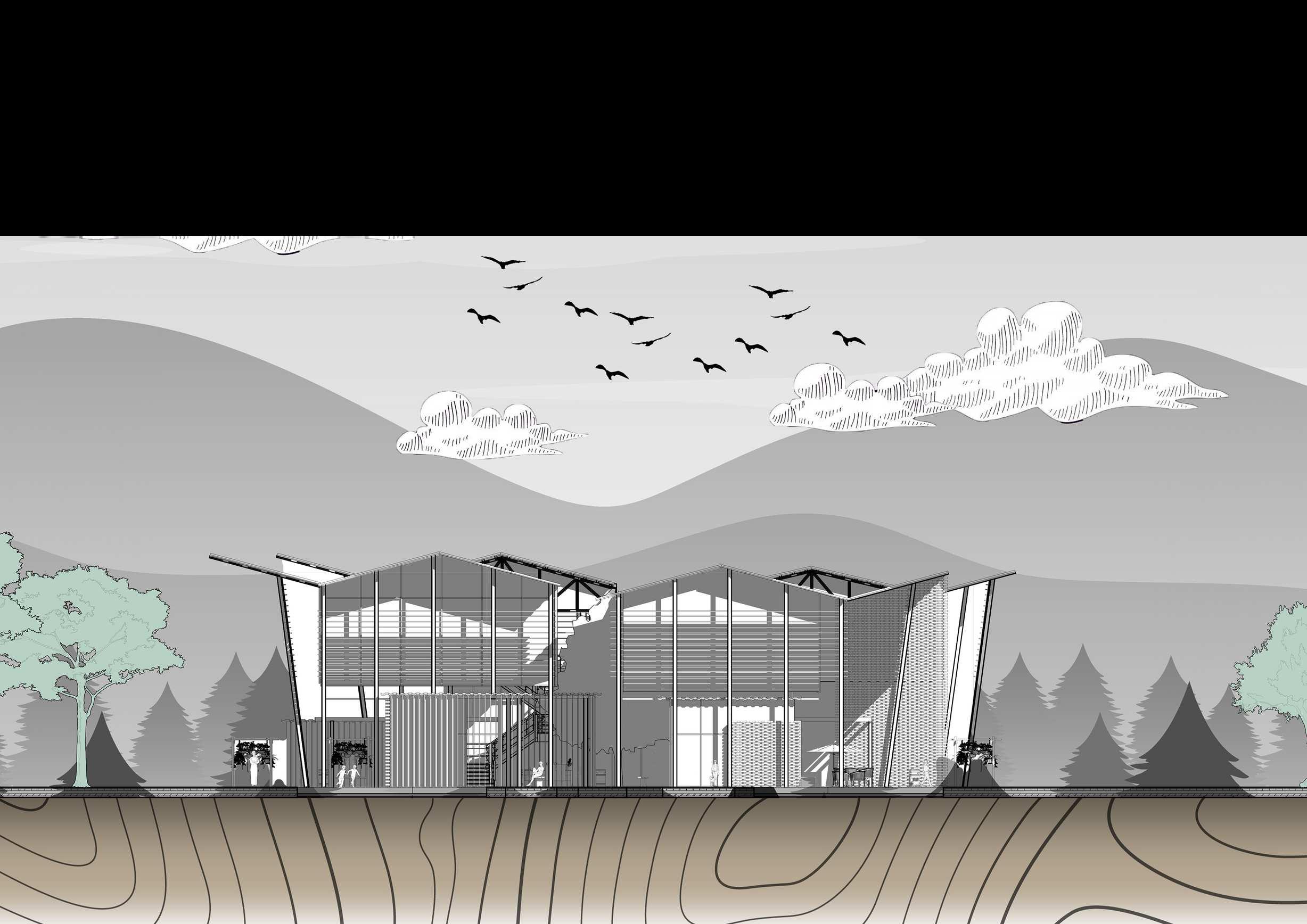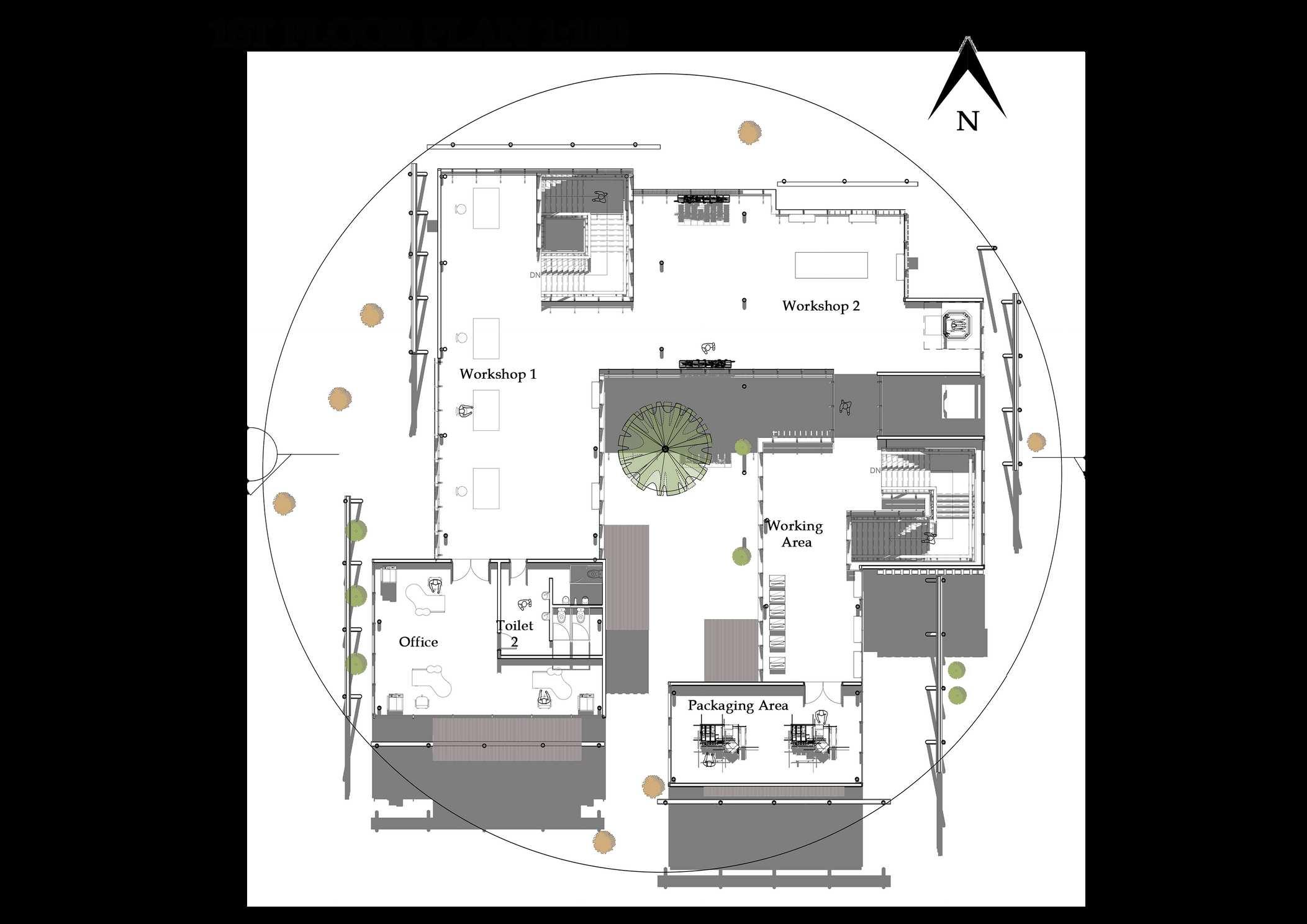 On the second floor, the design shifts to focus on the workspace for employees, including workshops, working areas, and offices. This upper level is intentionally open, promoting a sense of living in harmony with nature. It is designed as a multifunctional space where activities like farming and other nature-oriented practices take place, further reinforcing the building's connection to the environment.