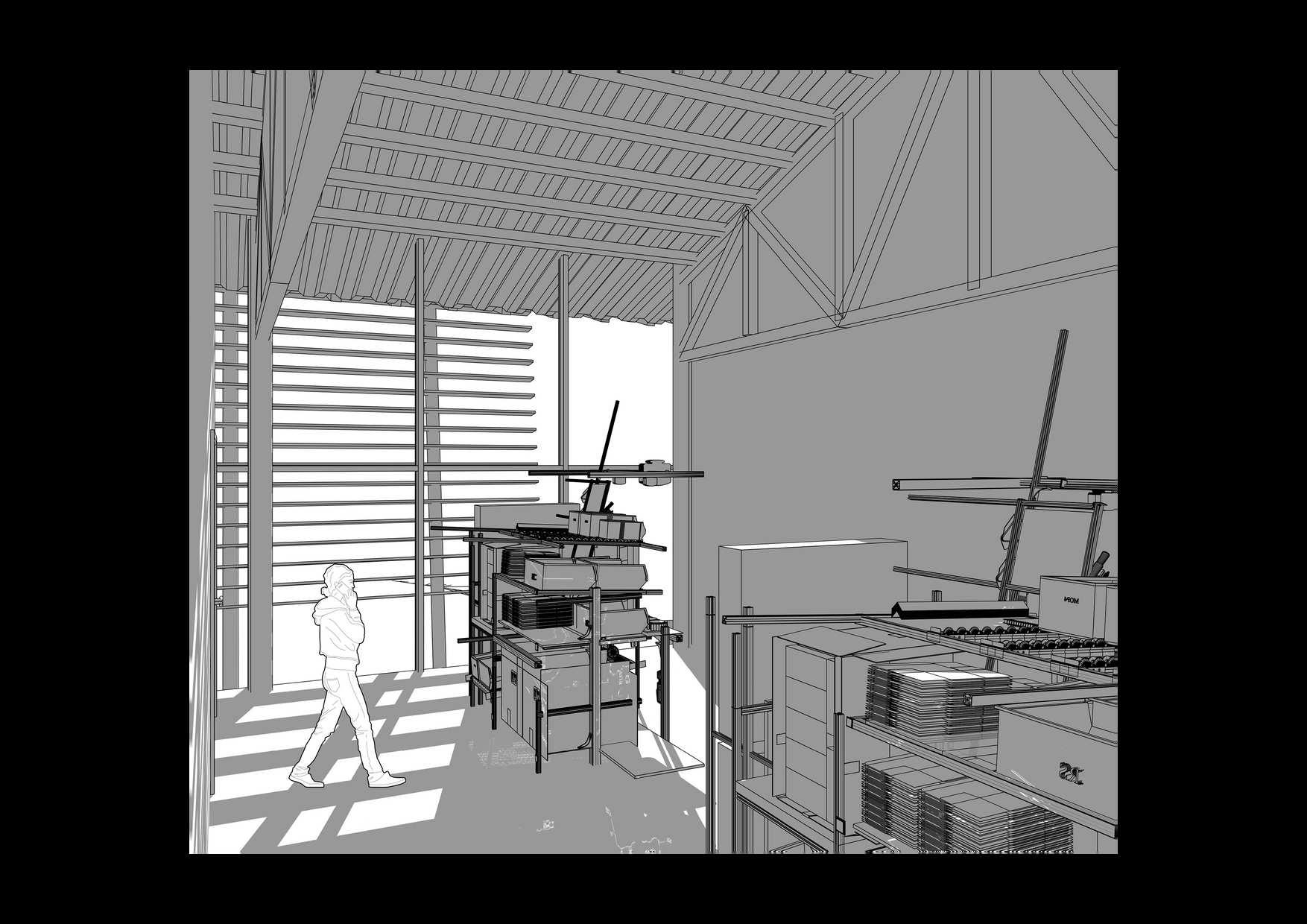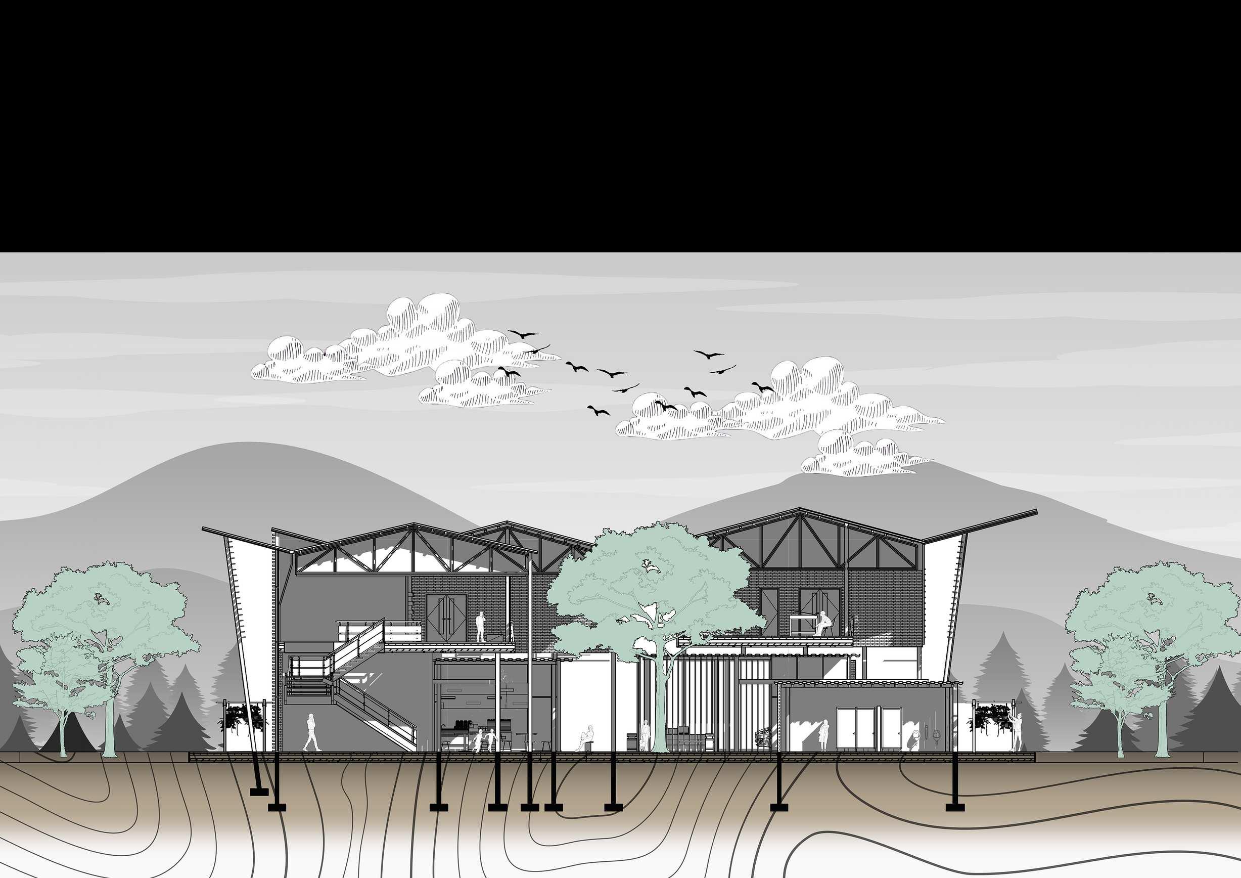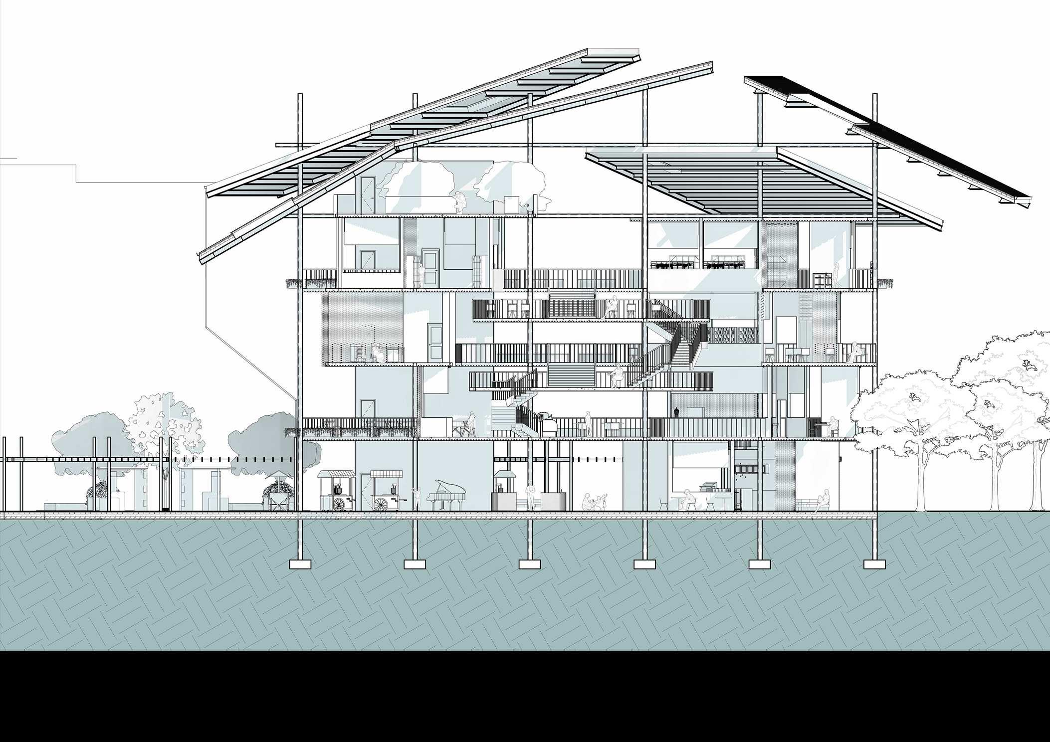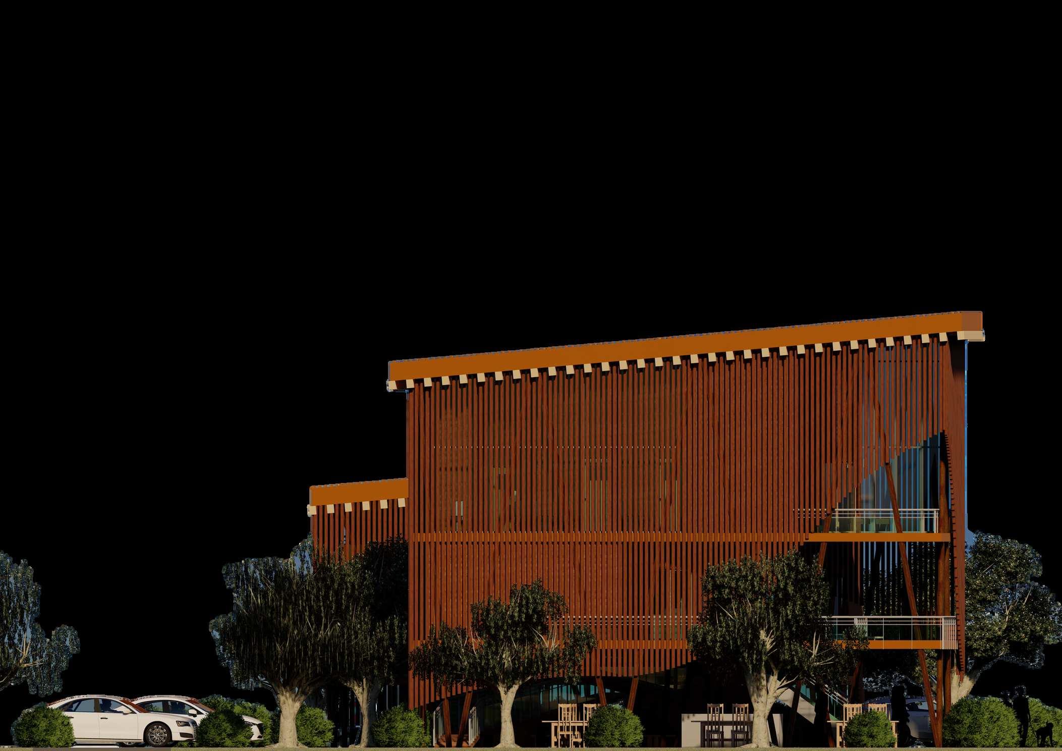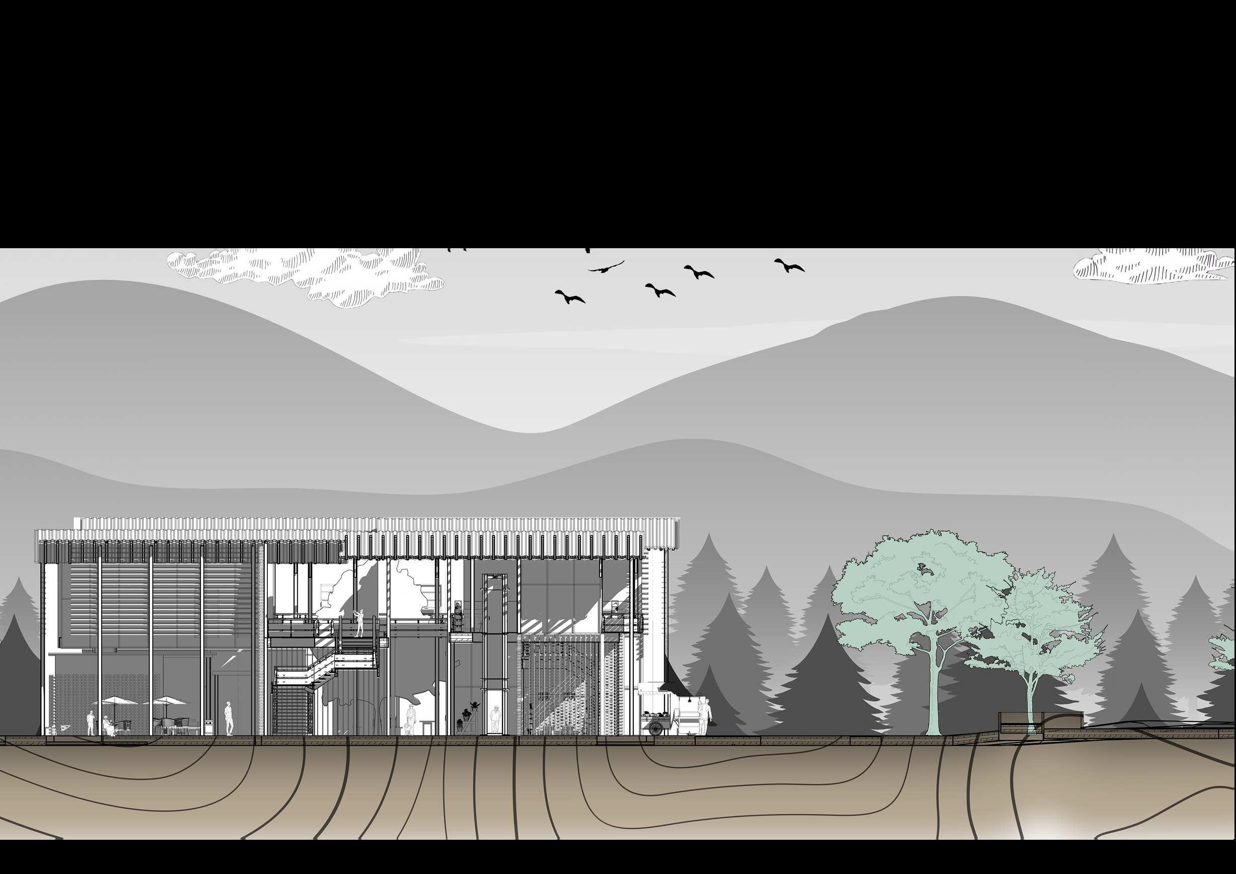 On the second floor, the design shifts to focus on the workspace for employees, including workshops, working areas, and offices. This upper level is intentionally open, promoting a sense of living in harmony with nature. It is designed as a multifunctional space where activities like farming and other nature-oriented practices take place, further reinforcing the building's connection to the environment.