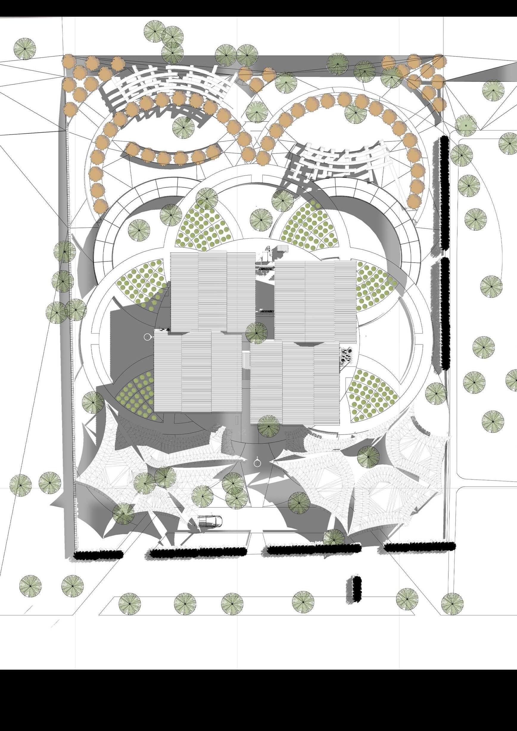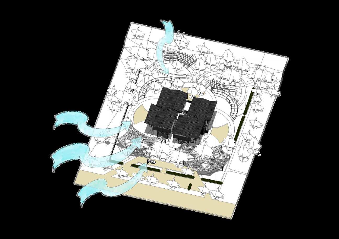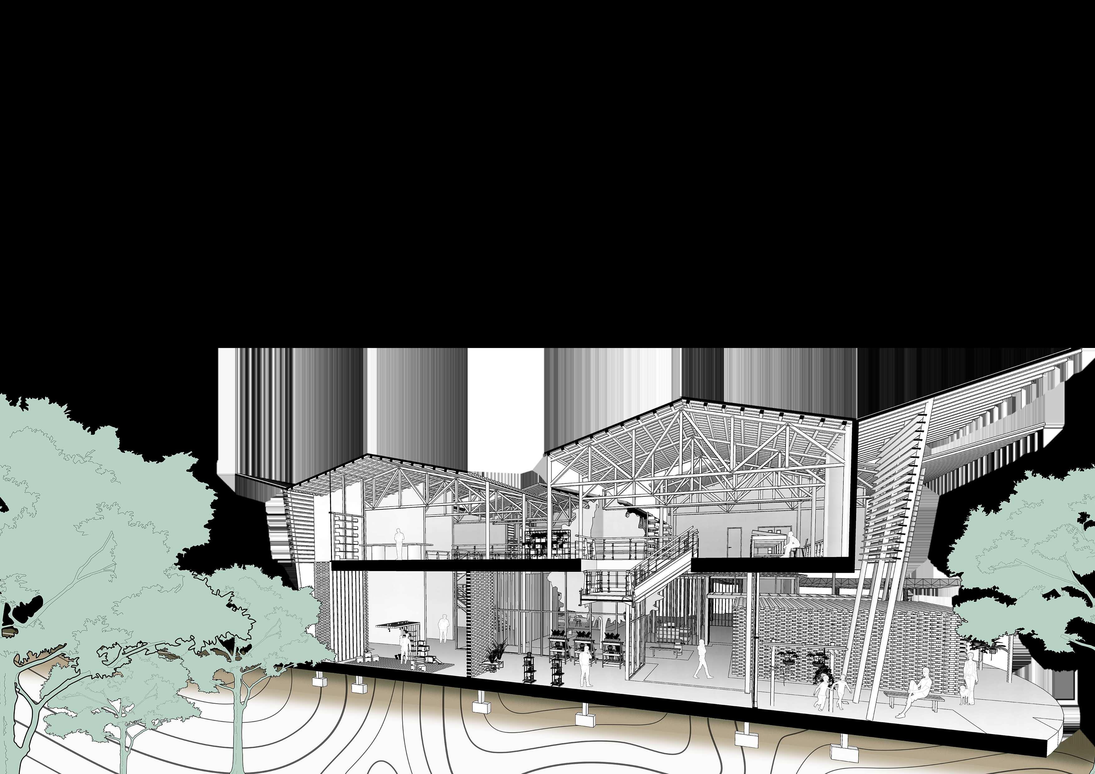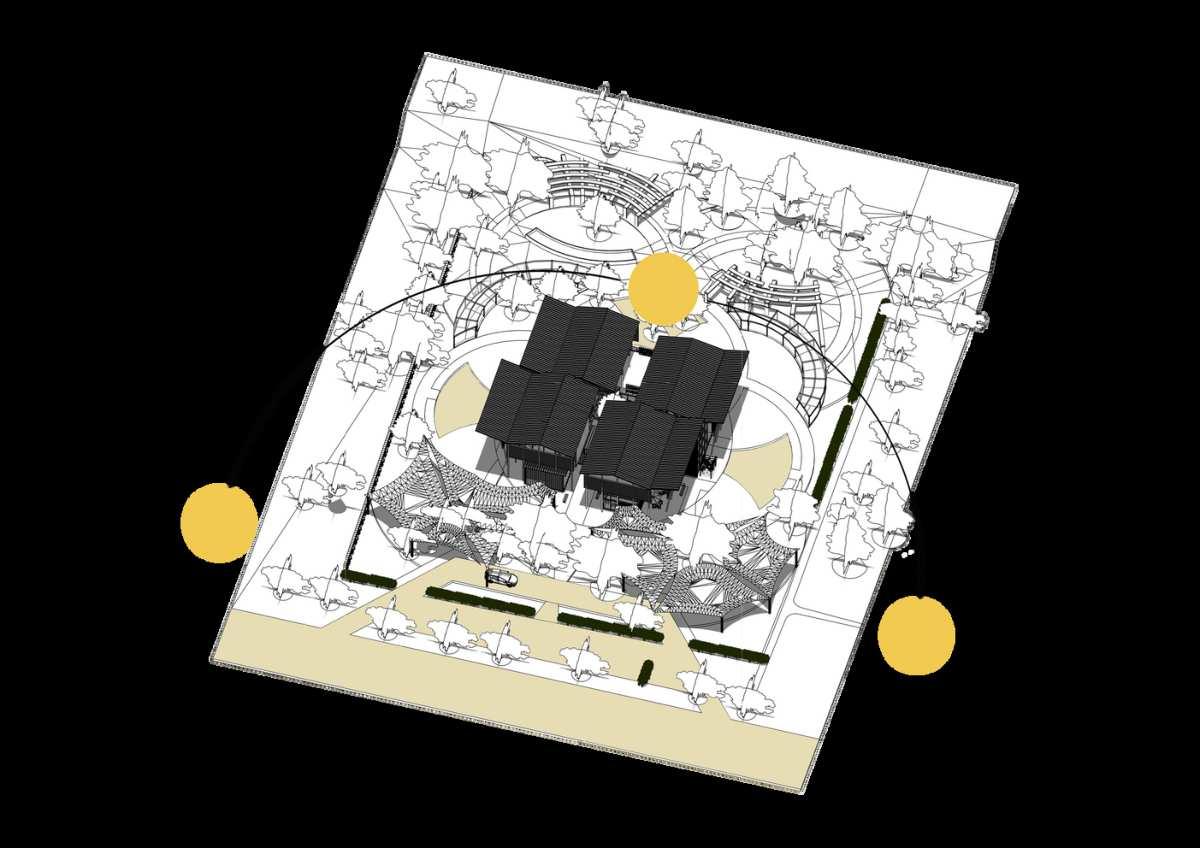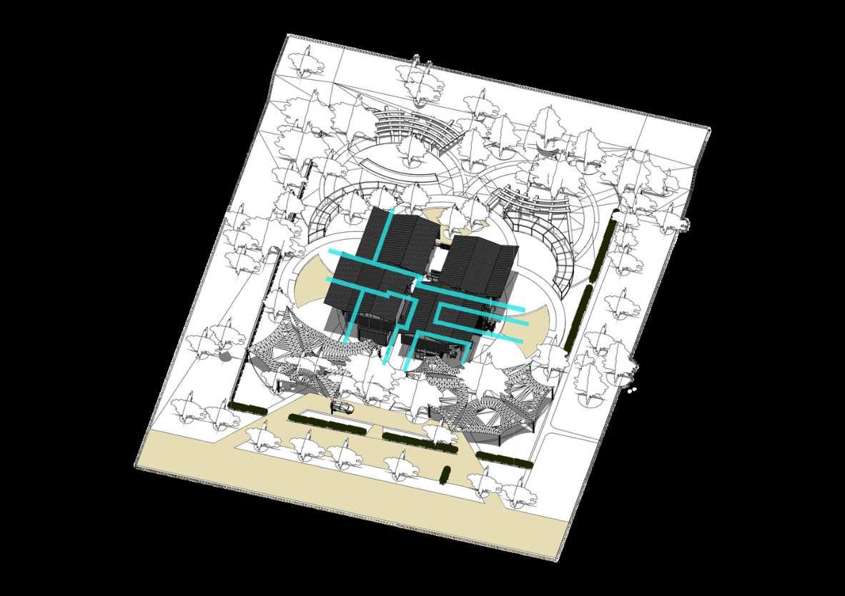 The floor plan adopts a cluster design, with spaces dispersed across the site to create engaging opportunities for exploration. Public areas, as well as points of interest, are strategically positioned on the lower level to attract visitors and encourage interaction. The main event space is centrally located, just behind a courtyard, serving as a visual anchor that draws attention and invites people into the building.