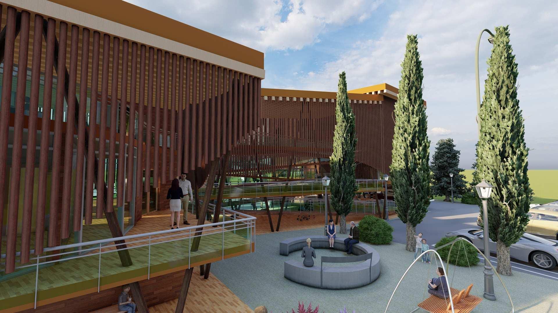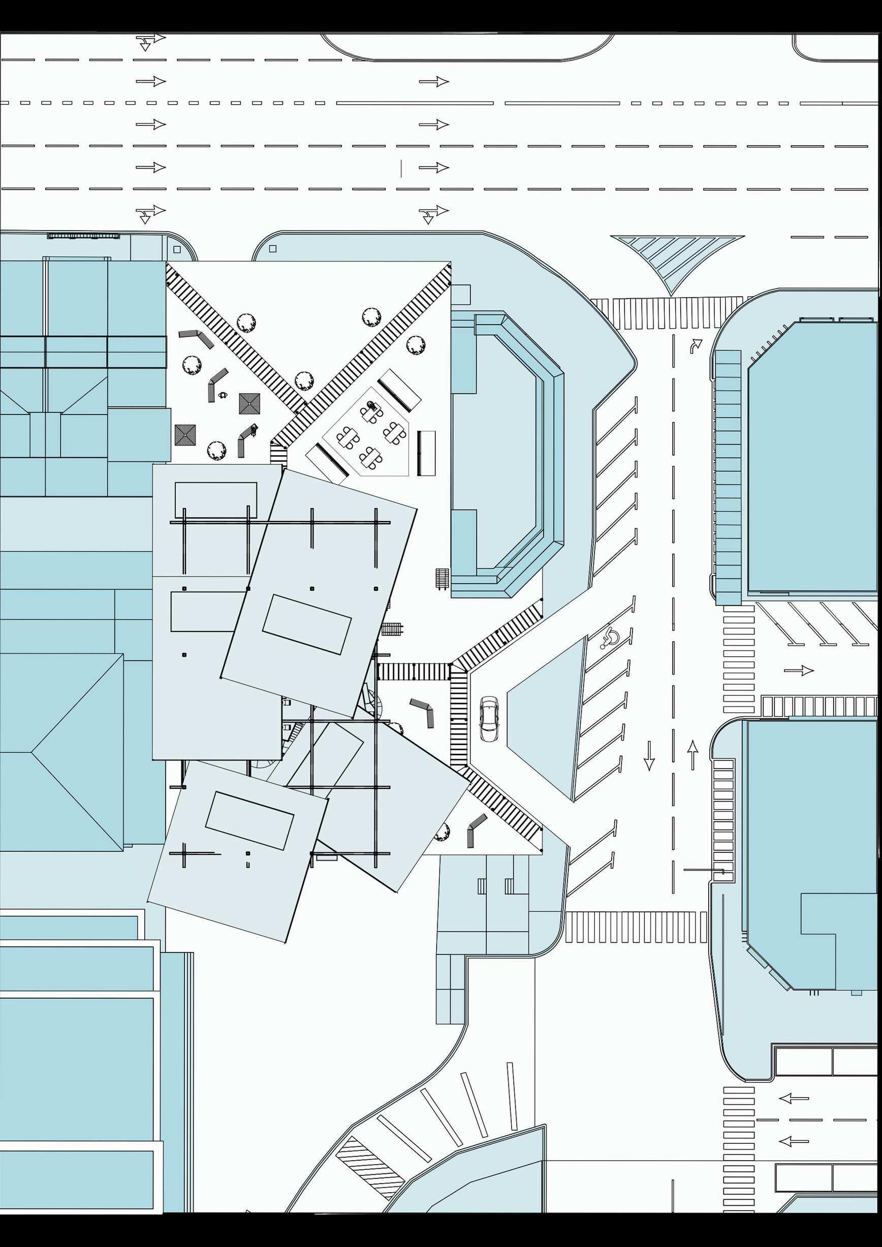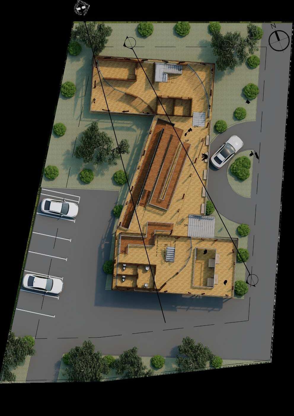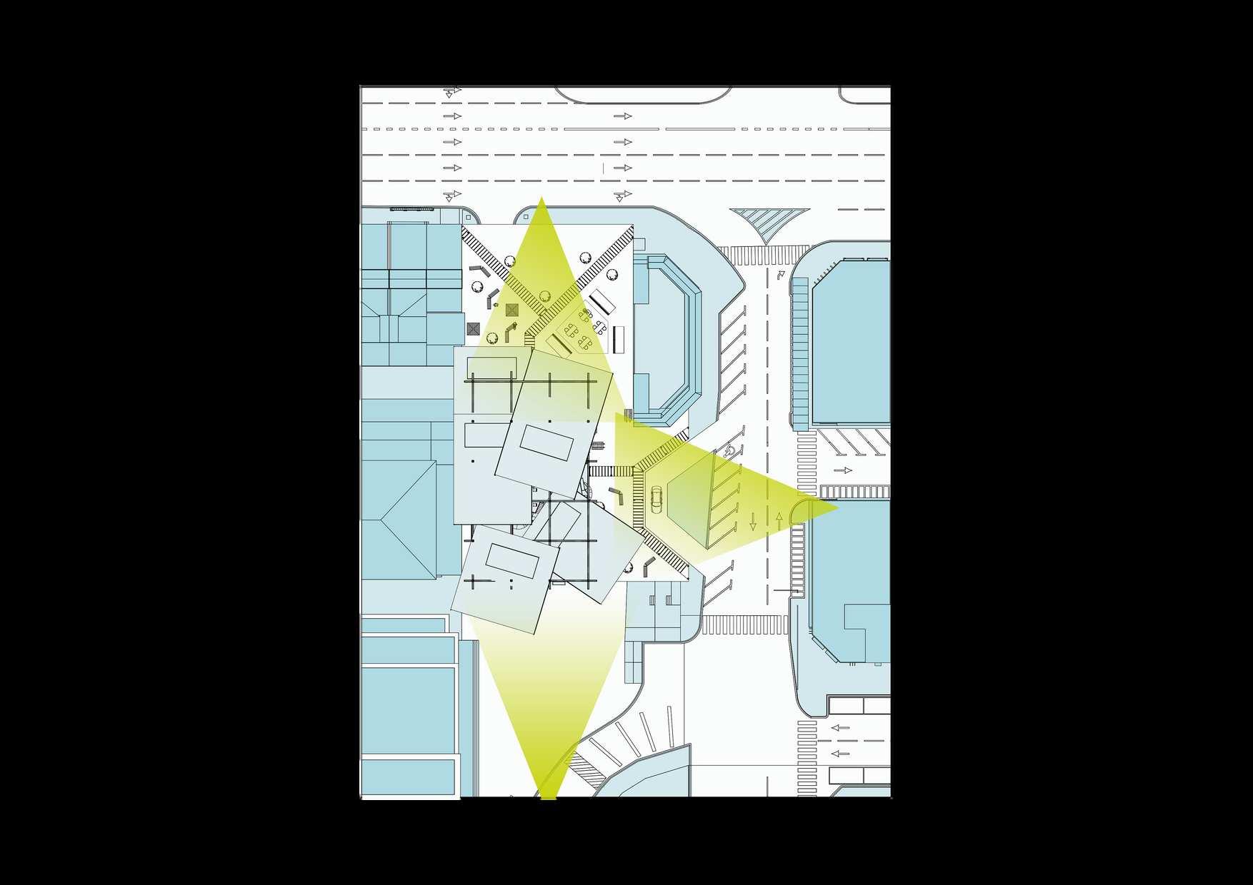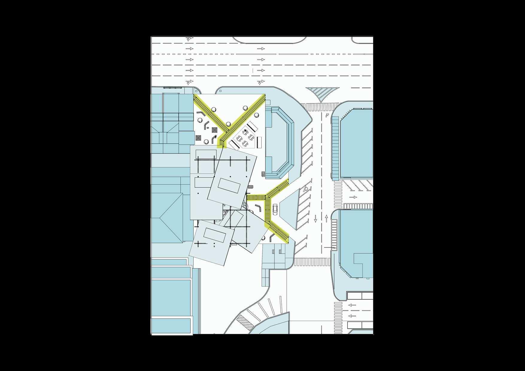 The floor plan adopts a cluster design, with spaces dispersed across the site to create engaging opportunities for exploration. Public areas, as well as points of interest, are strategically positioned on the lower level to attract visitors and encourage interaction. The main event space is centrally located, just behind a courtyard, serving as a visual anchor that draws attention and invites people into the building.