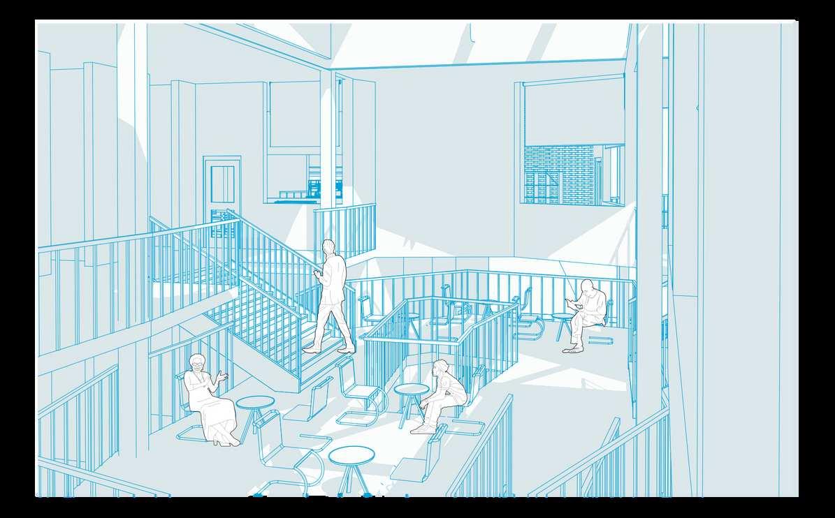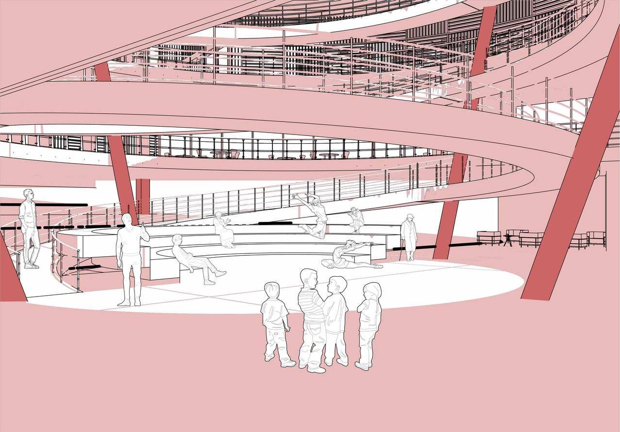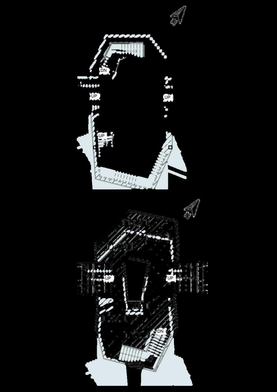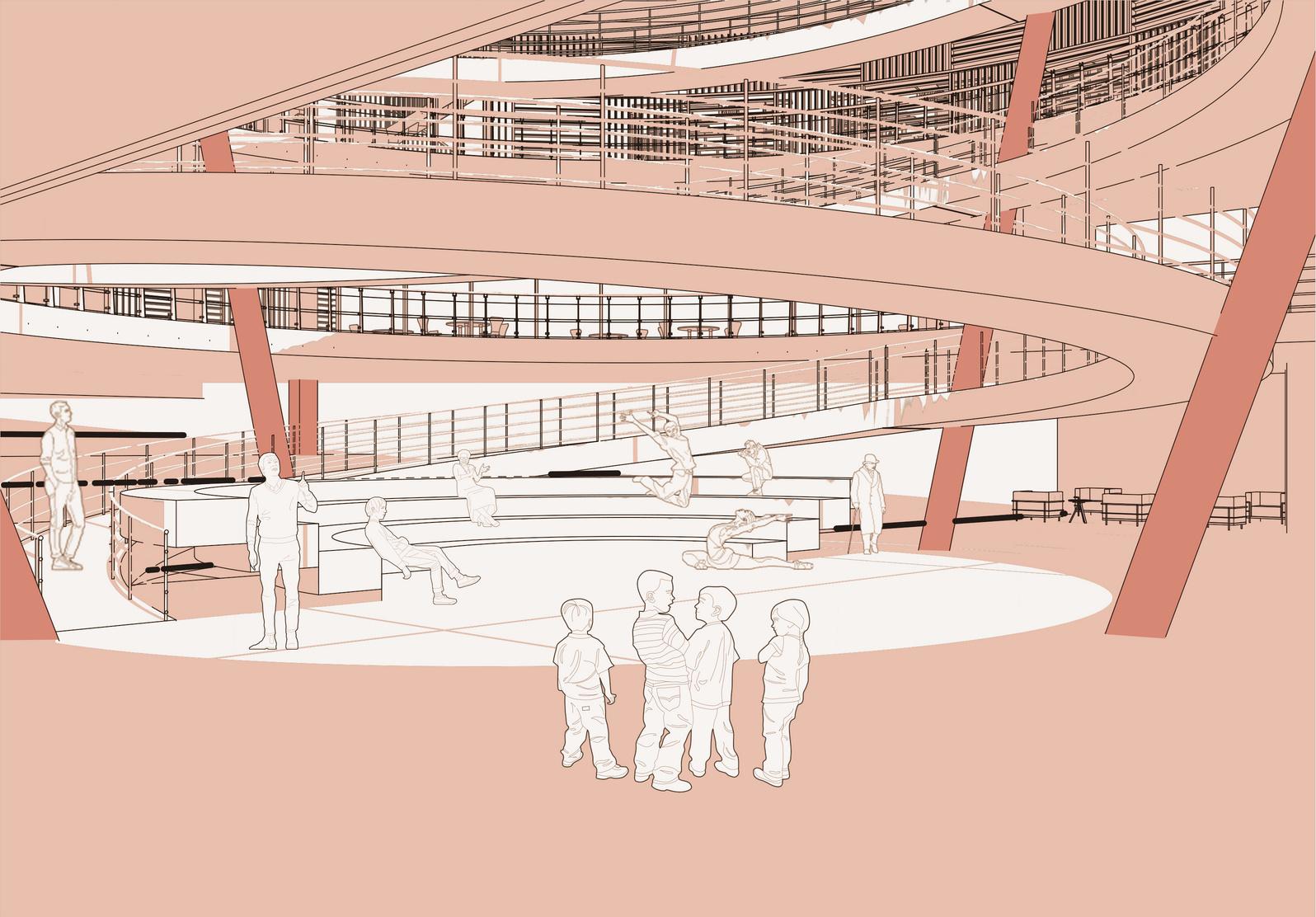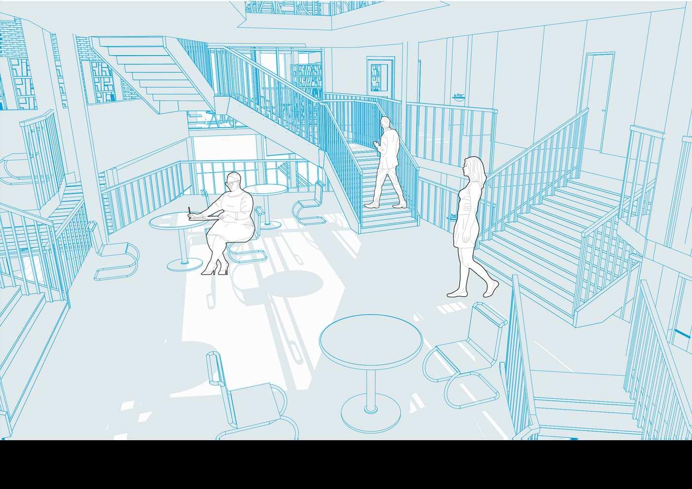 Both located at the center of the void between level 1/2 and level 3/4.These spaces act as a connection between levels as well as a integrate space for different people doing different activities, allow them to have chance to work different things at the same place.