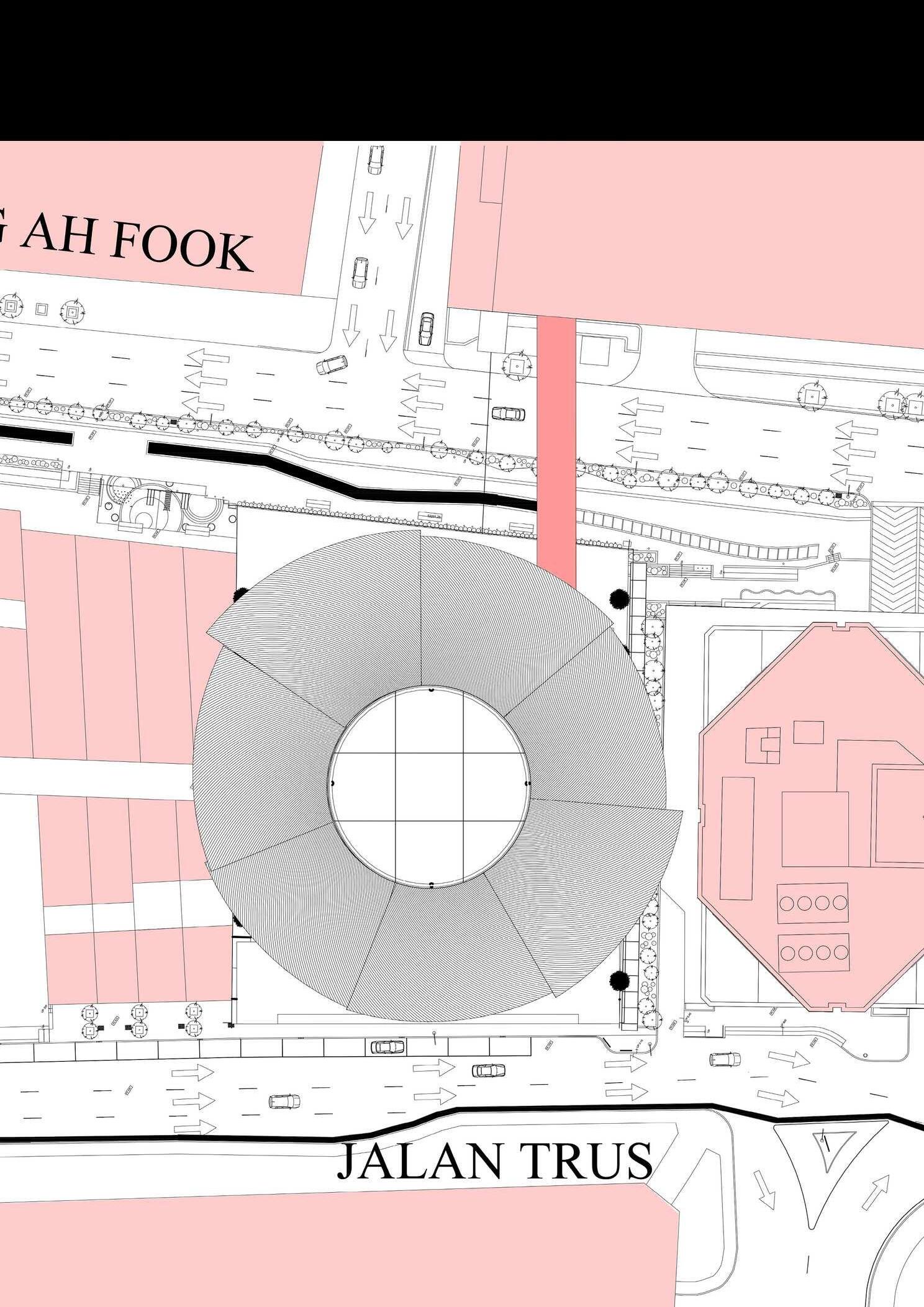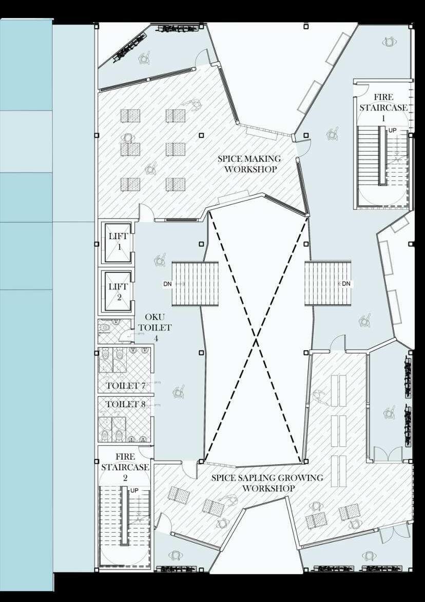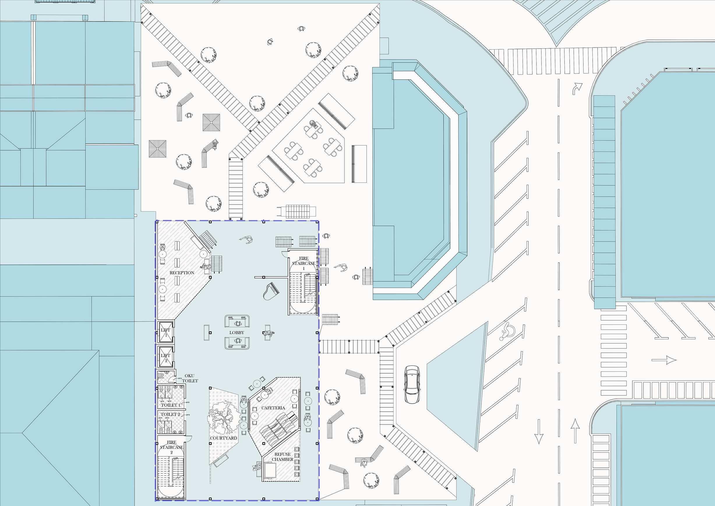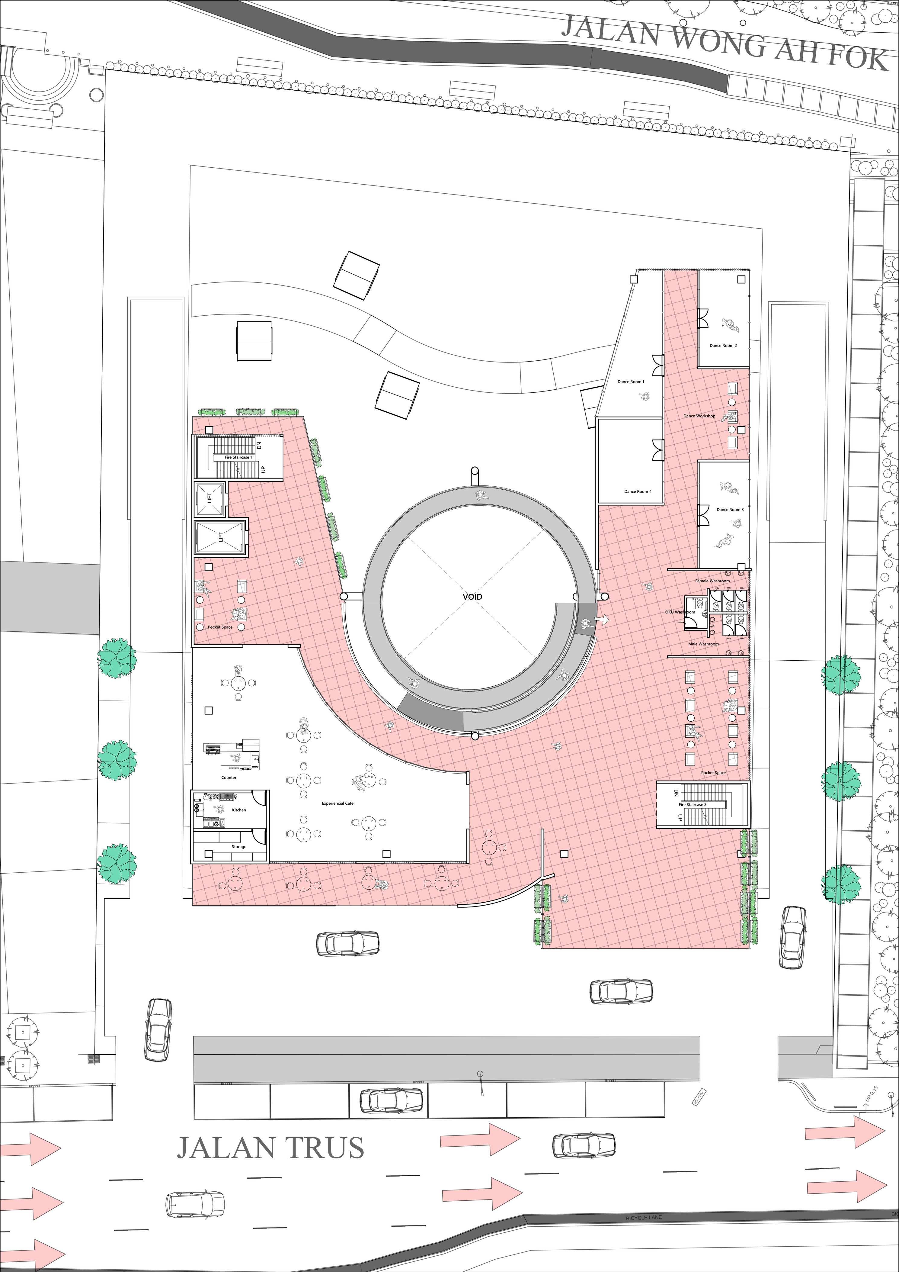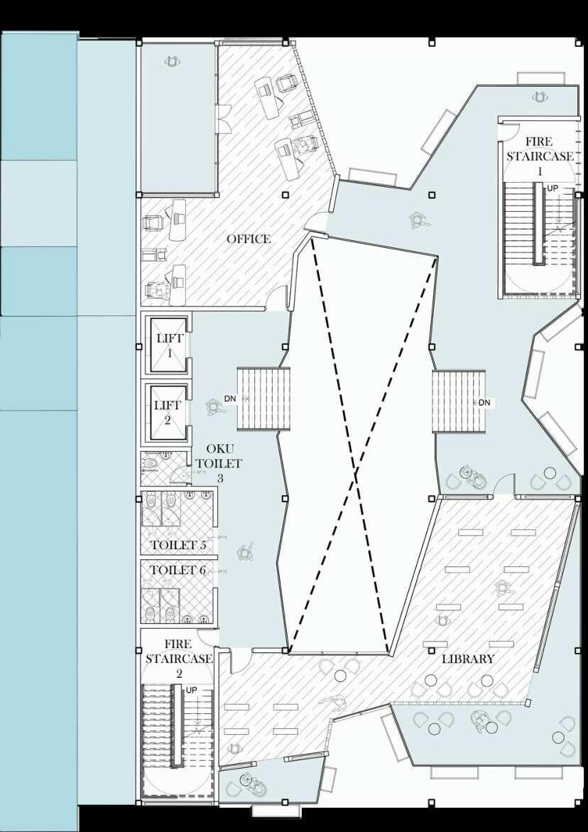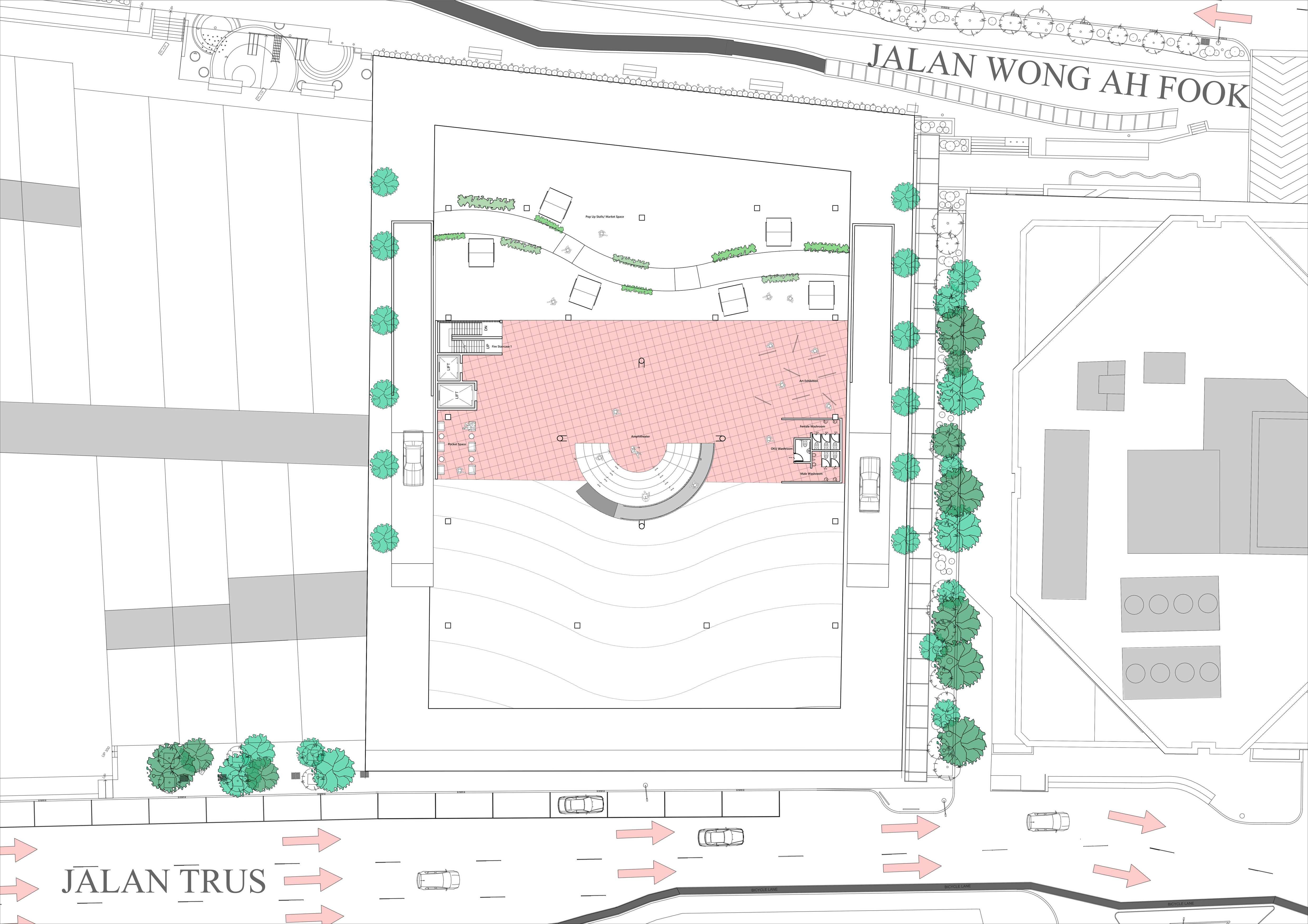 The lower ground floor, which directly faces Jalan Wong Ah Fook, serves as the main entrance from the front of the building. This area is mostly open and permeable to visitors who walk past the building. The two main spaces here include the market spaces at the front of the plan, where stalls sell various items, and an amphitheater at the center of the building, which hosts performances and events. These areas are primarily open, designed to exhibit and engage with visitors passing by.
