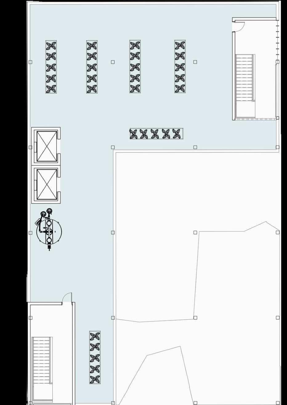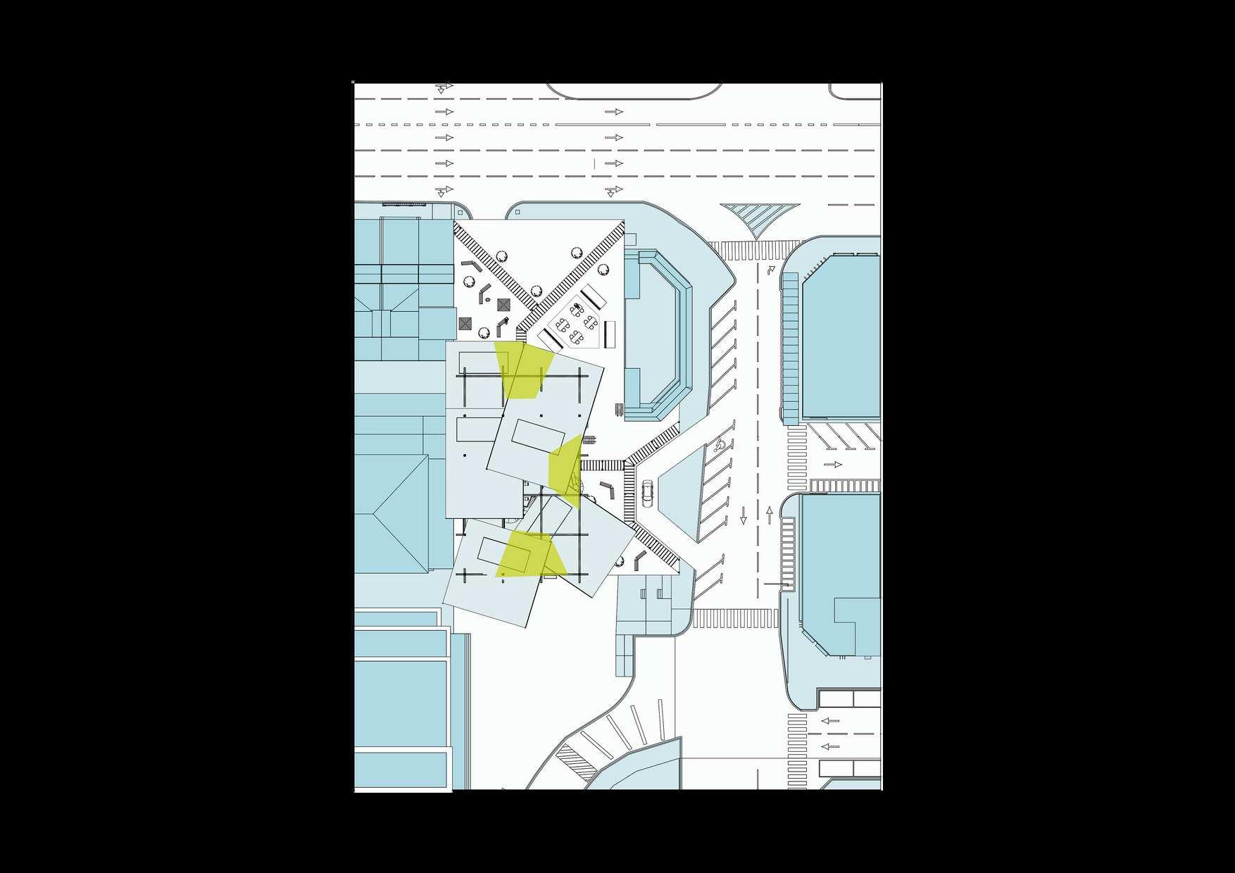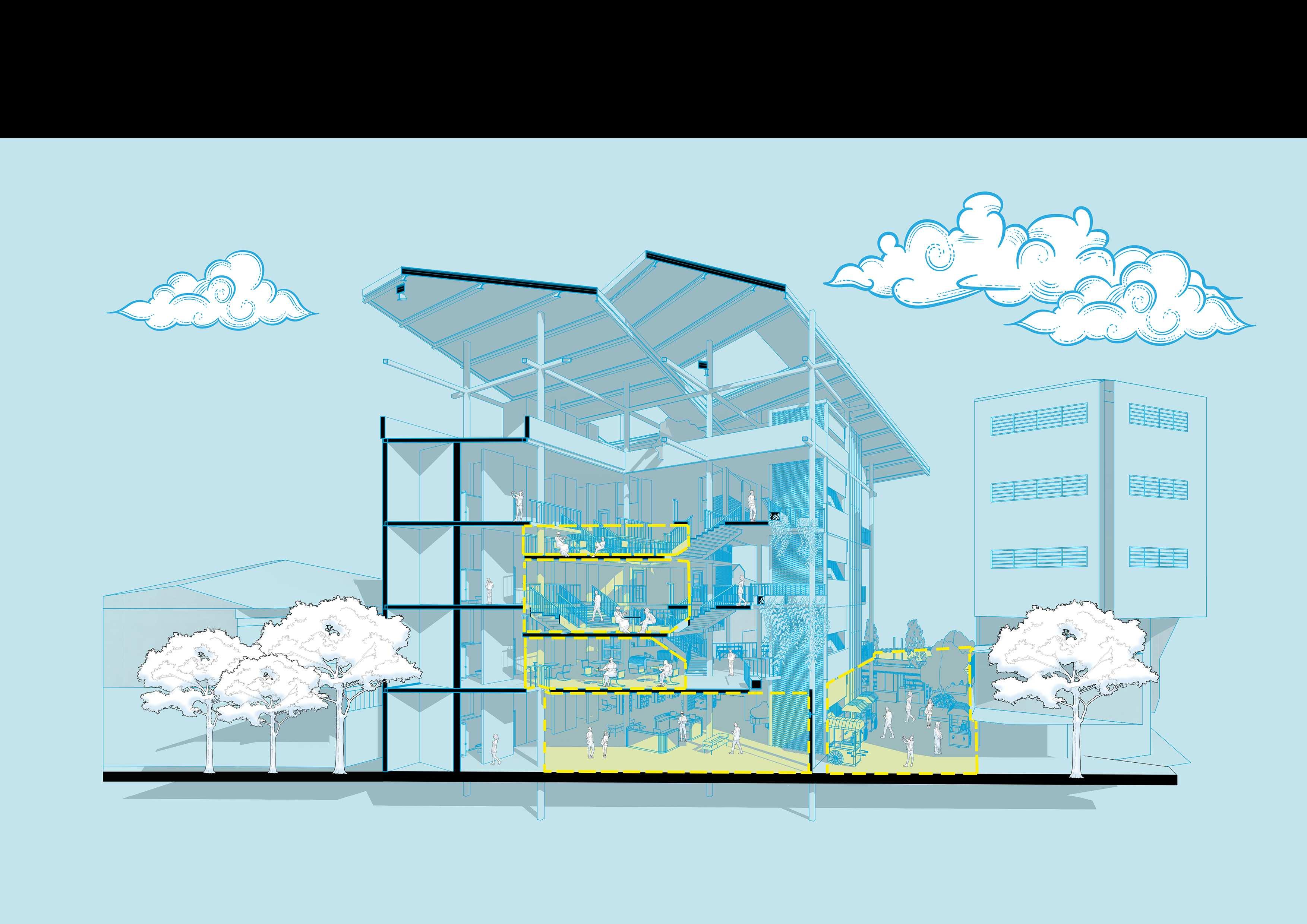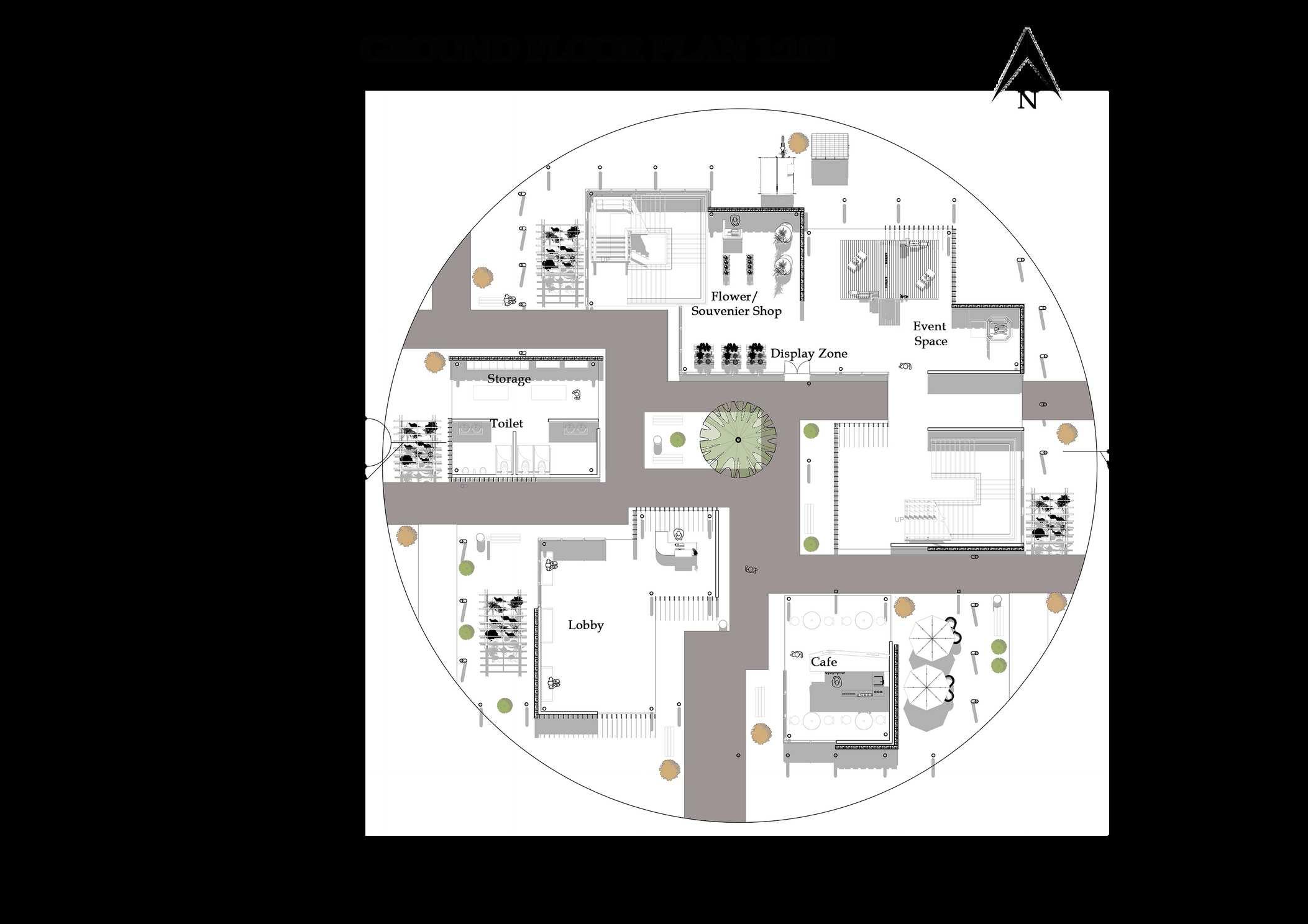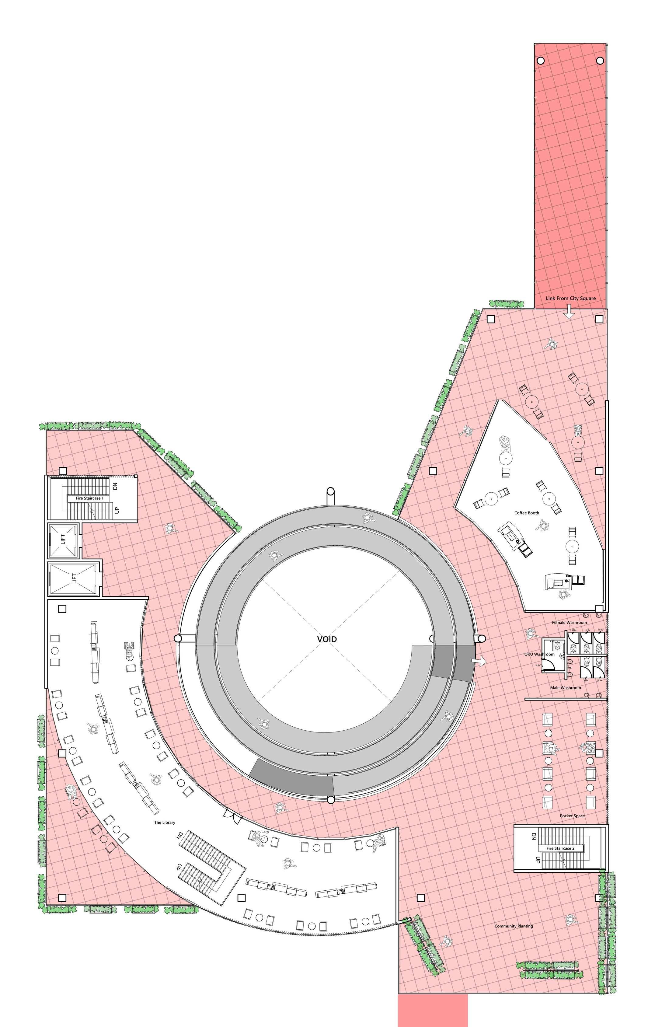 The lower ground floor, which directly faces Jalan Wong Ah Fook, serves as the main entrance from the front of the building. This area is mostly open and permeable to visitors who walk past the building. The two main spaces here include the market spaces at the front of the plan, where stalls sell various items, and an amphitheater at the center of the building, which hosts performances and events. These areas are primarily open, designed to exhibit and engage with visitors passing by.
