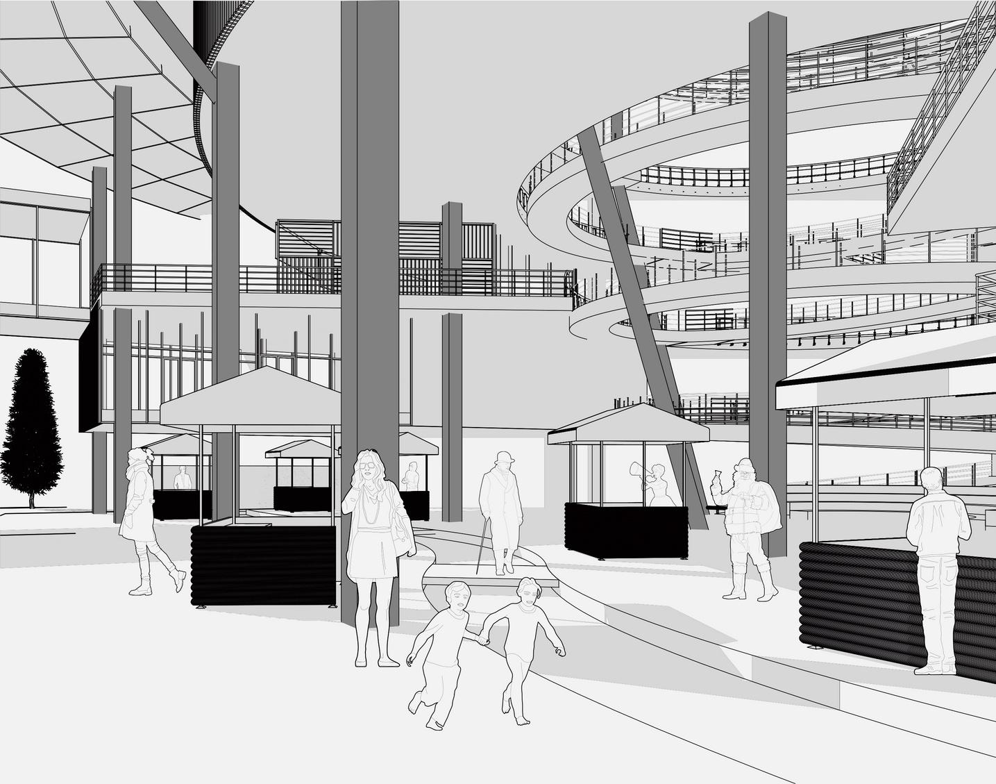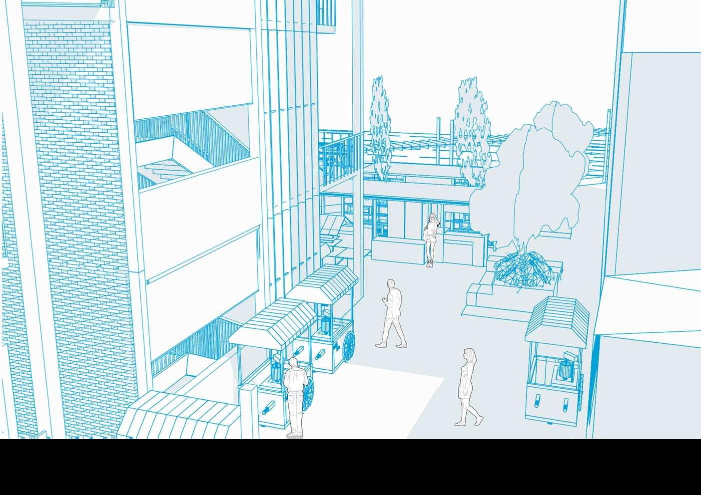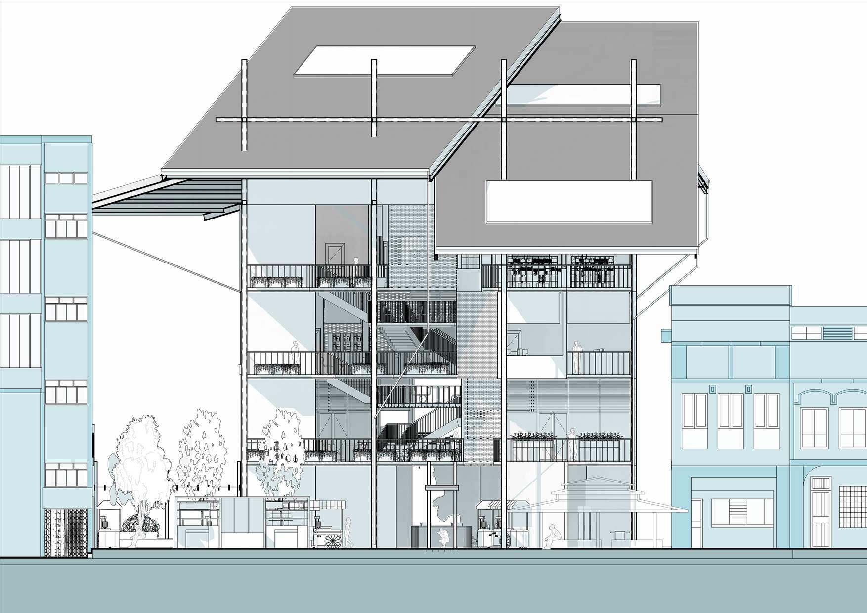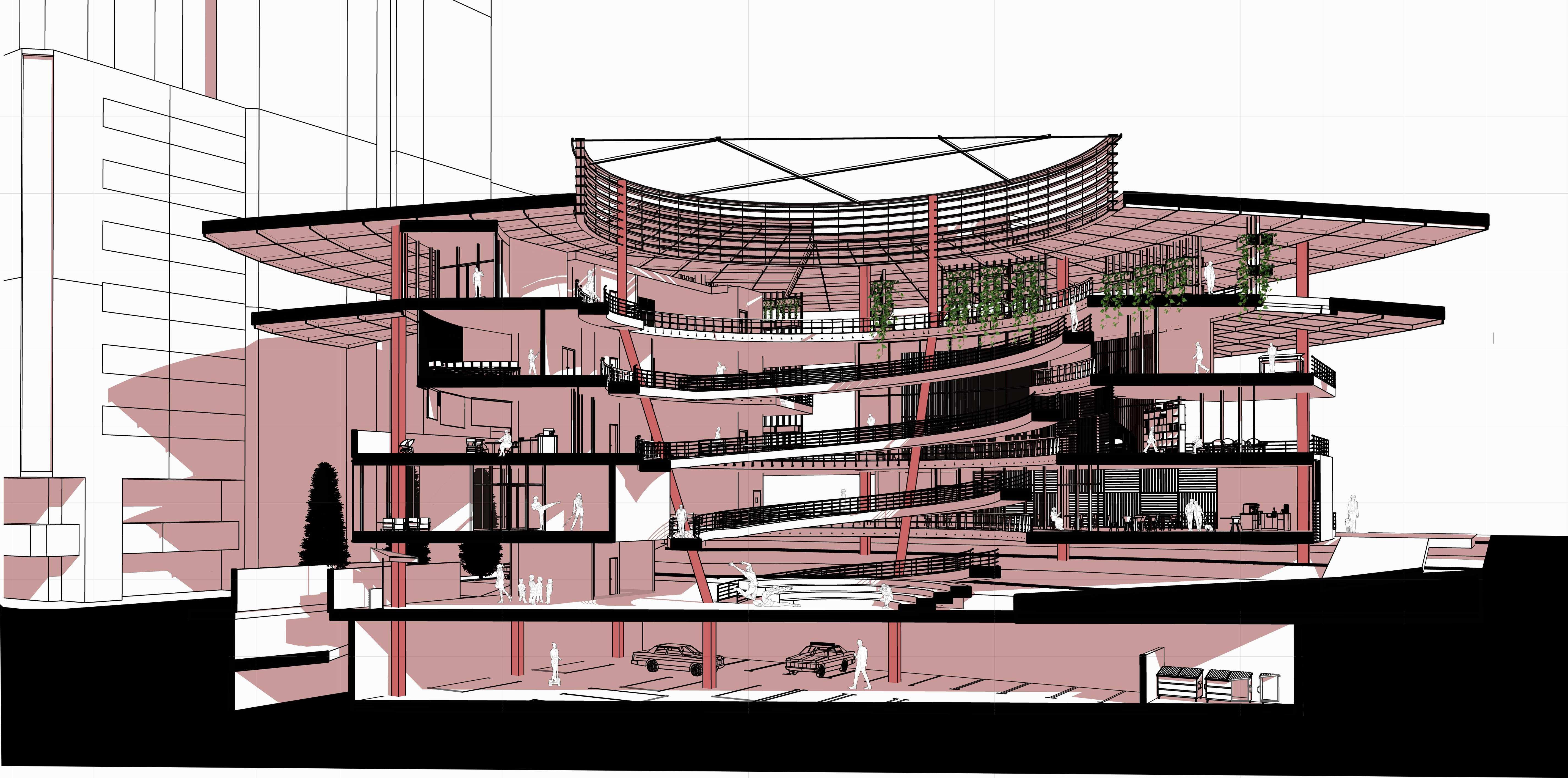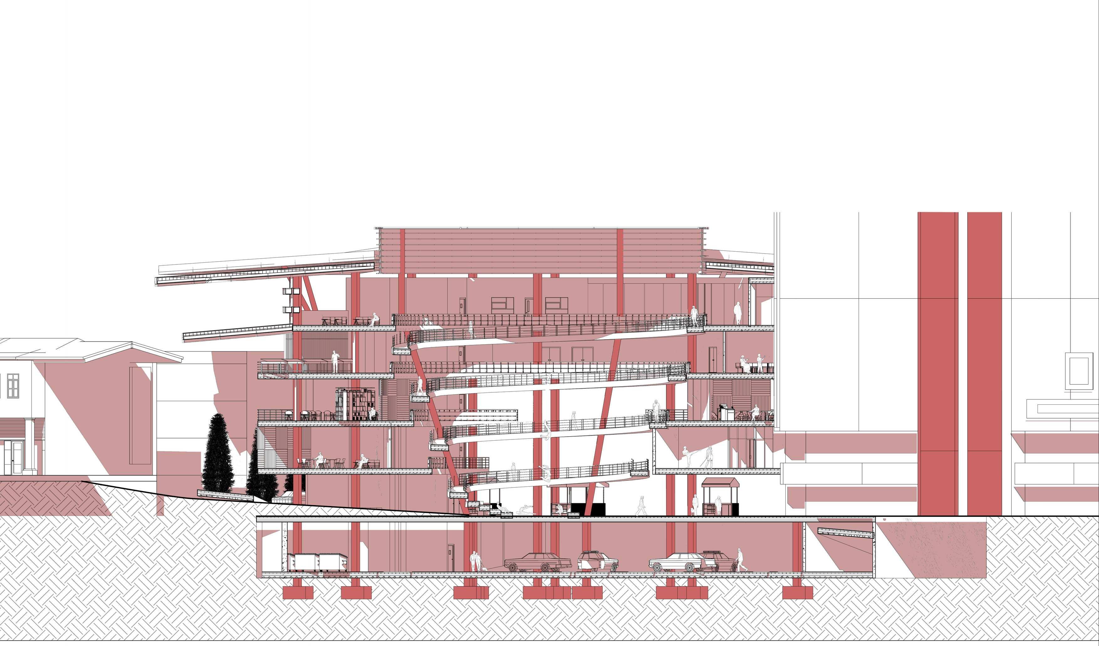 The lower ground floor, which directly faces Jalan Wong Ah Fook, serves as the main entrance from the front of the building. This area is mostly open and permeable to visitors who walk past the building. The two main spaces here include the market spaces at the front of the plan, where stalls sell various items, and an amphitheater at the center of the building, which hosts performances and events. These areas are primarily open, designed to exhibit and engage with visitors passing by.